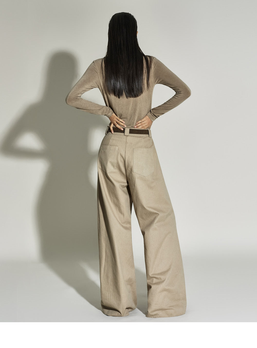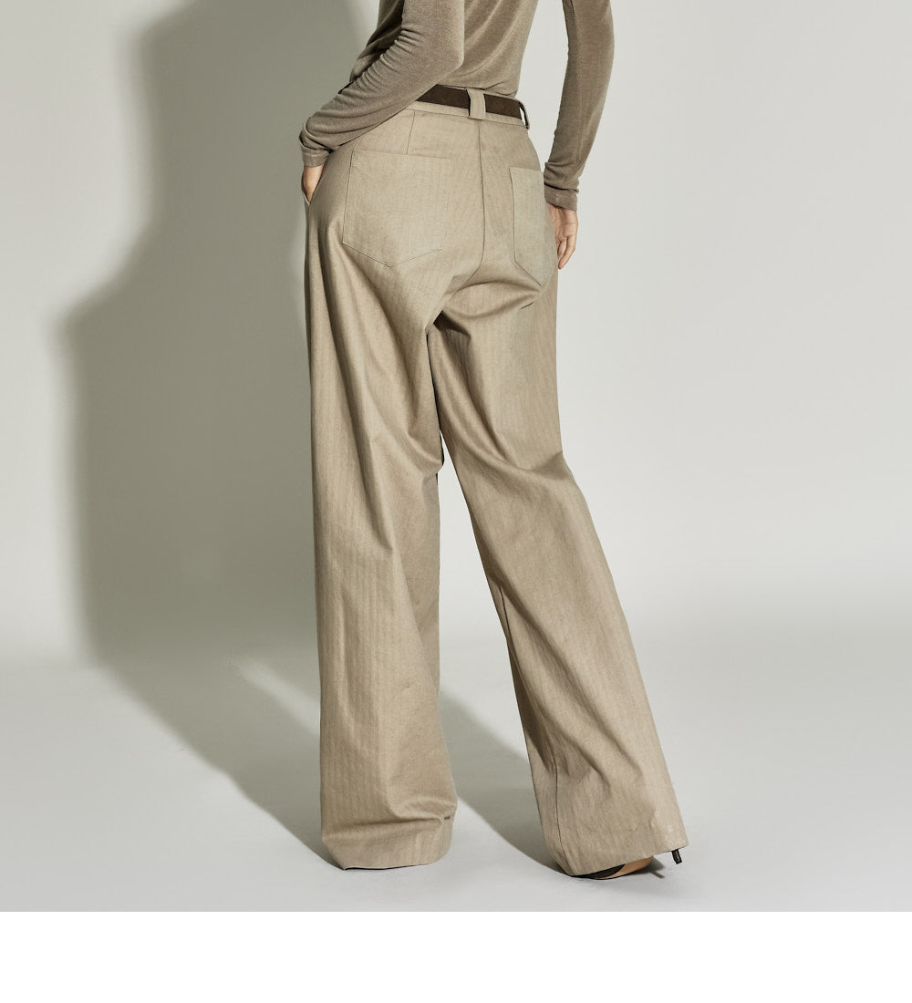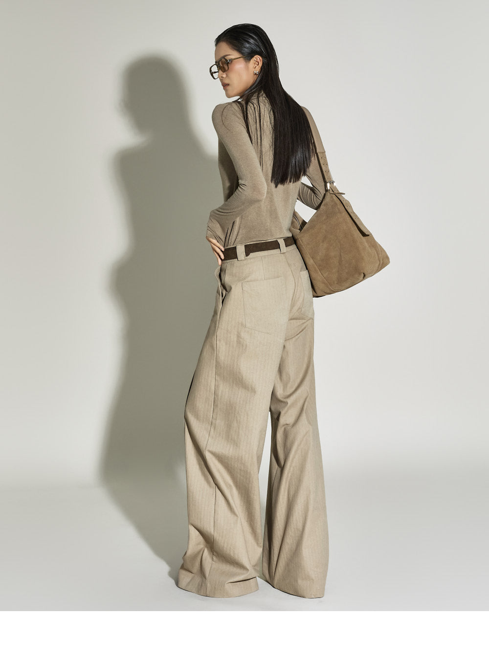 The soft beige color adds a sophisticated touch, and the belt loops at the waist and