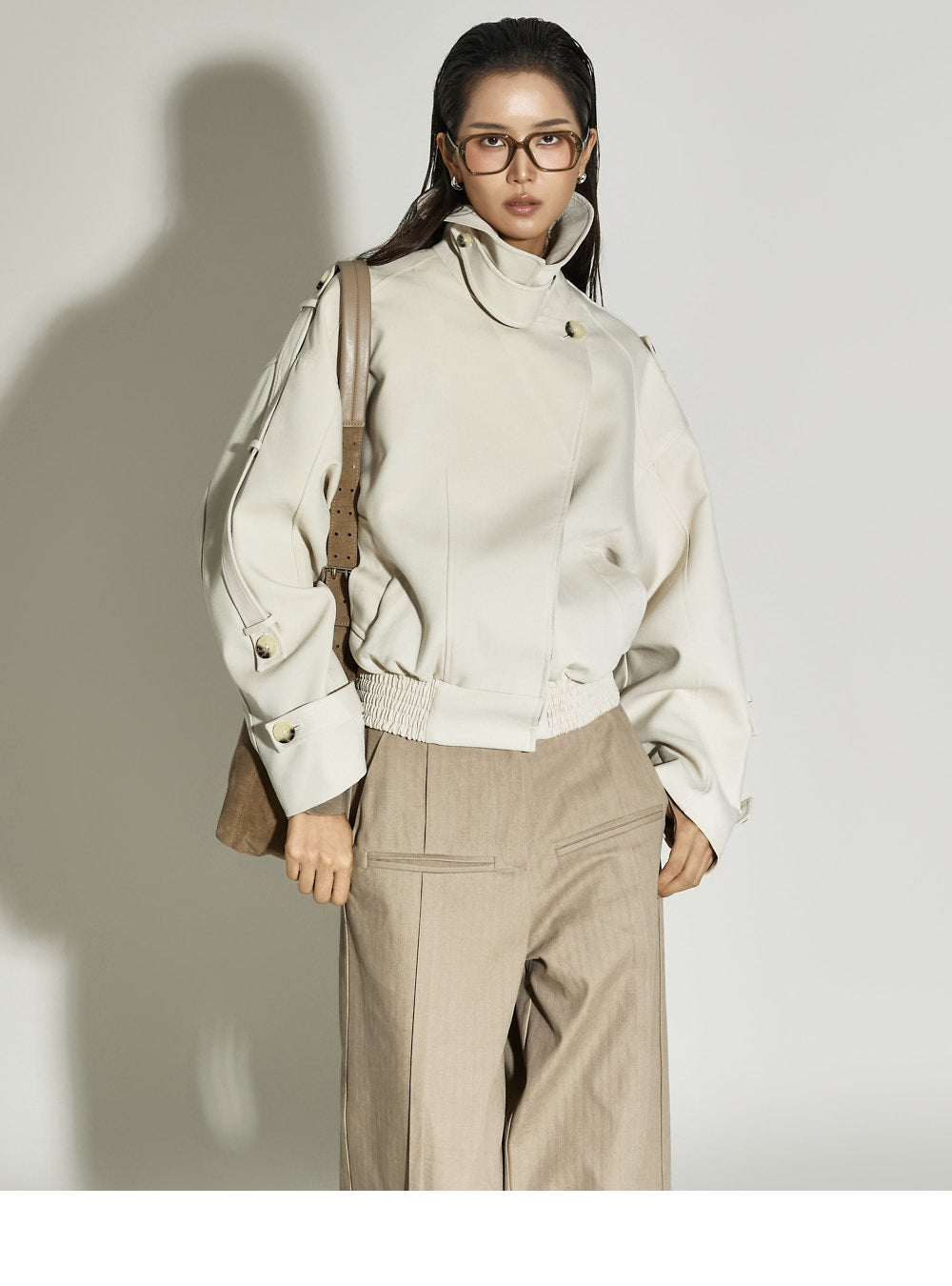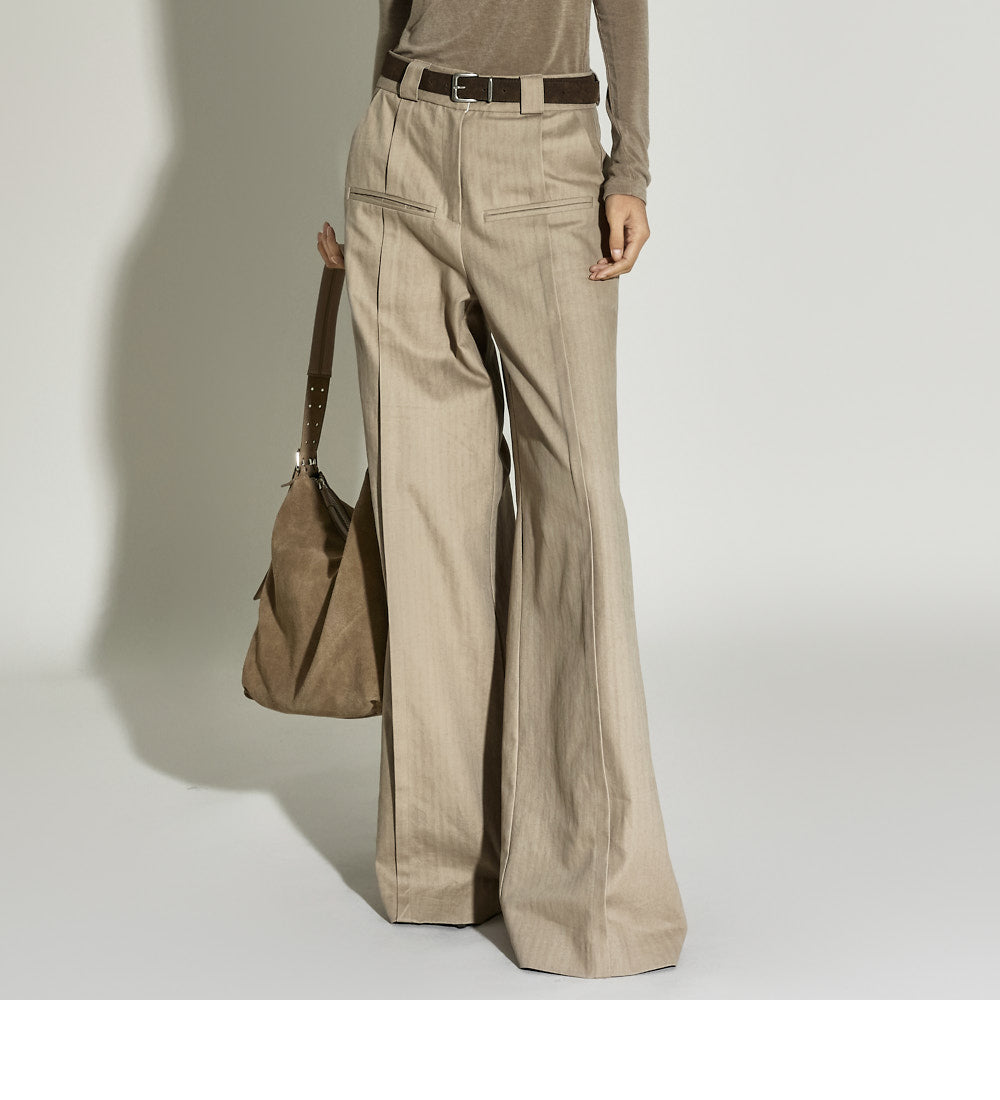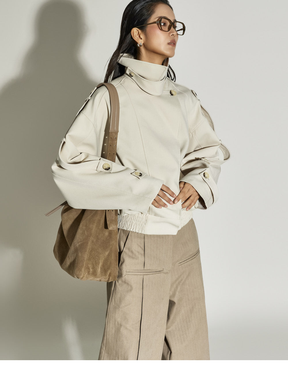 The soft beige color adds a sophisticated touch, and the belt loops at the waist and