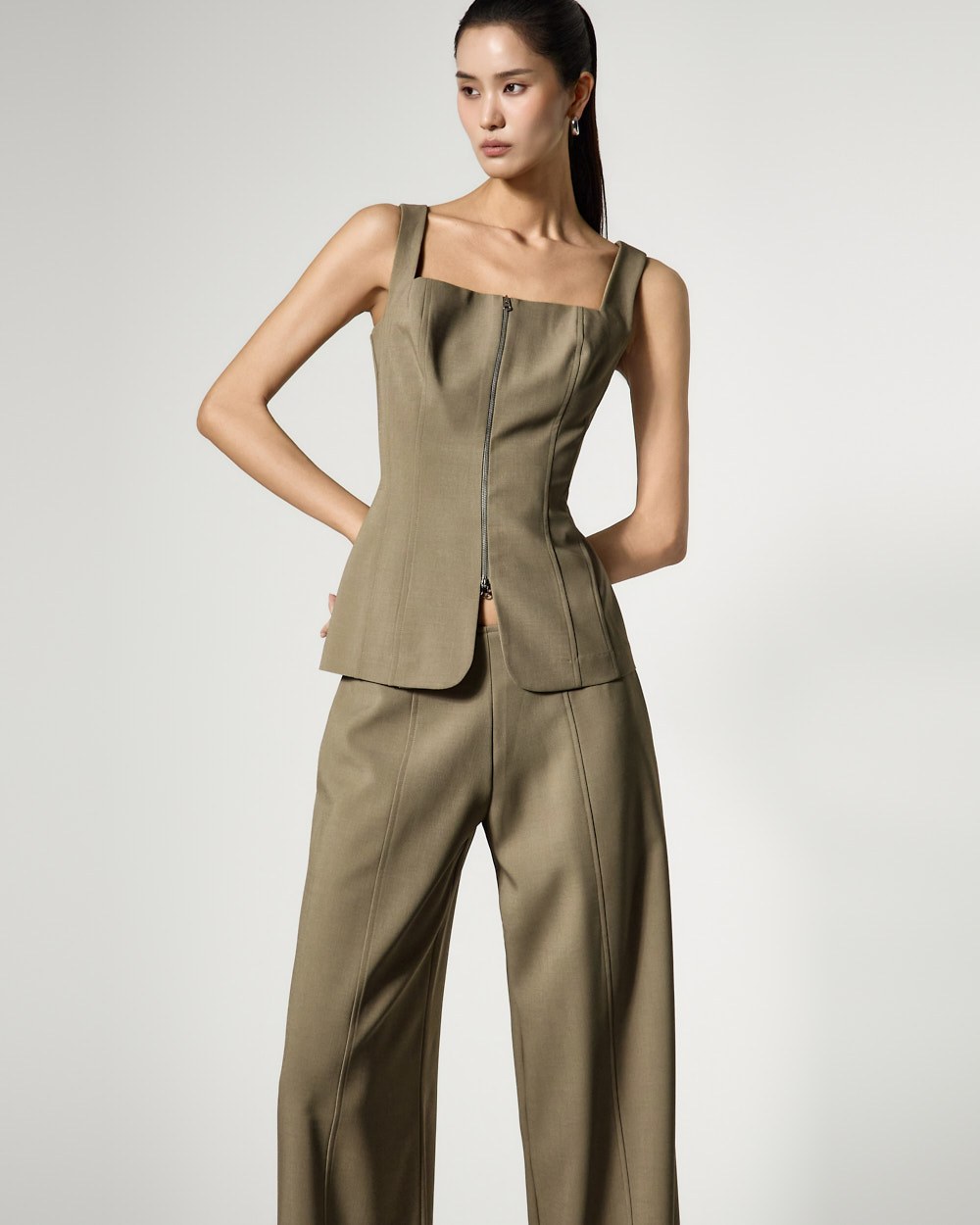 The low-waist design sets the waistline low, completing a sophisticated yet cool look.