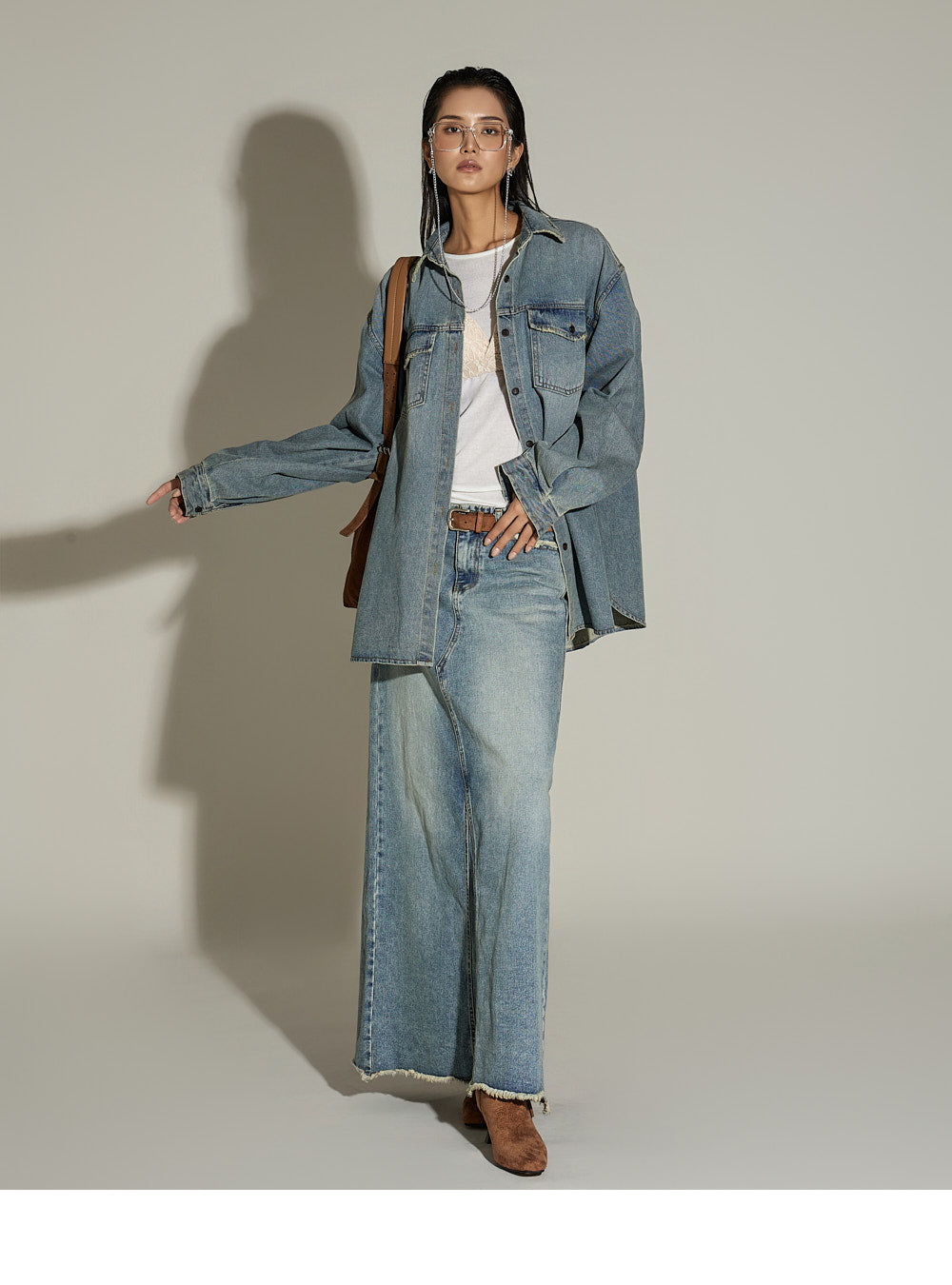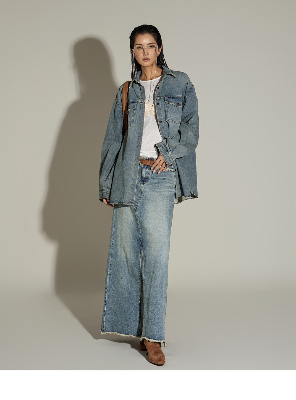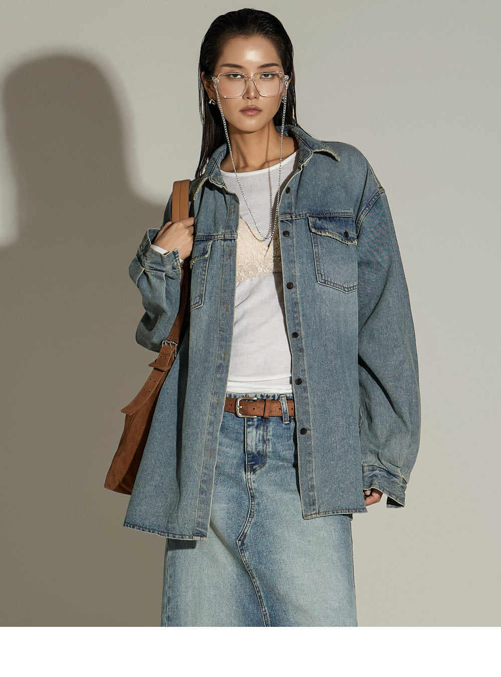 This oversized denim shirt has a casual vibe.