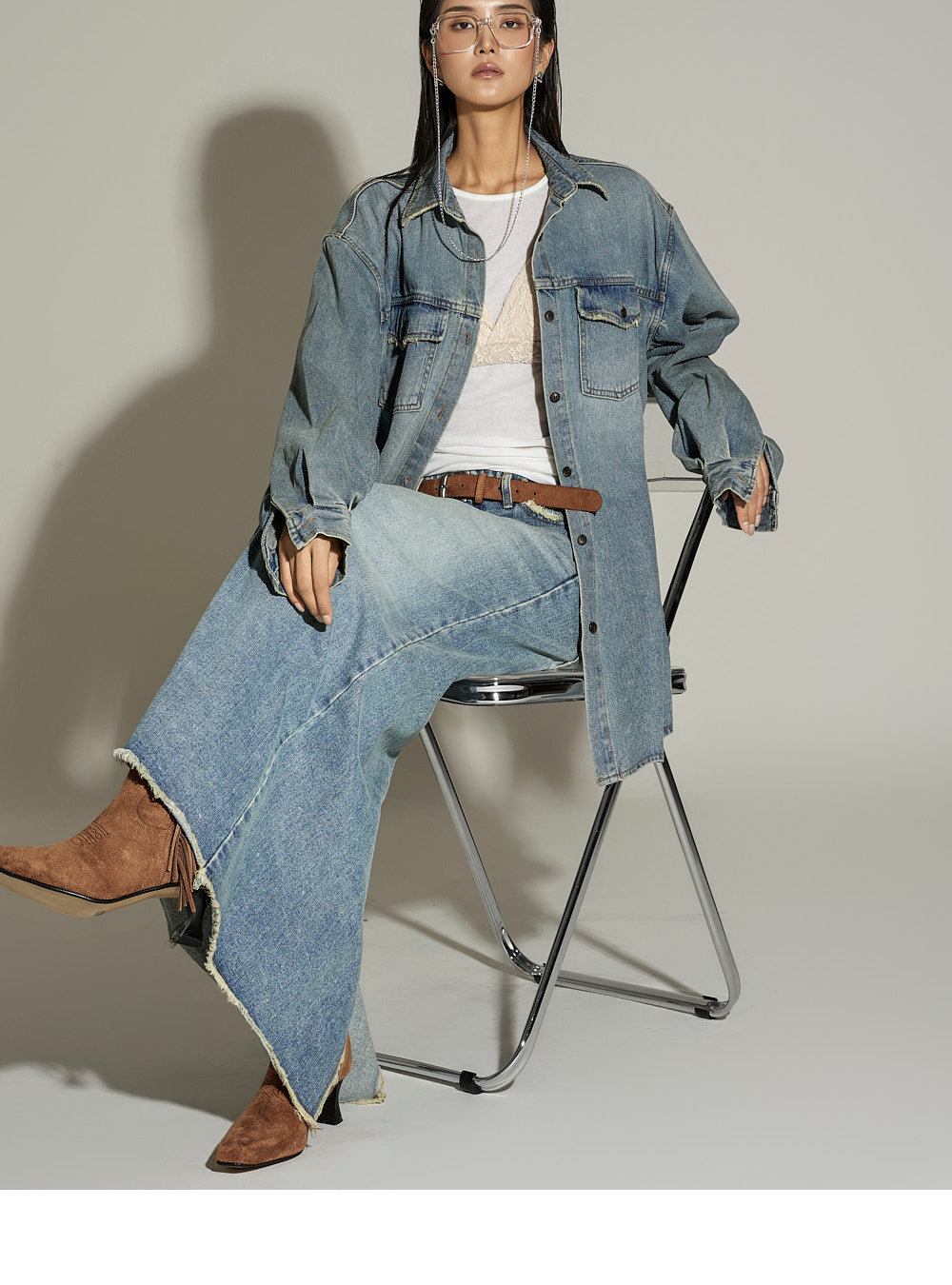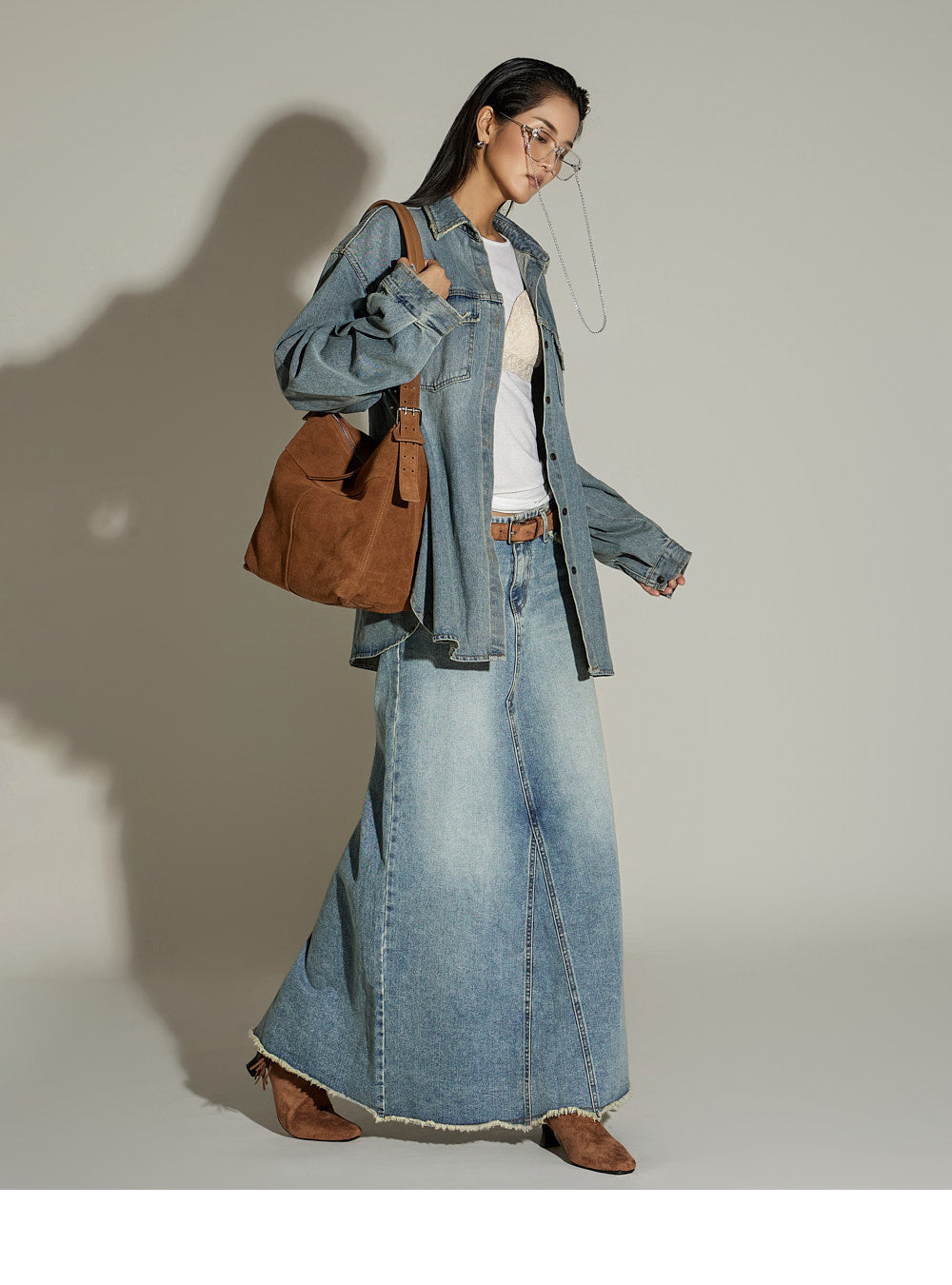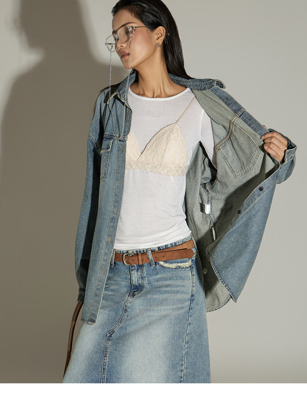 This oversized denim shirt has a casual vibe.