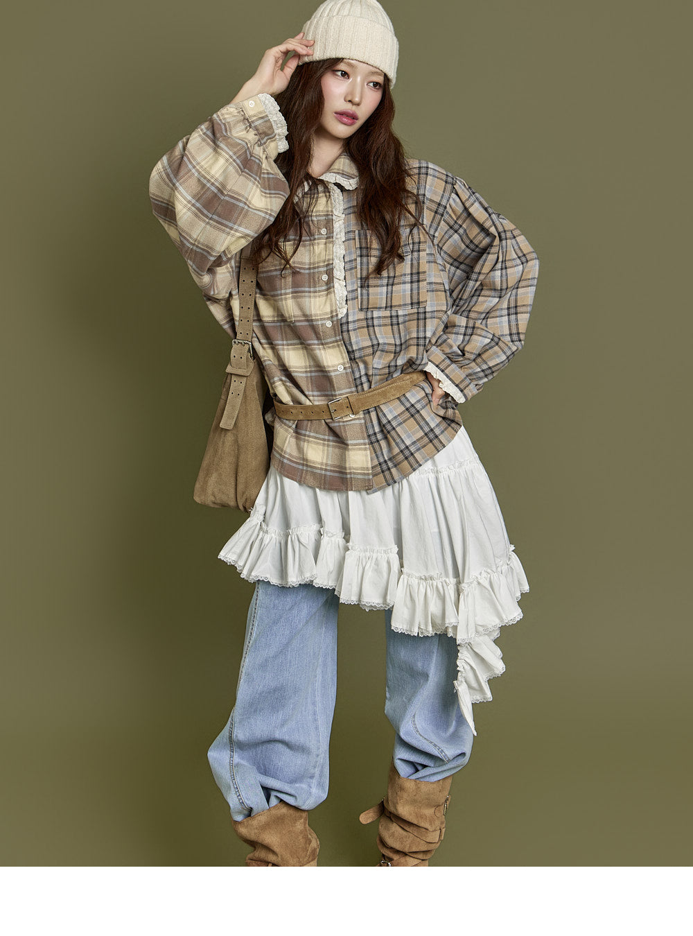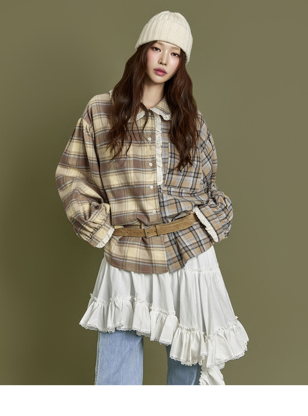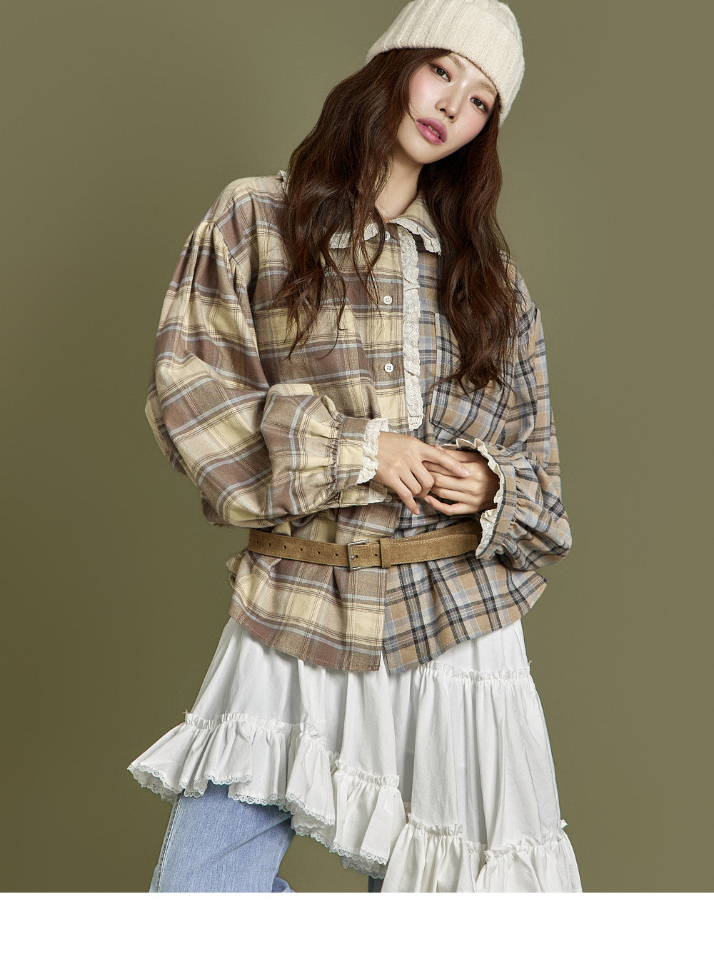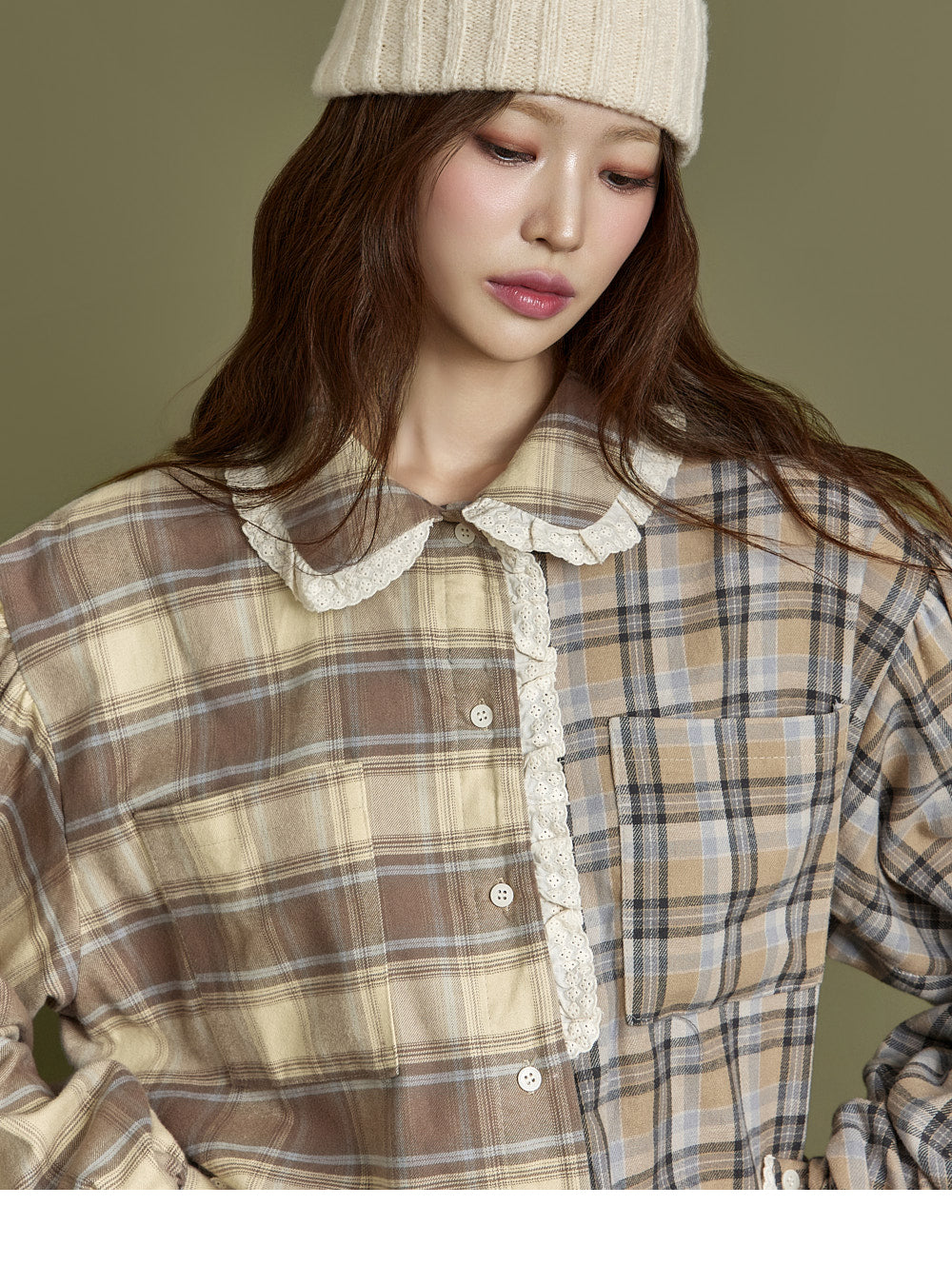 This check lace shirt exudes a casual vibe.