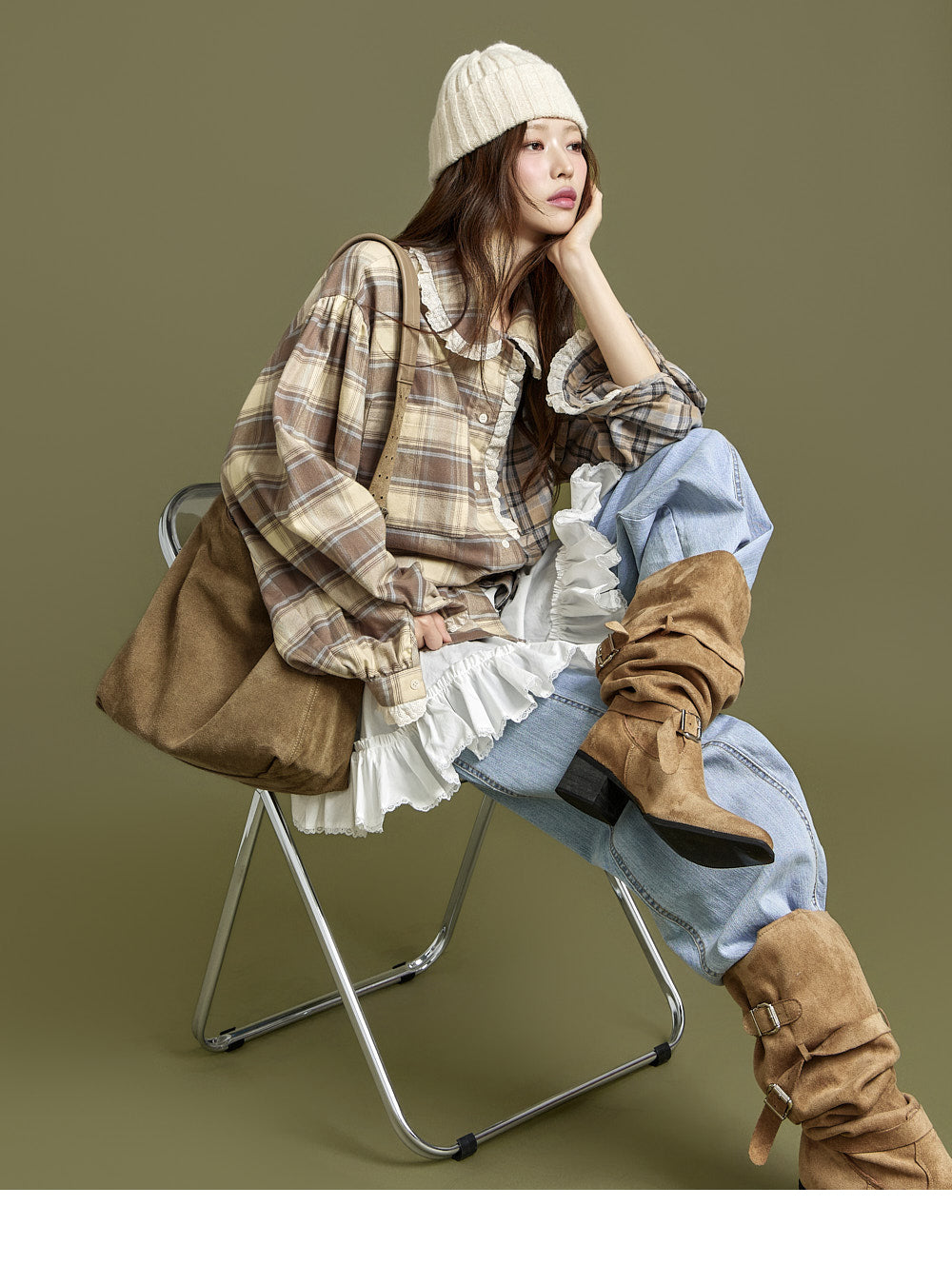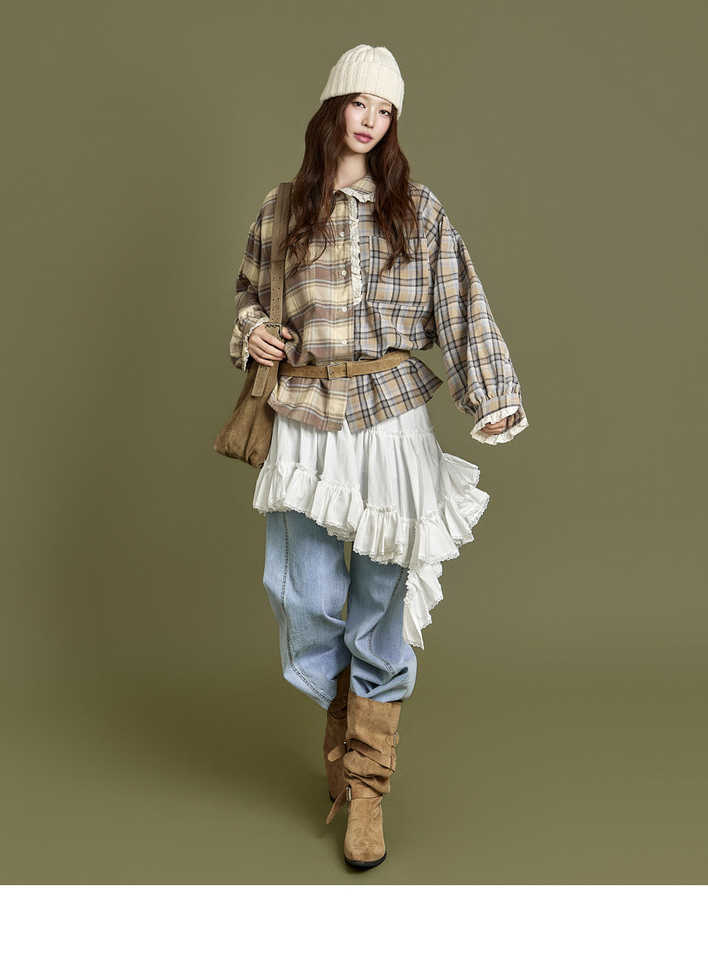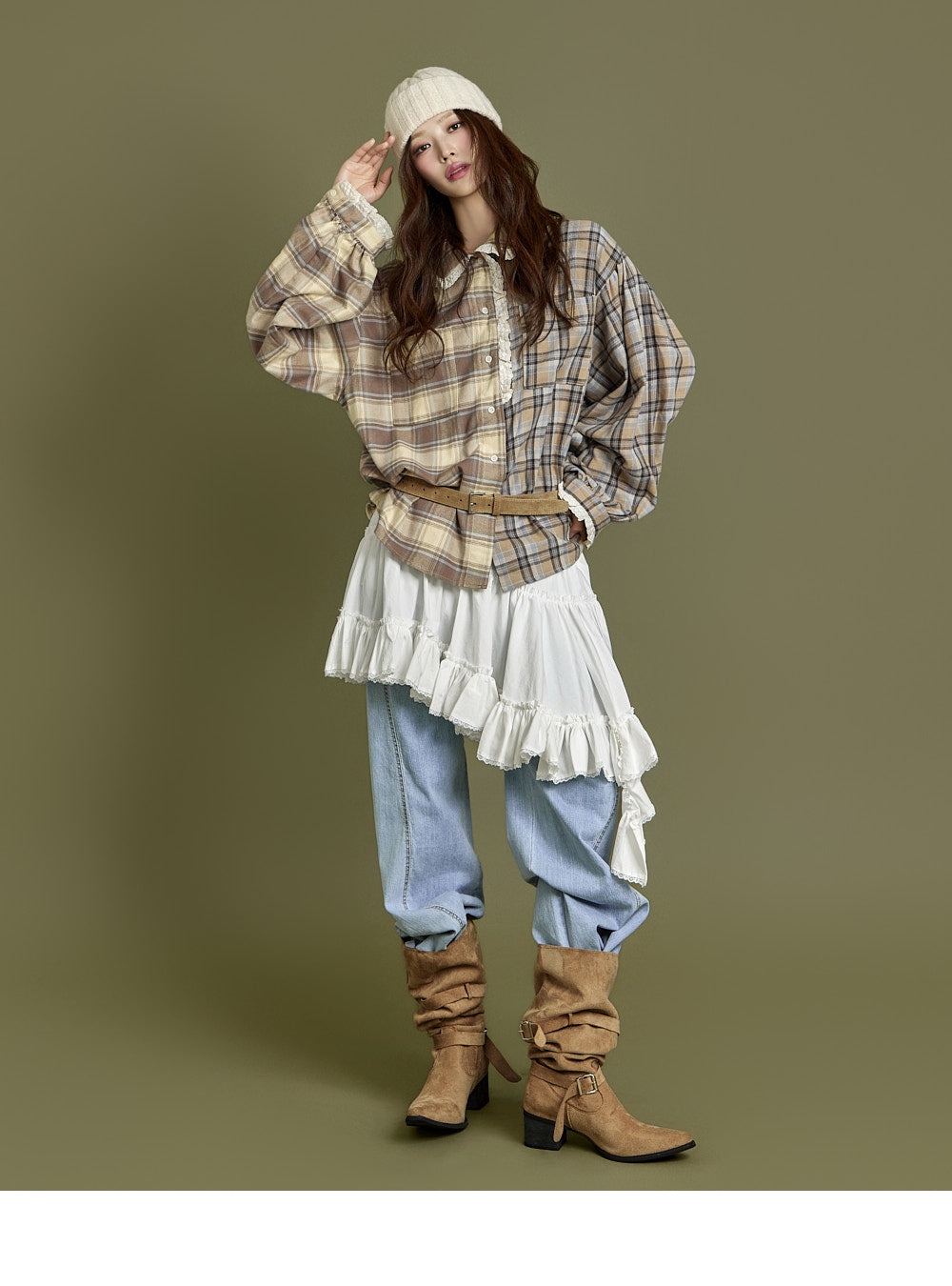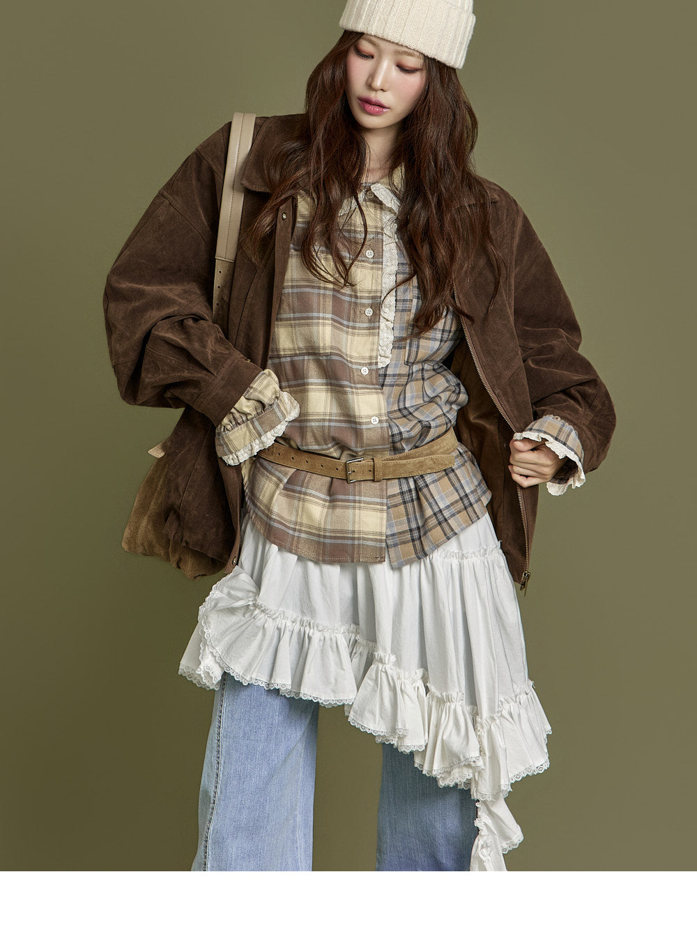 This check lace shirt exudes a casual vibe.