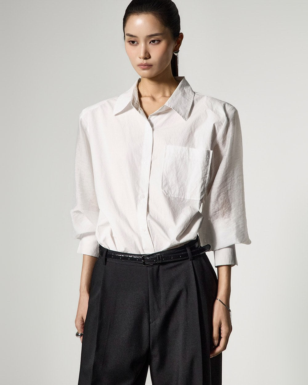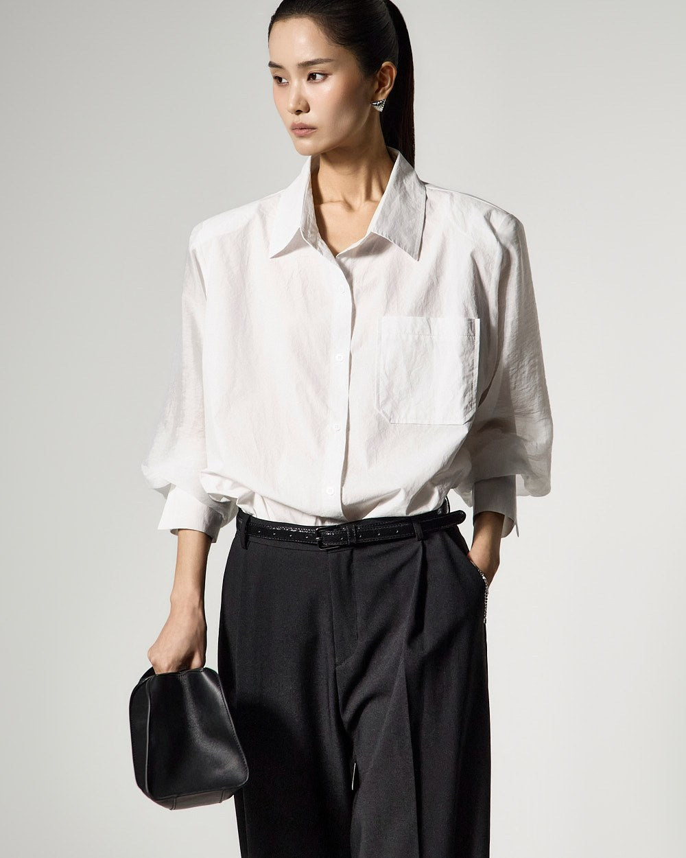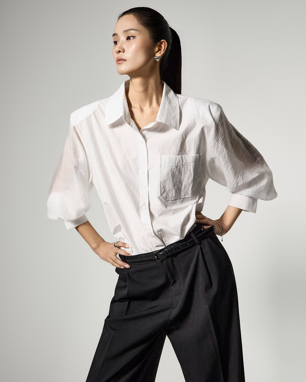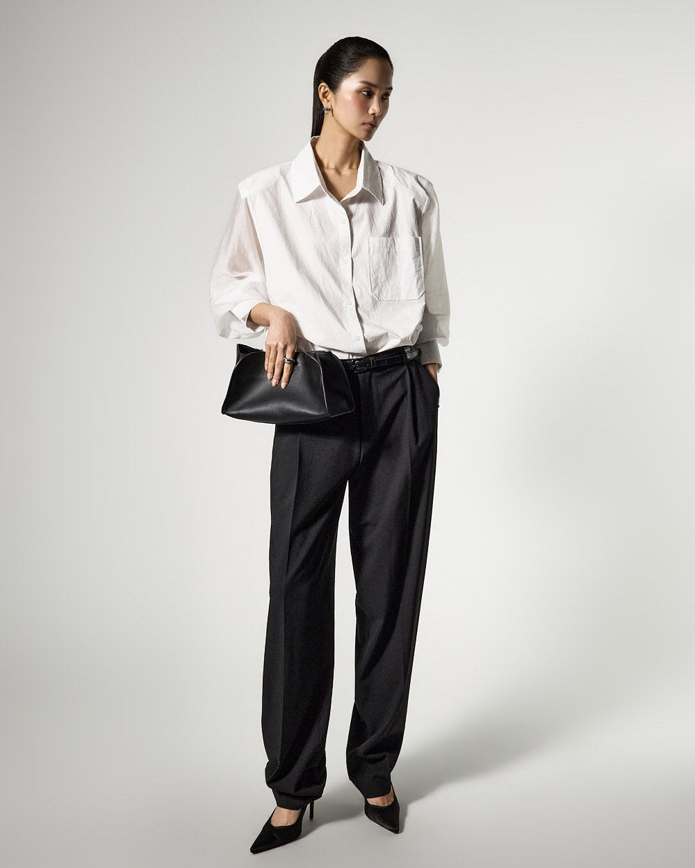 and completes a clean fit with a bust pocket and moderate shoulder pads.