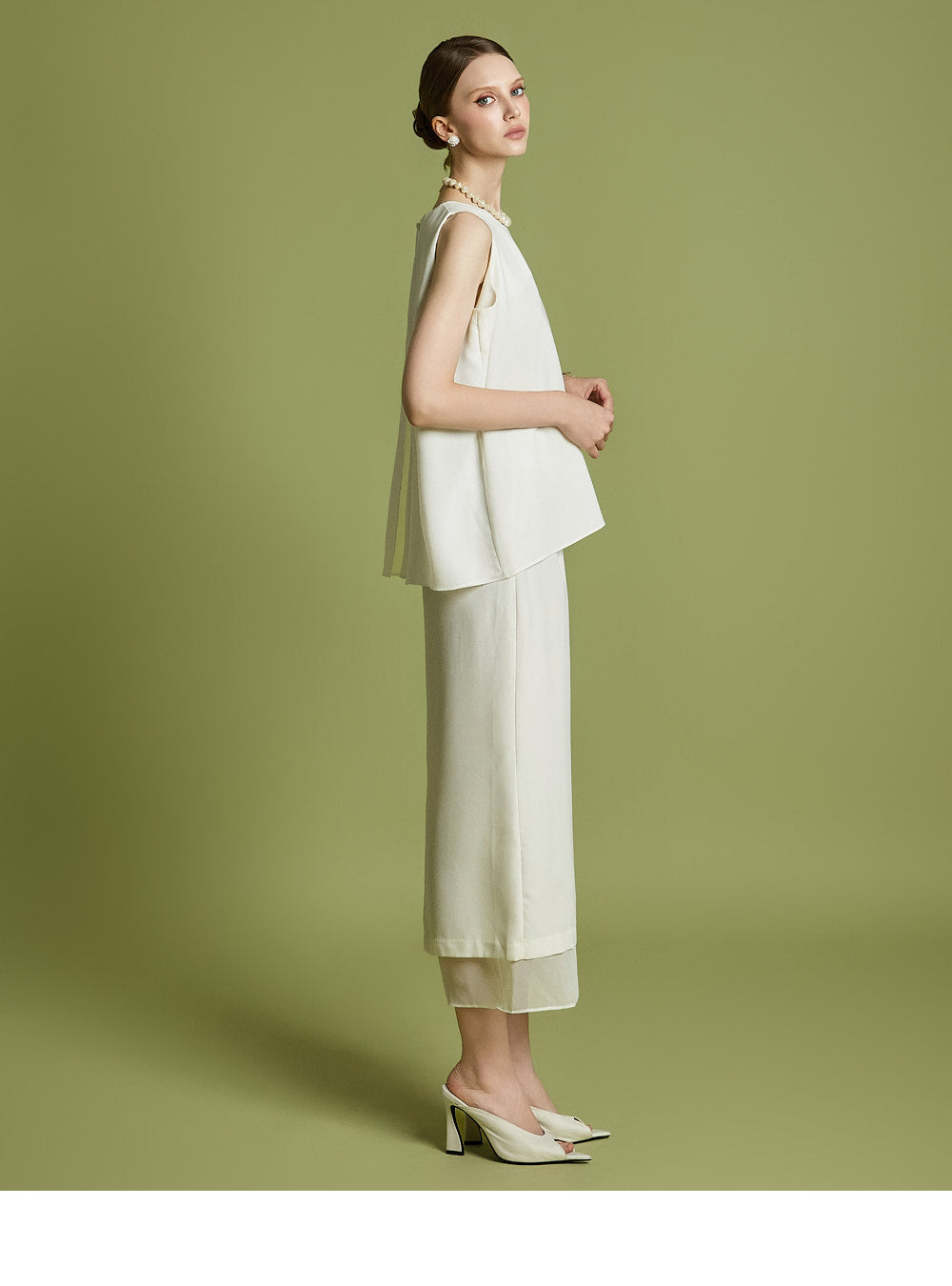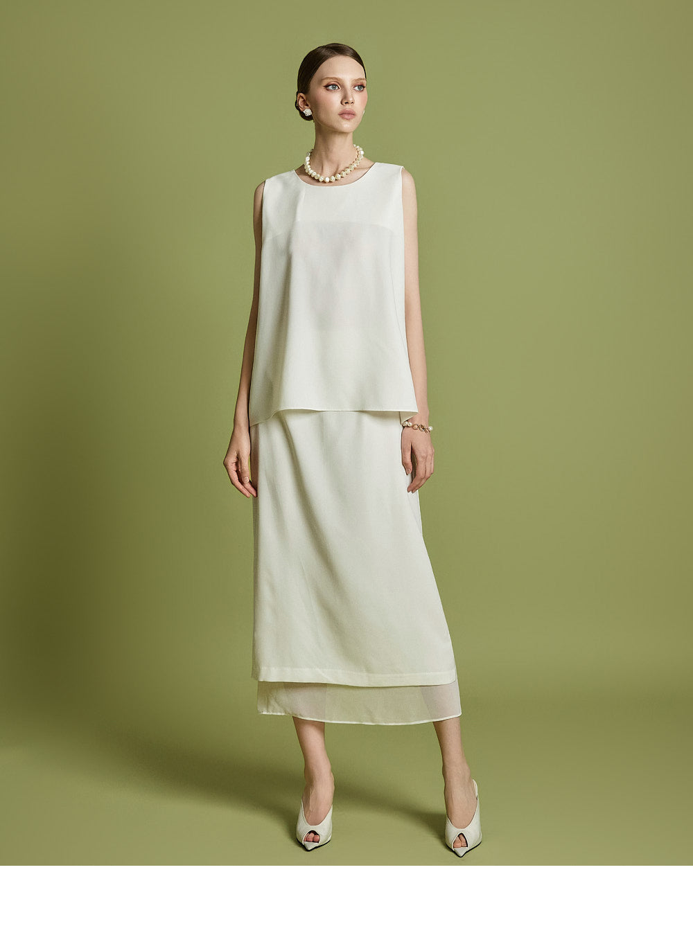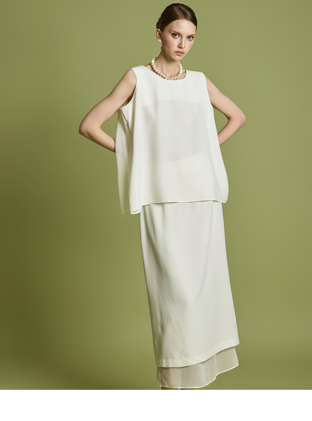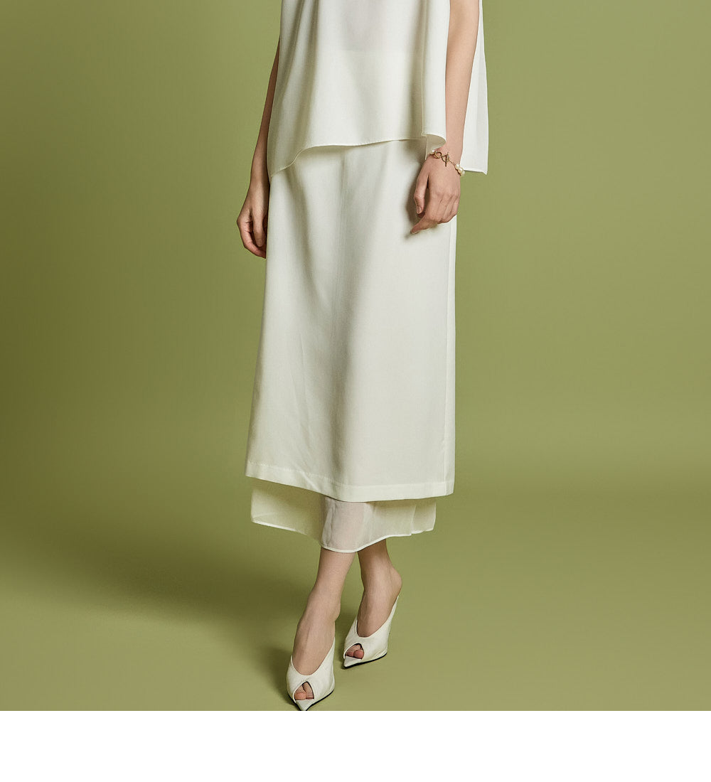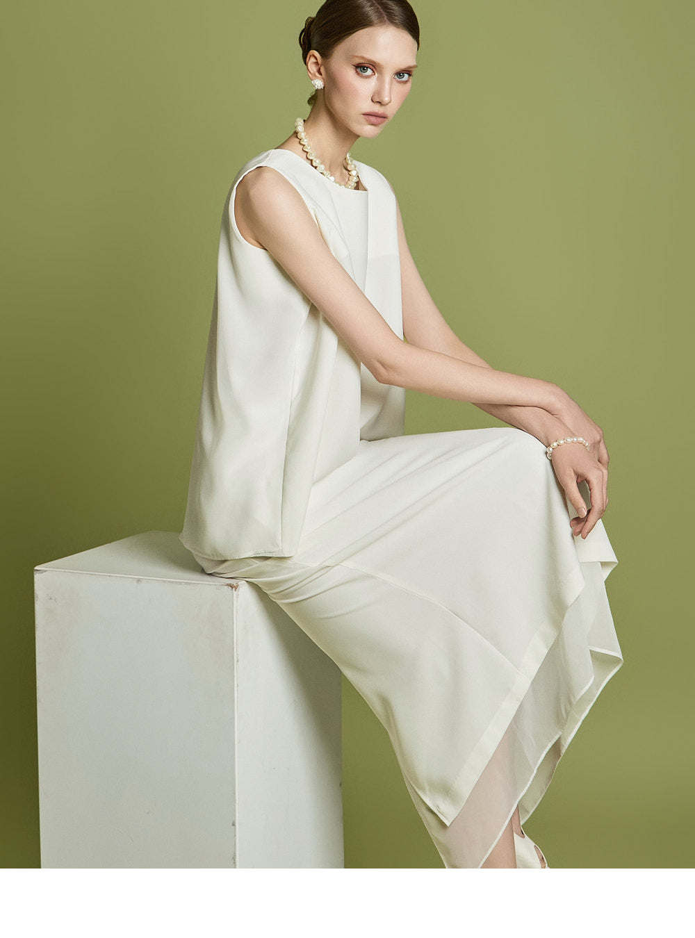 while sheer fabric at the hem adds a sophisticated visual accent.