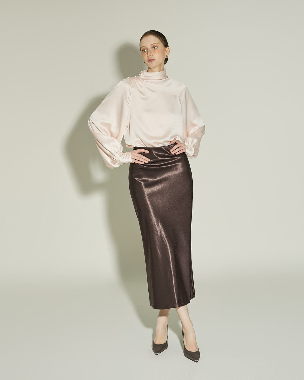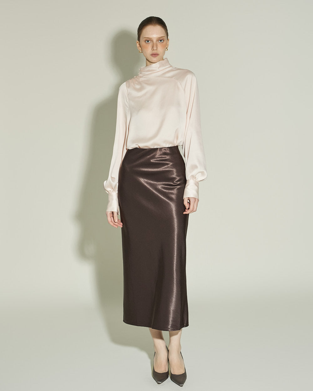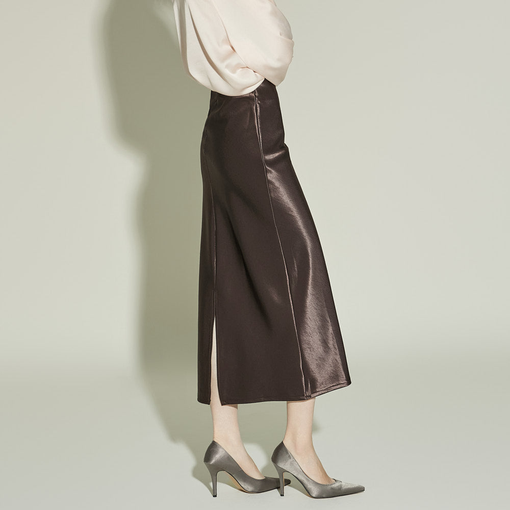 This glossy skirt exudes a feminine vibe.