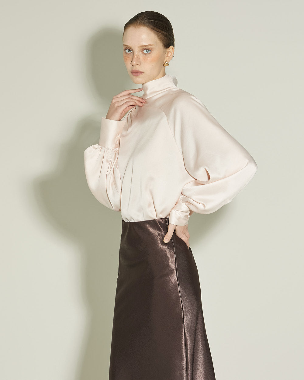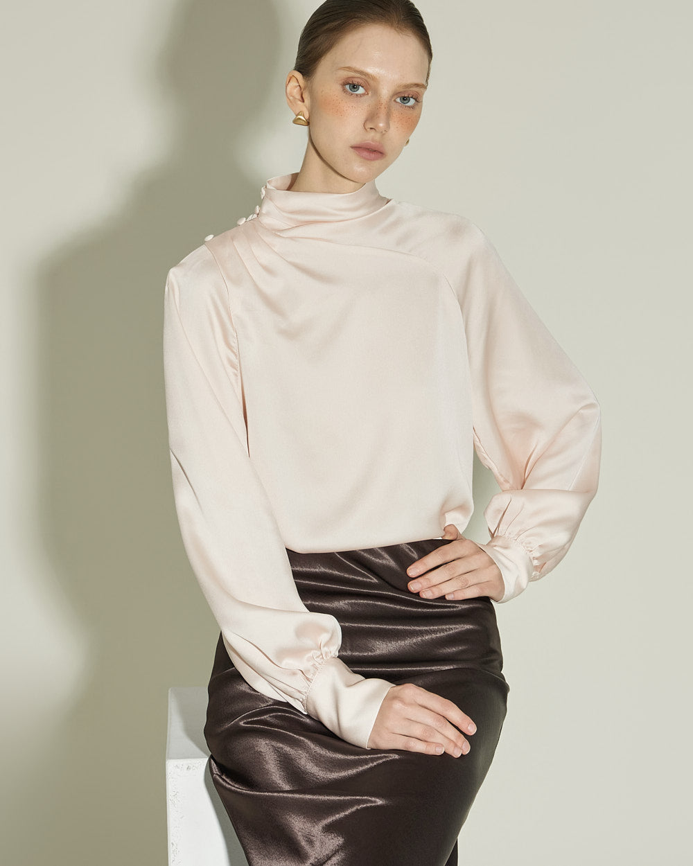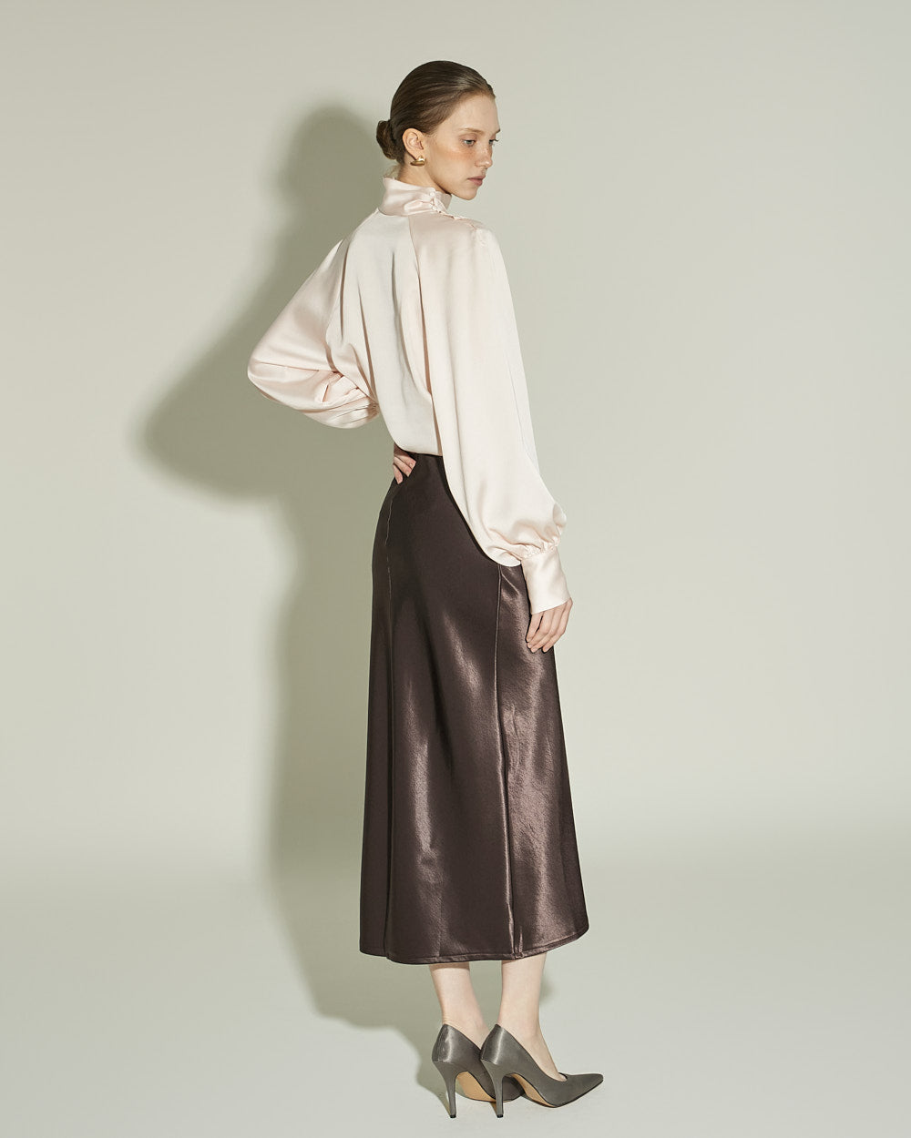 This glossy skirt exudes a feminine vibe.