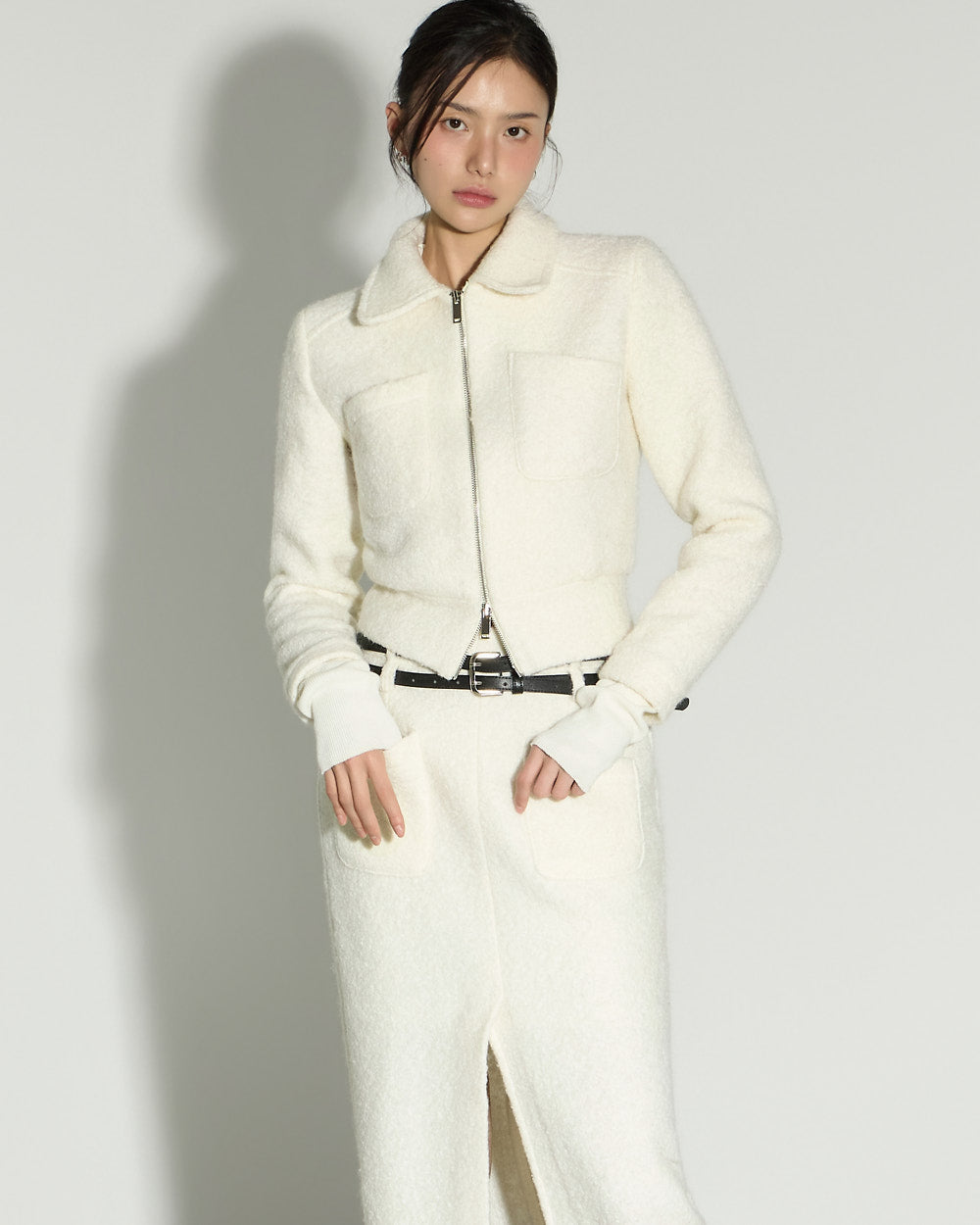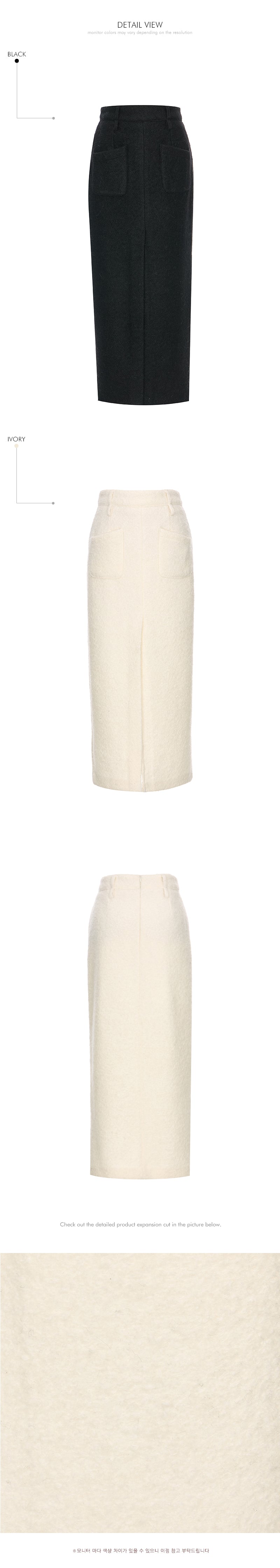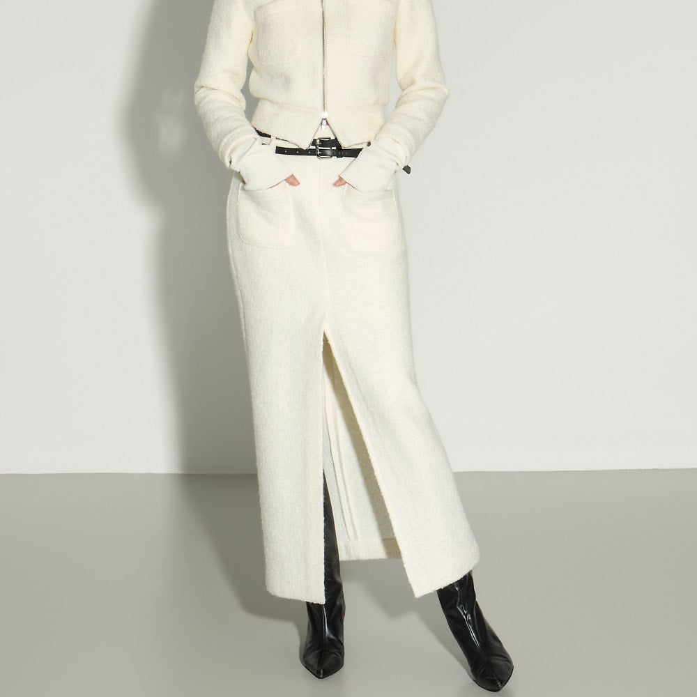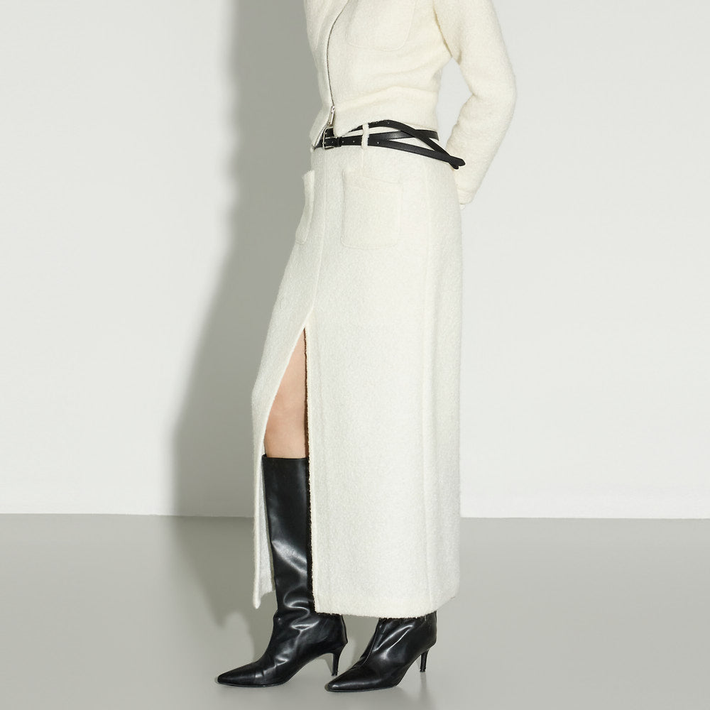 A minimalist terry wool slit skirt with a clean, refined mood.