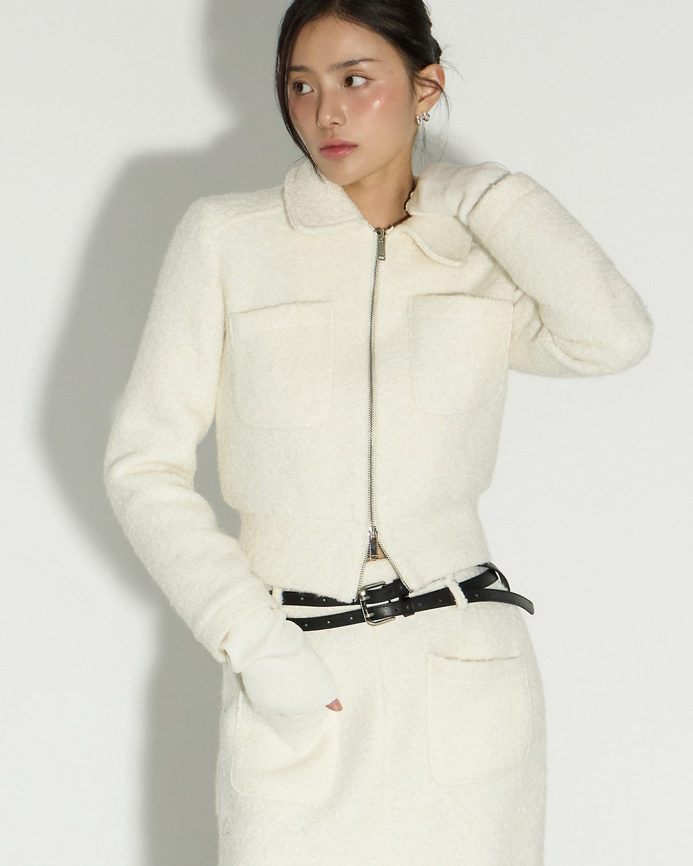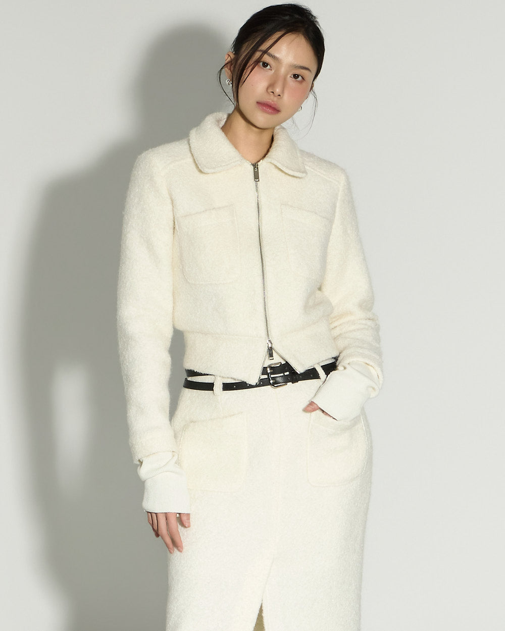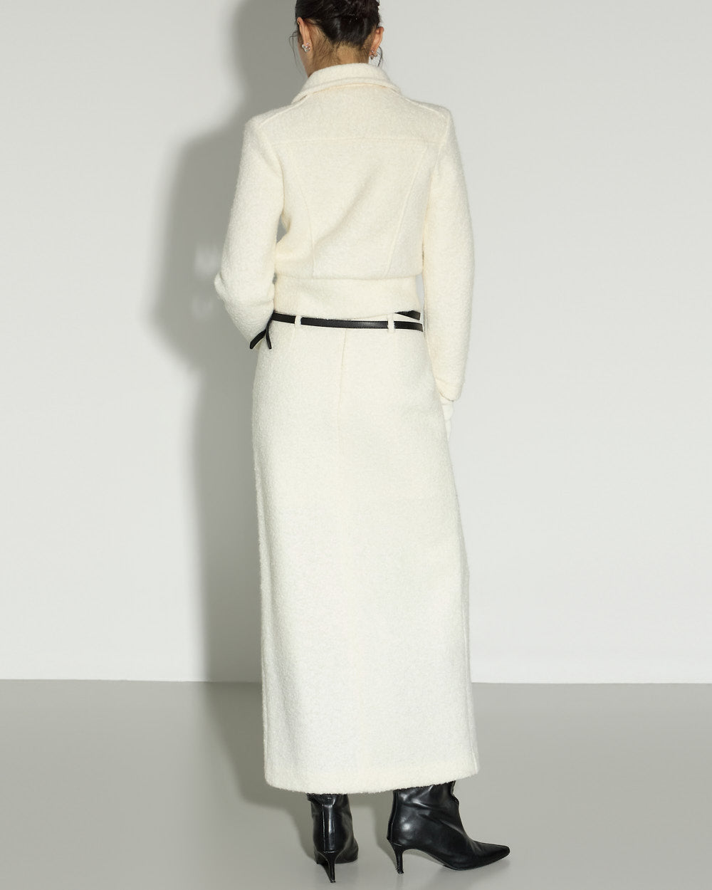 A minimalist terry wool slit skirt with a clean, refined mood.