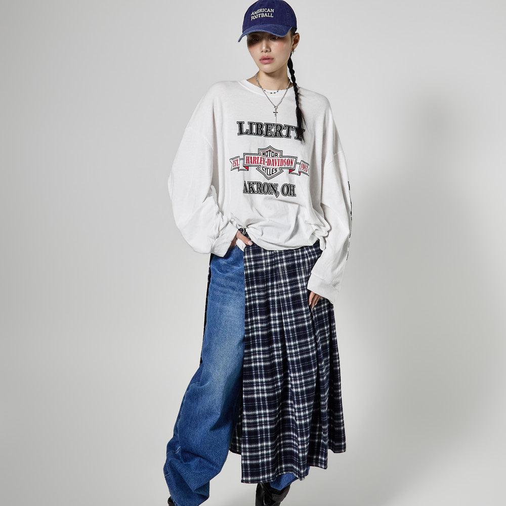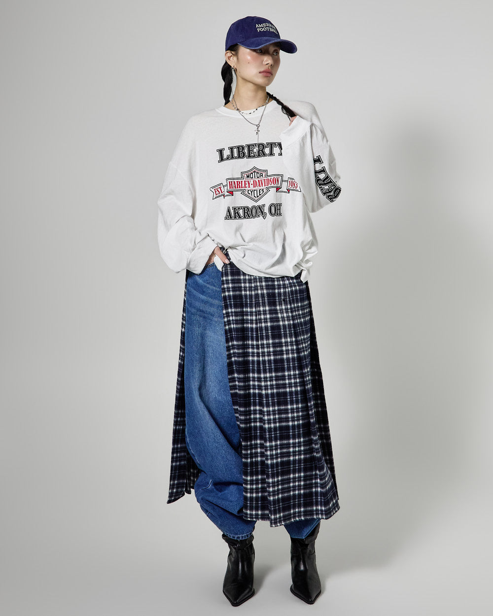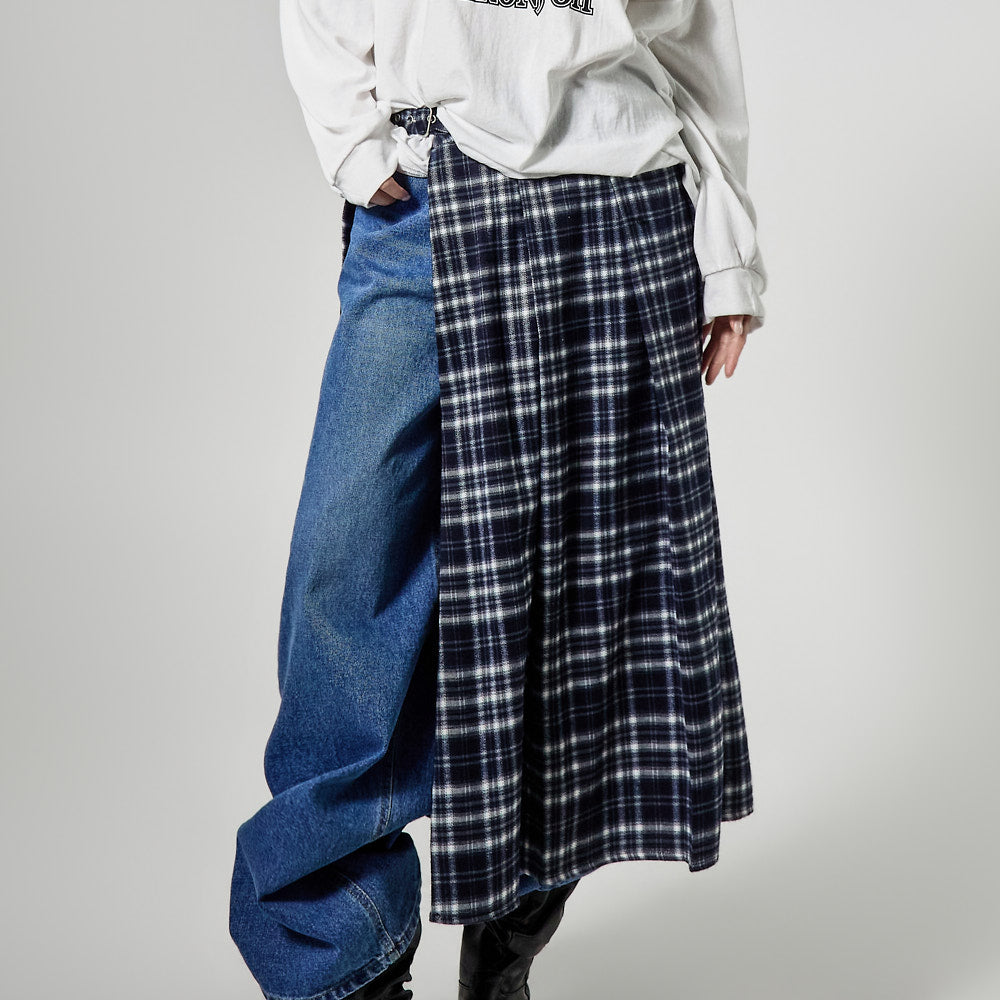 The check pattern and pleated details combine to create a classic yet unique silhouette.