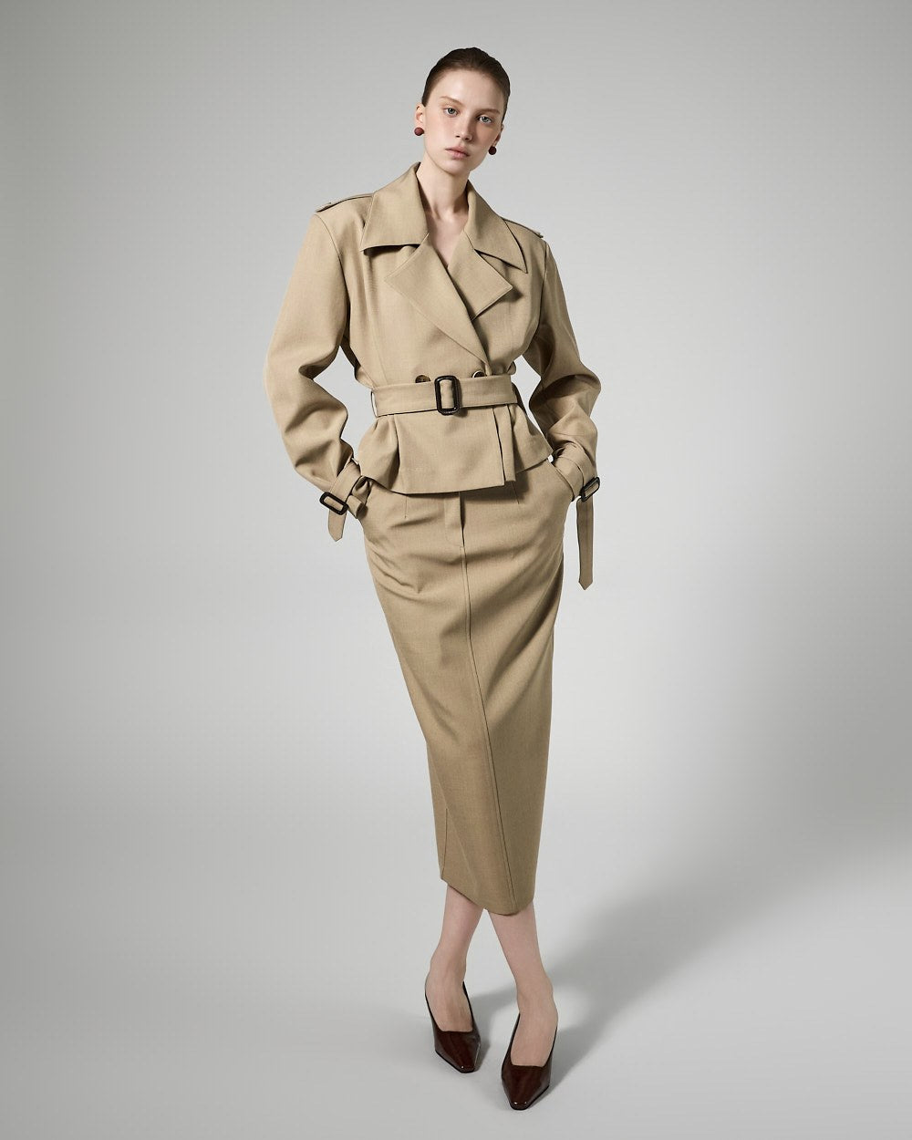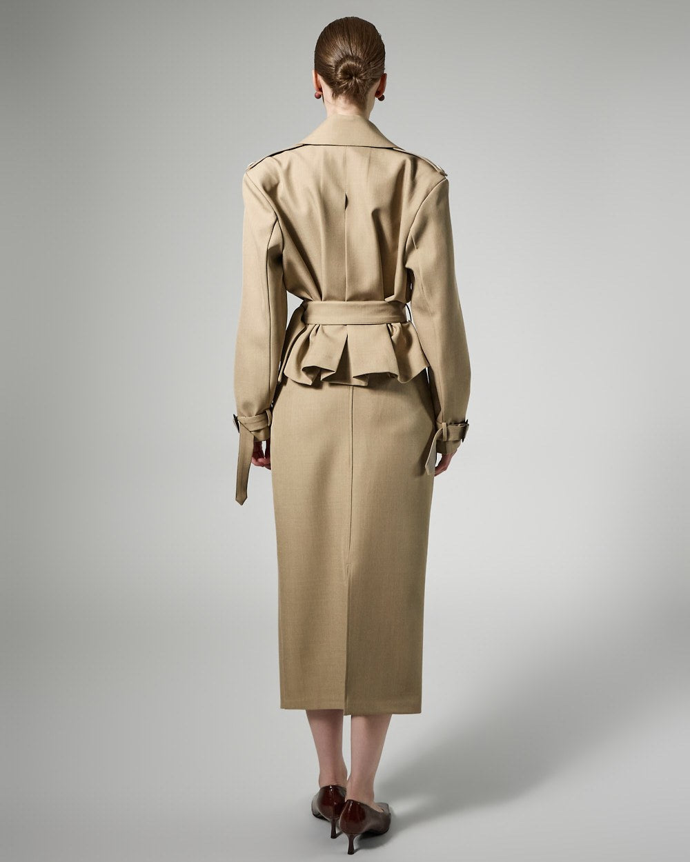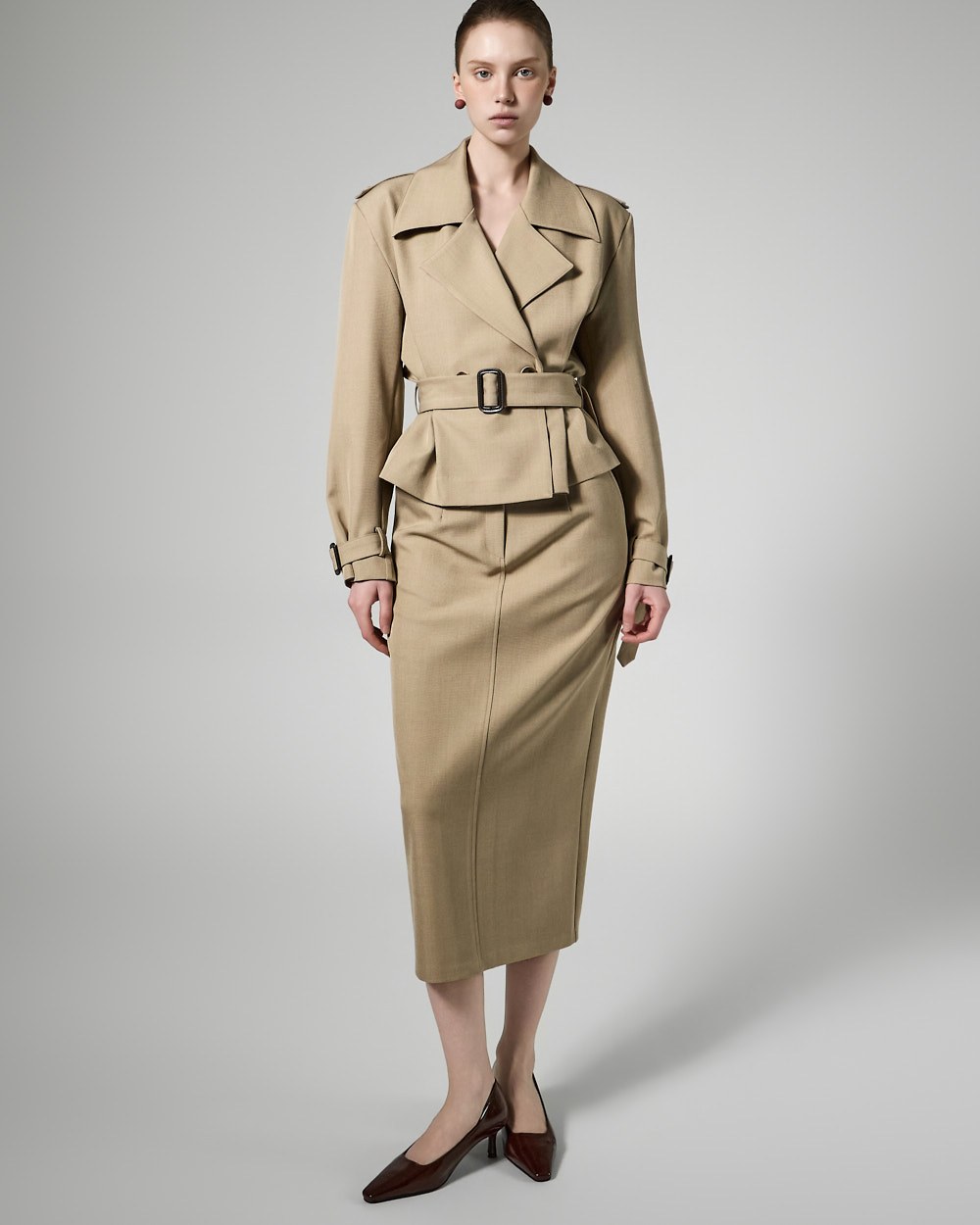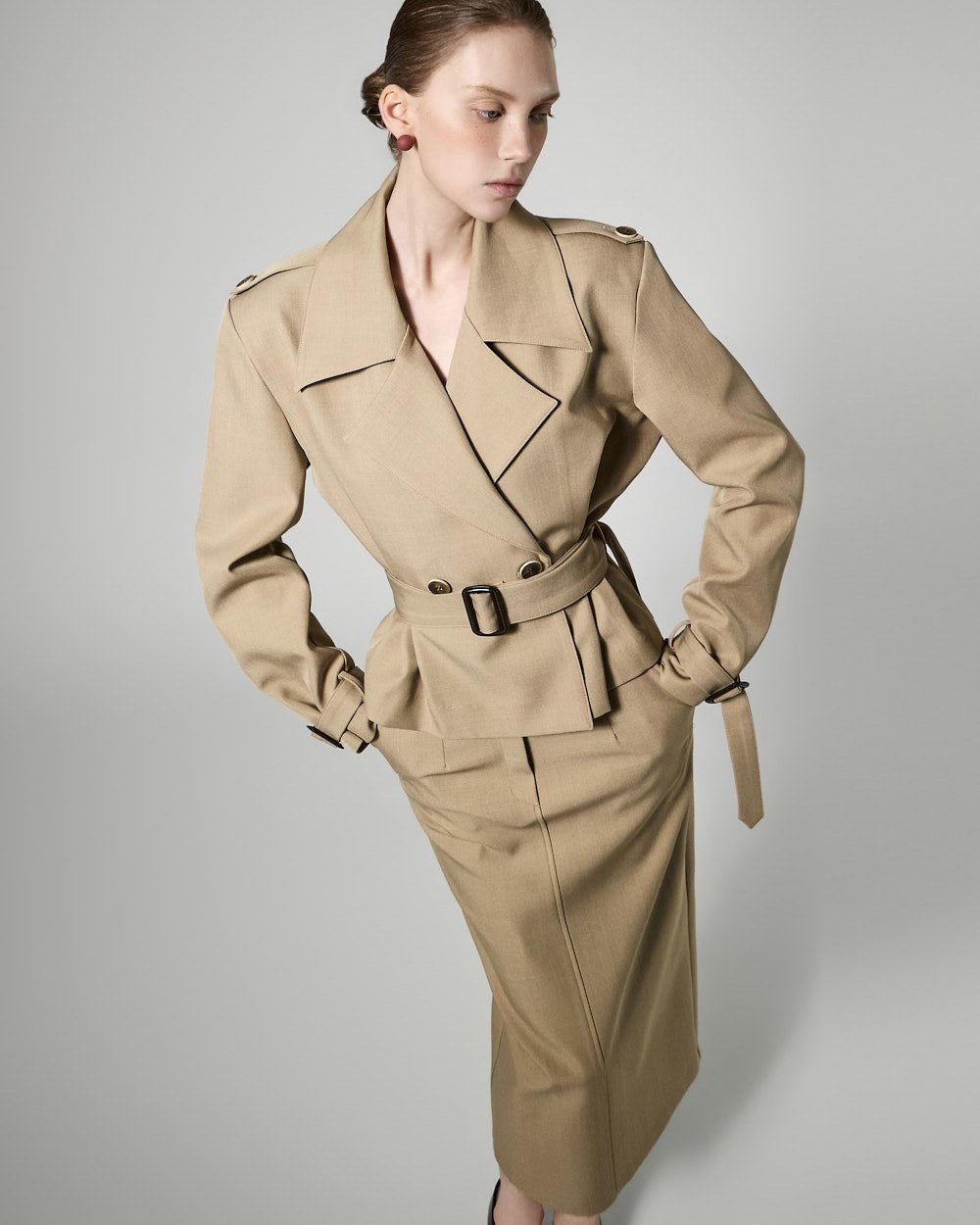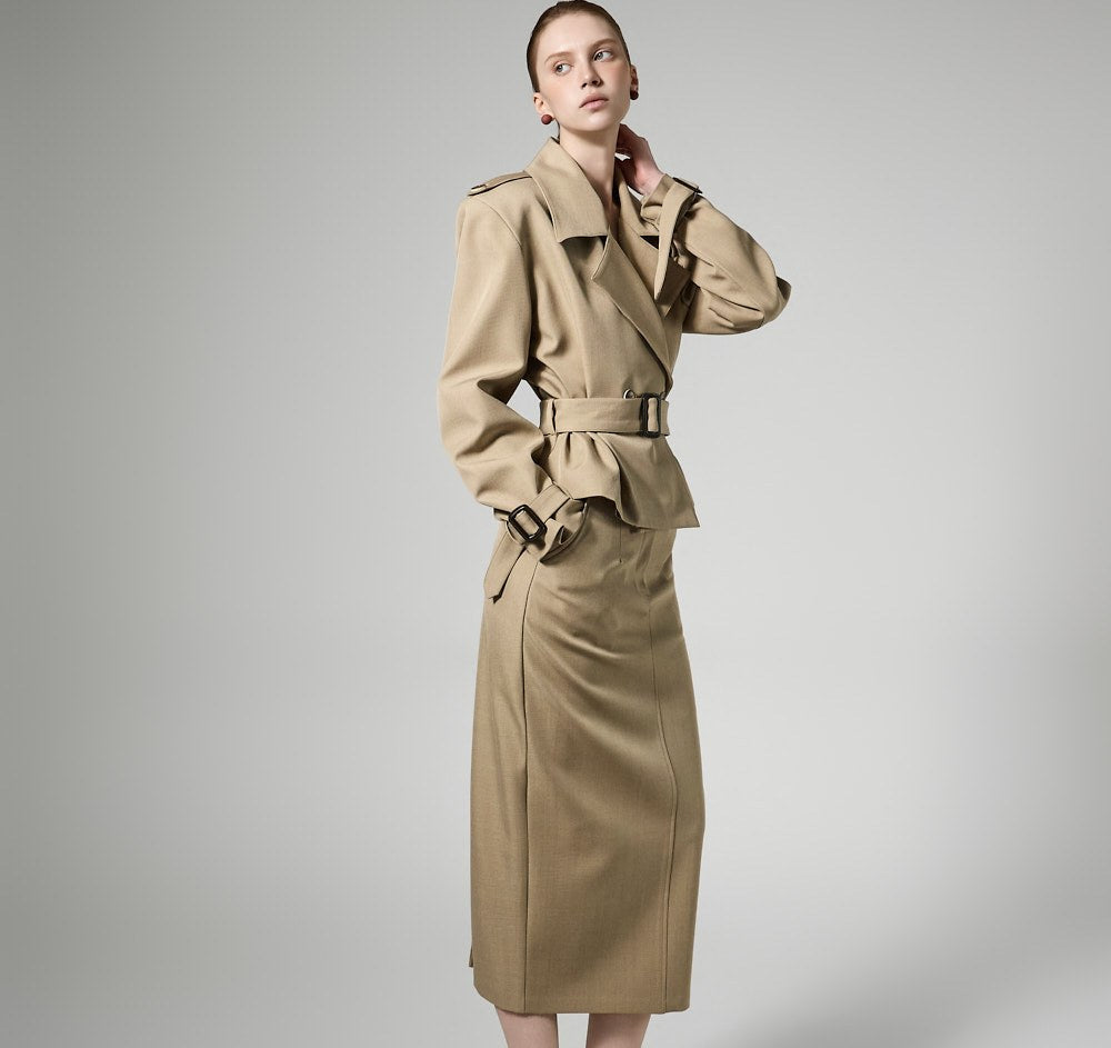 This trench skirt exudes a modern vibe.