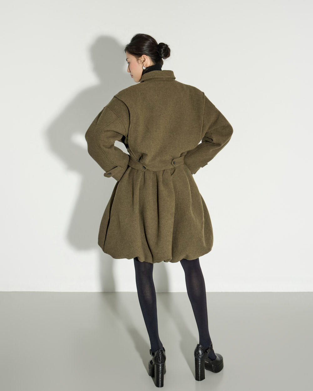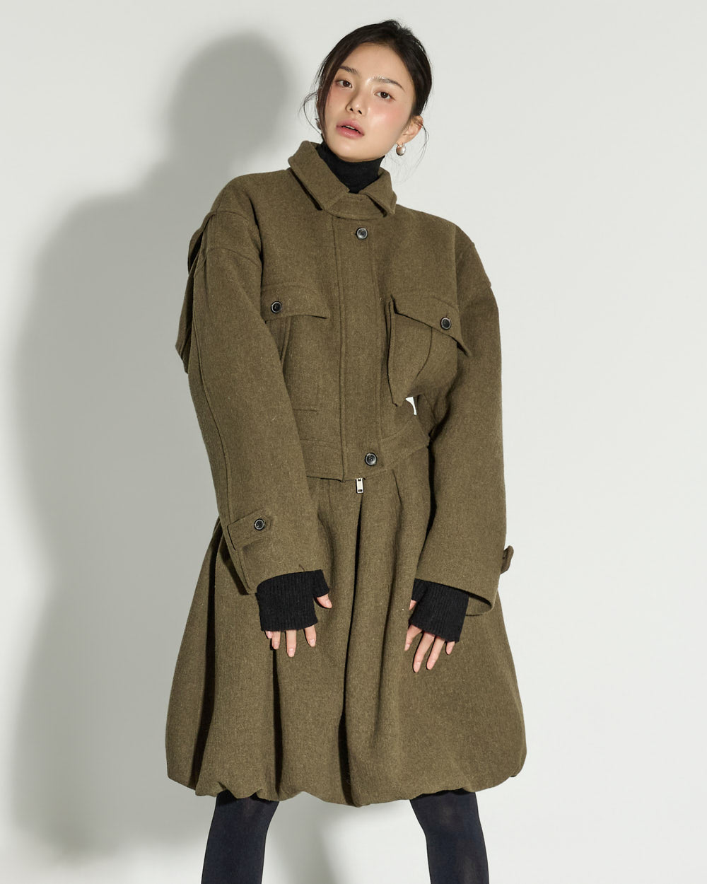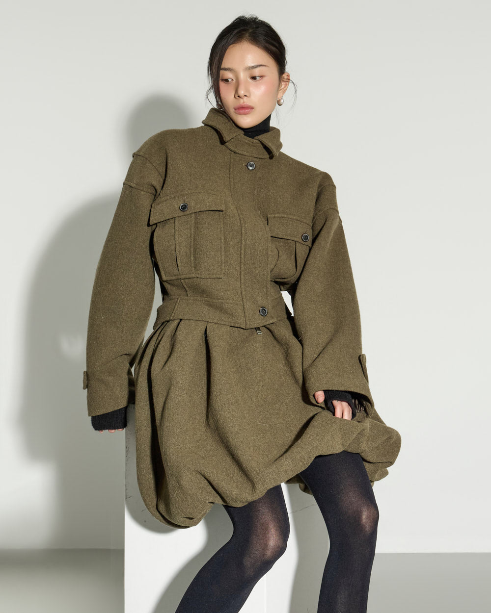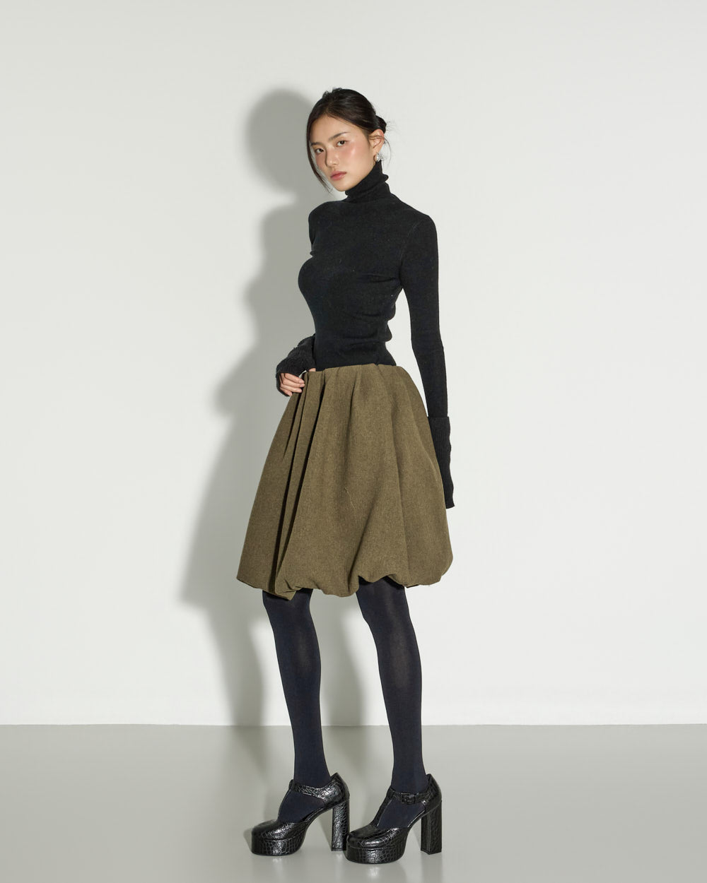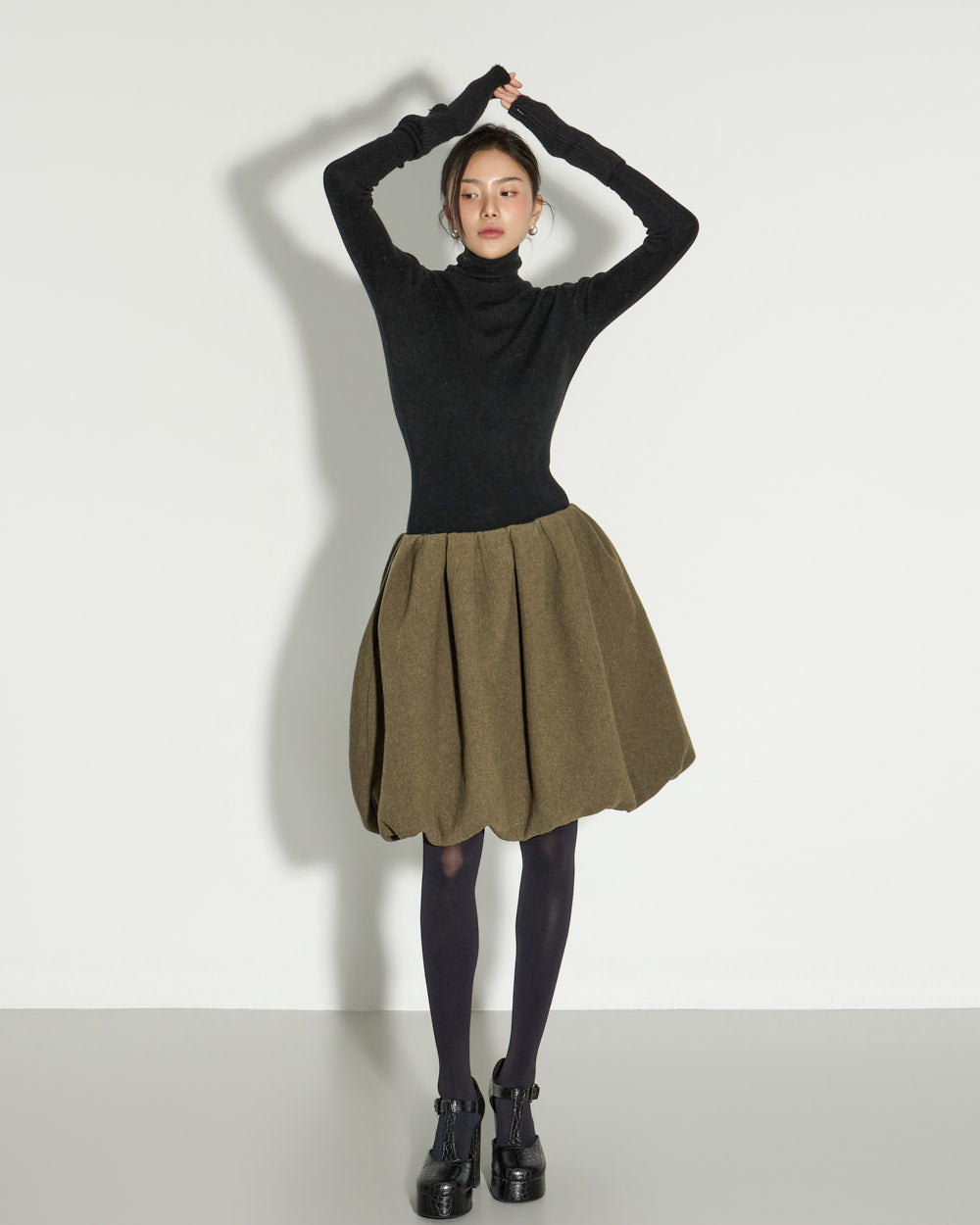 This balloon wool skirt exudes a modern, lovely mood.