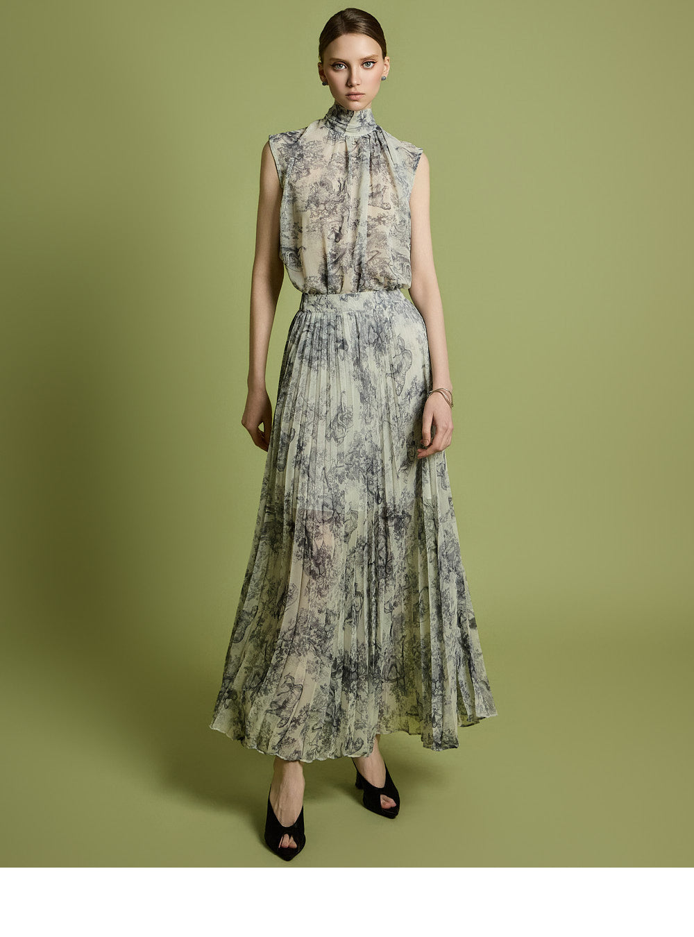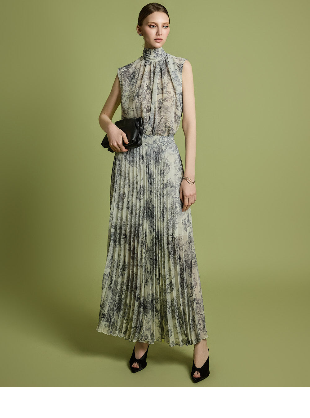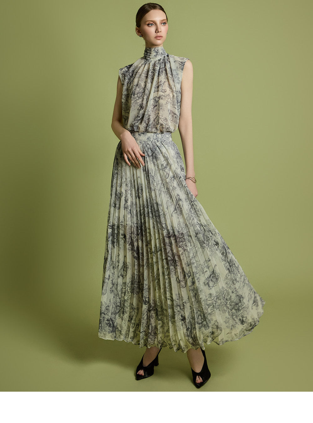The skirt has a long pleated silhouette that creates a neat and elegant look,