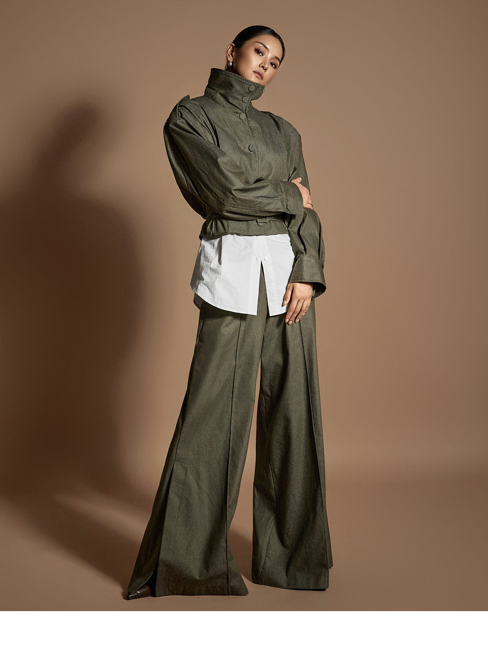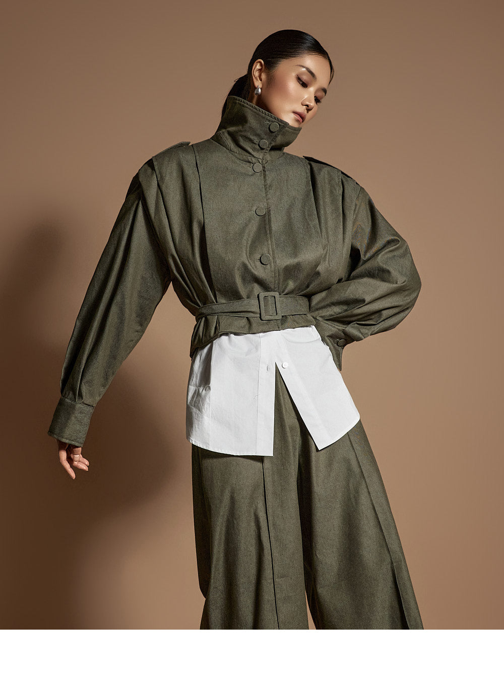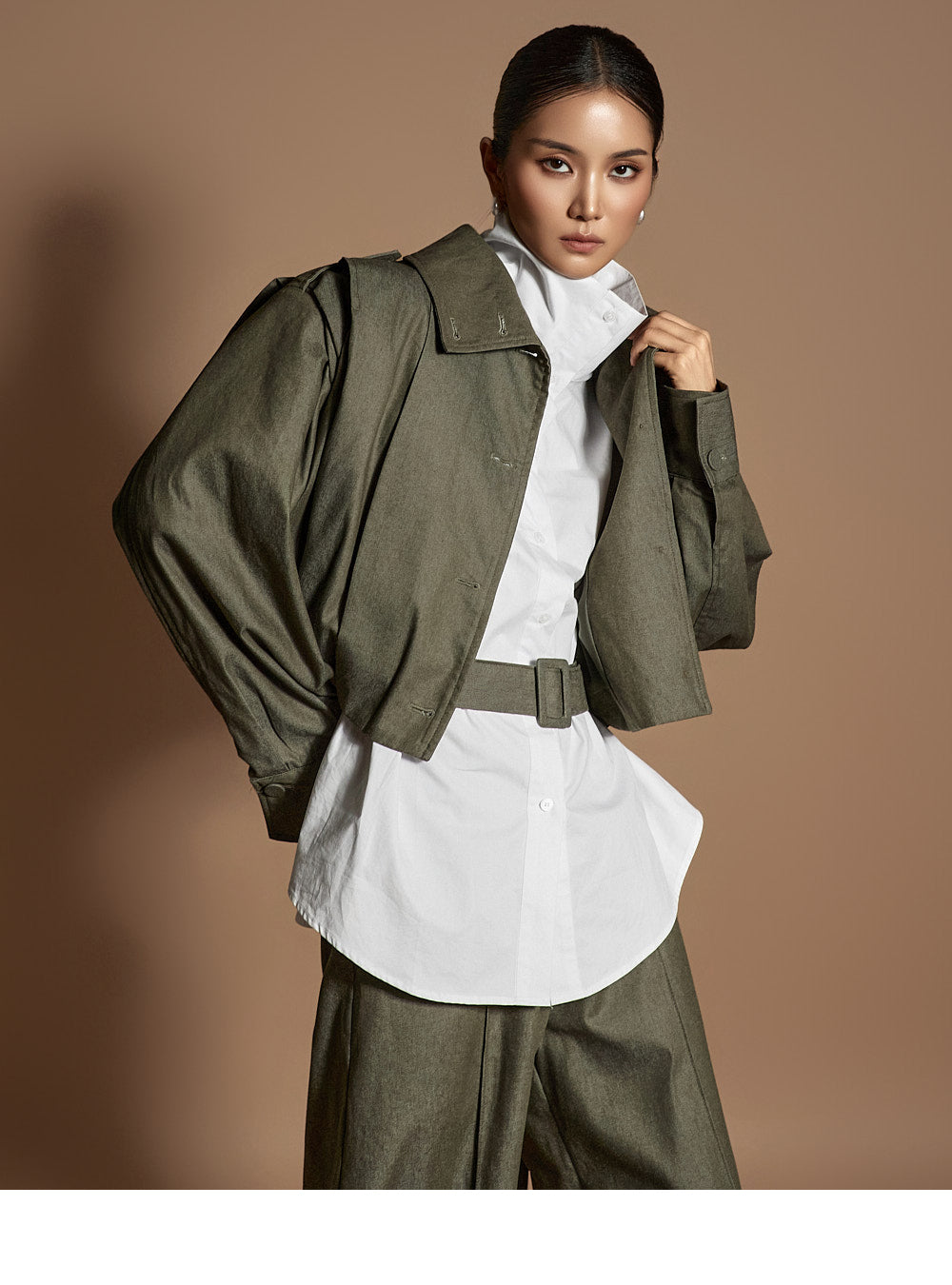 or the collar can be worn upright, allowing for versatile styling.
