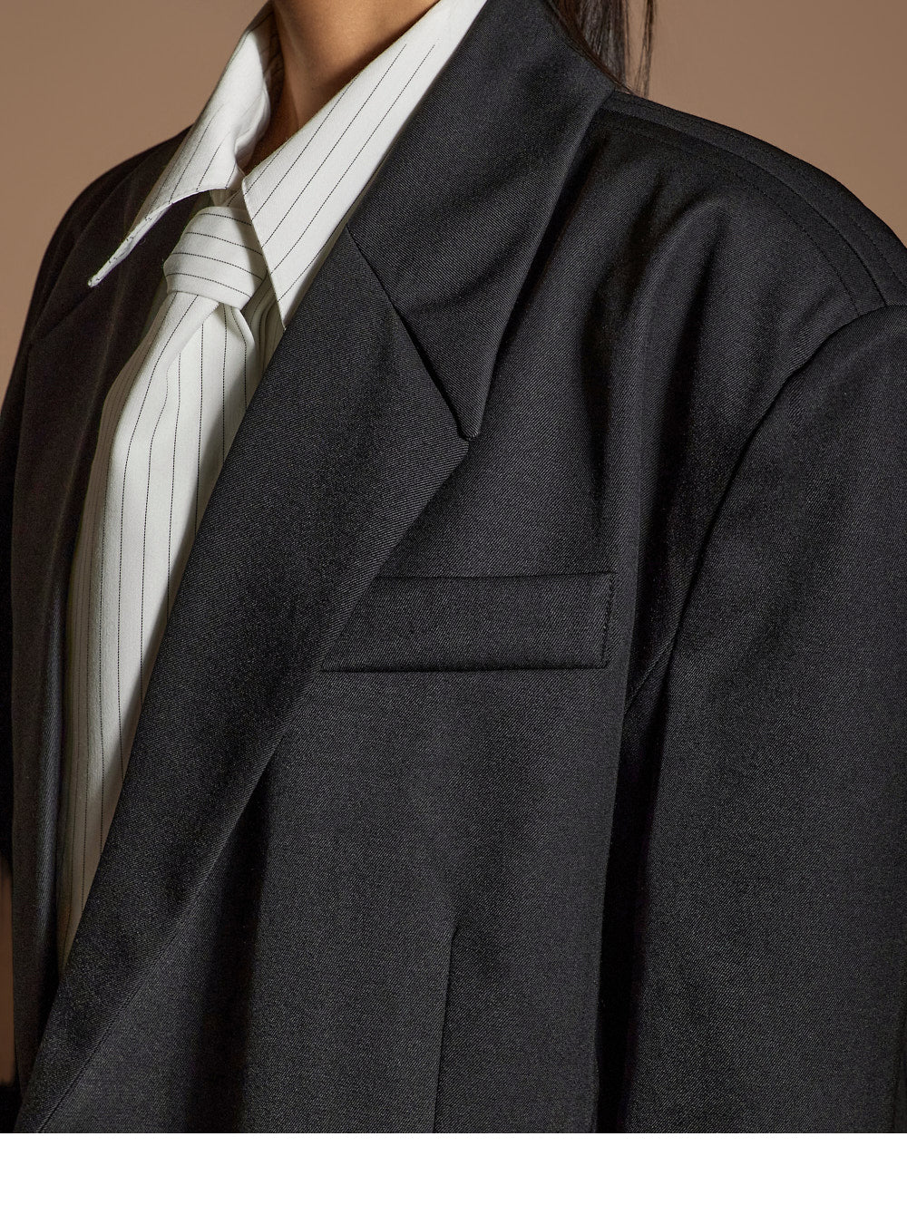 The shirt features a cropped design with shoulder pads for a structured fit,