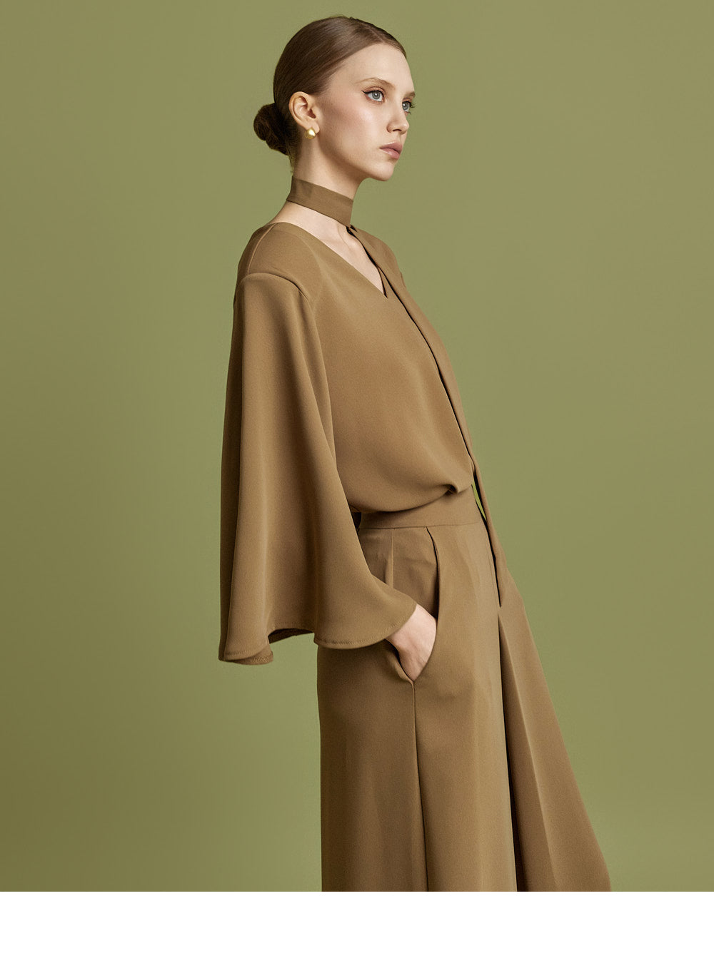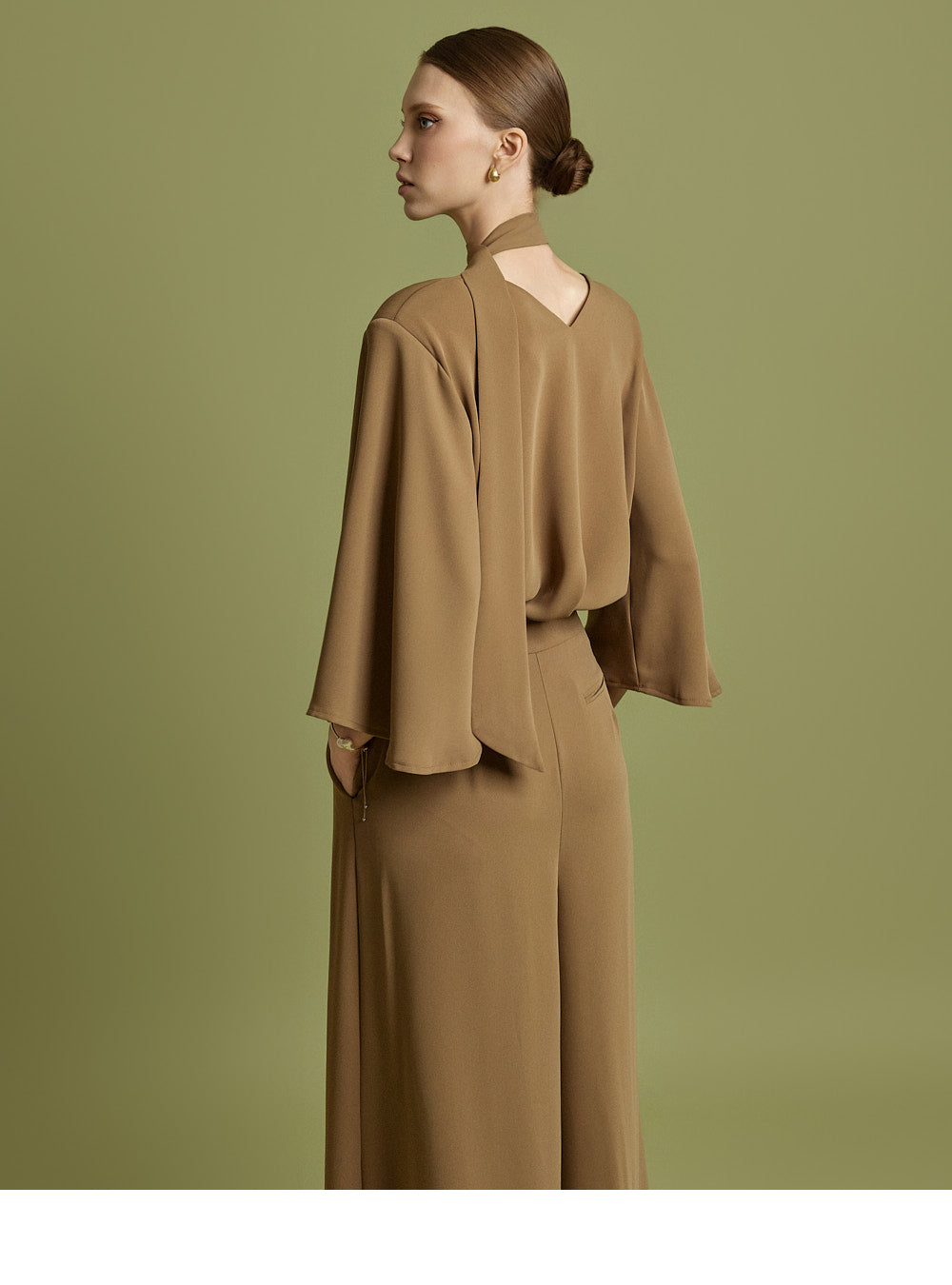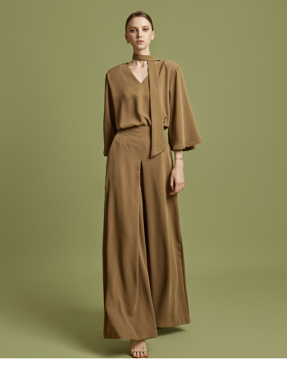The V-neckline creates a sophisticated silhouette,