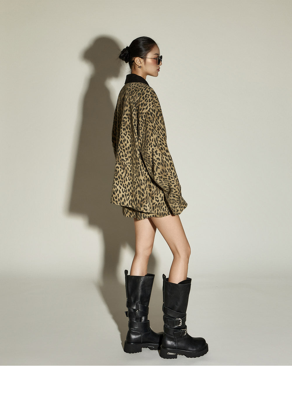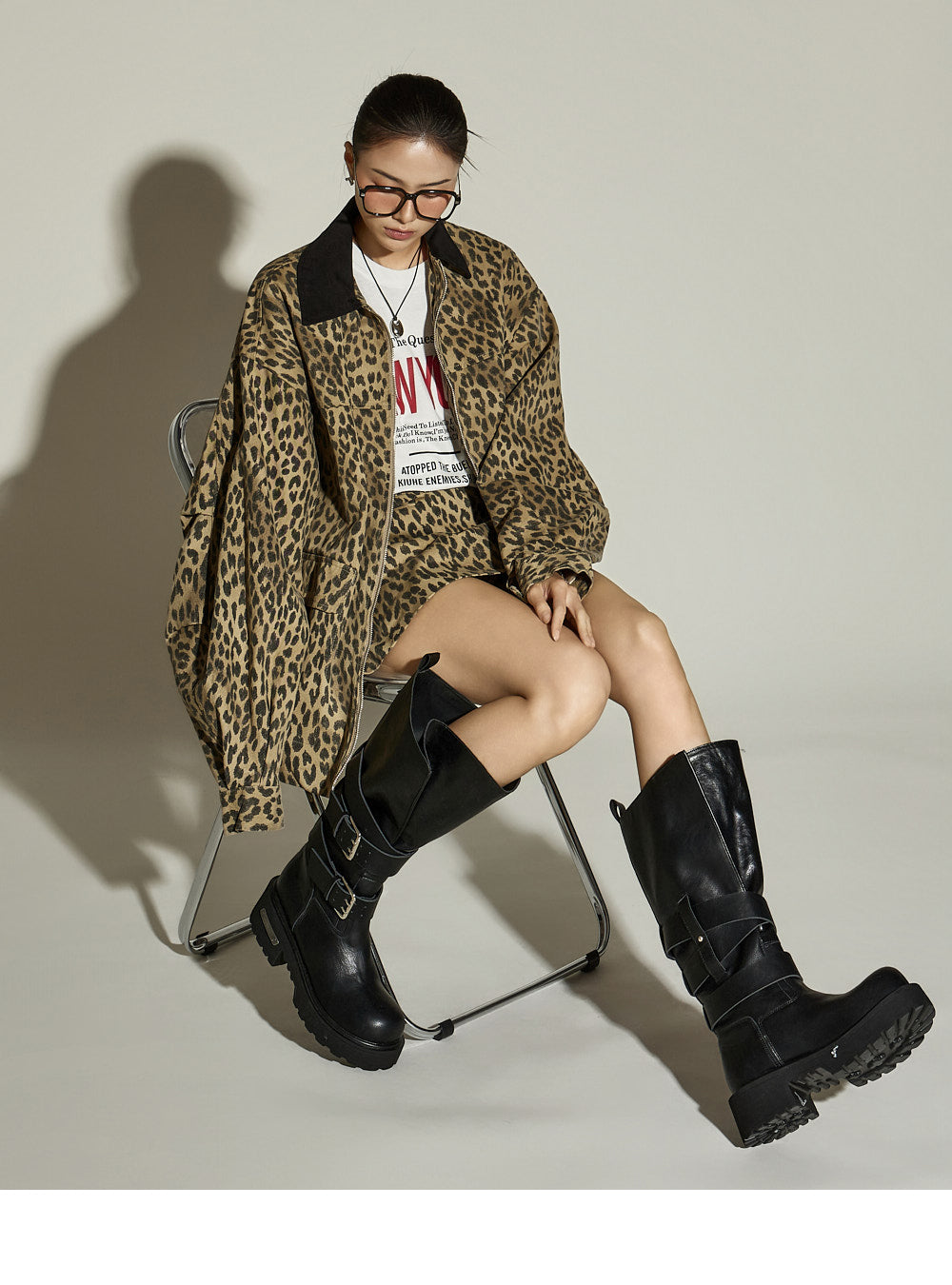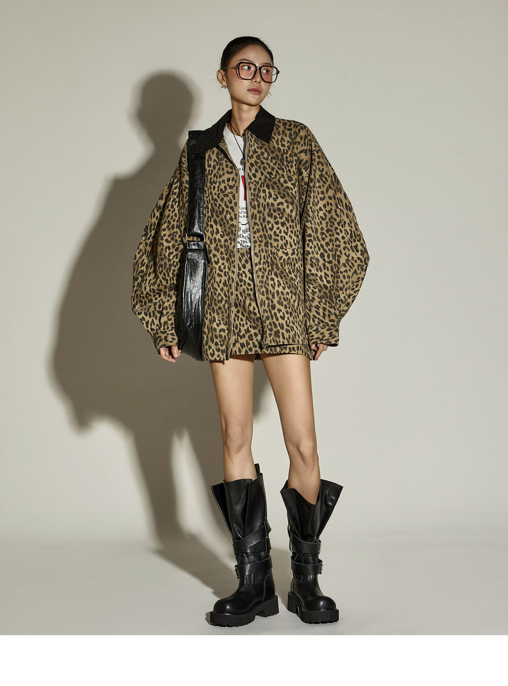 The skirt is a mini-length with a leopard print pattern,