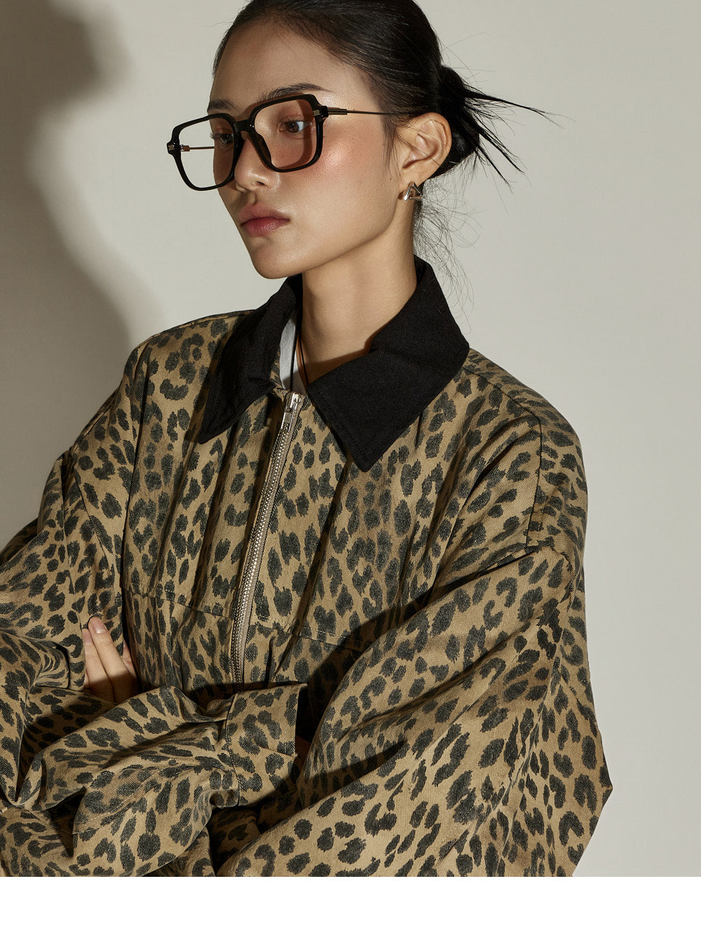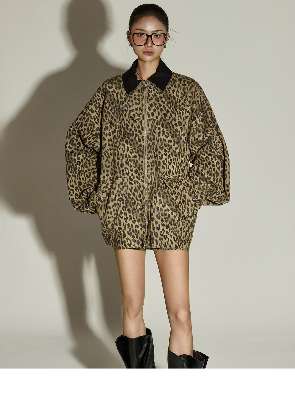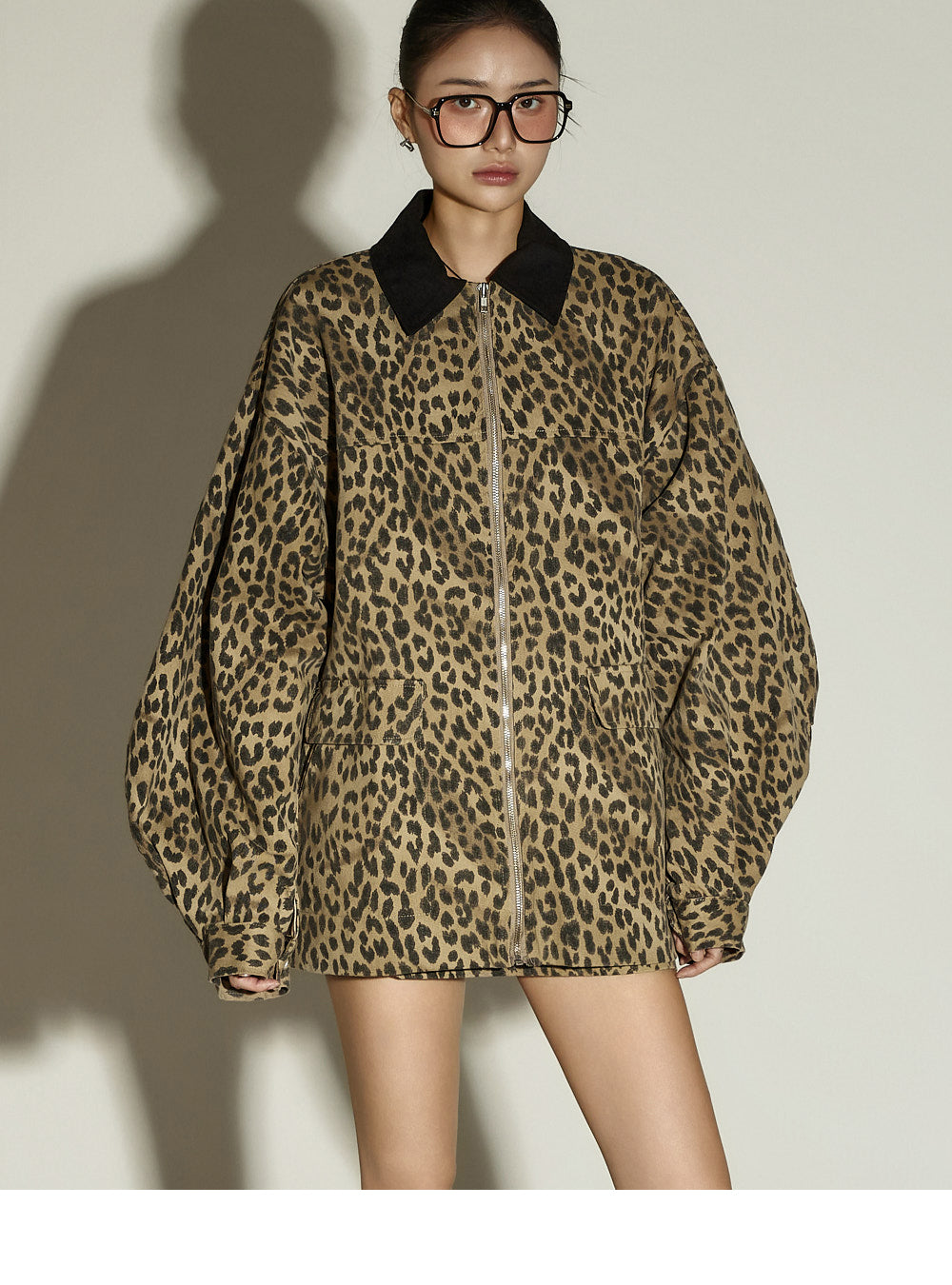 The jacket features an oversized design with a contrasting collar detail,