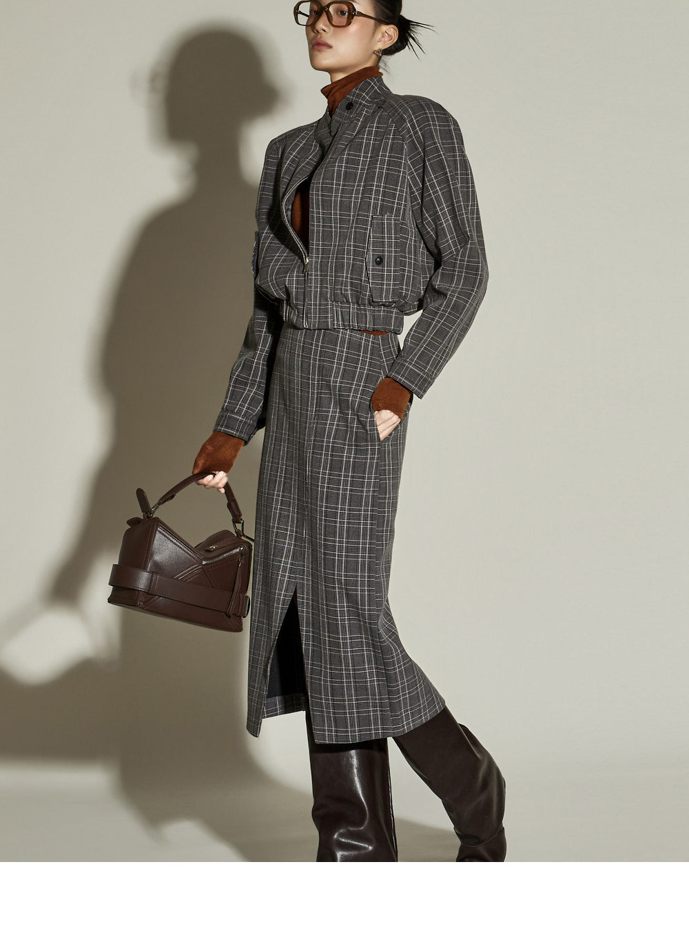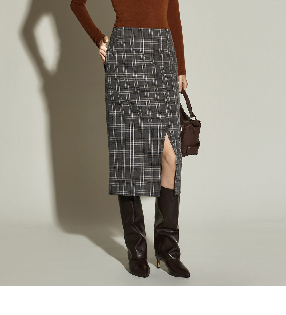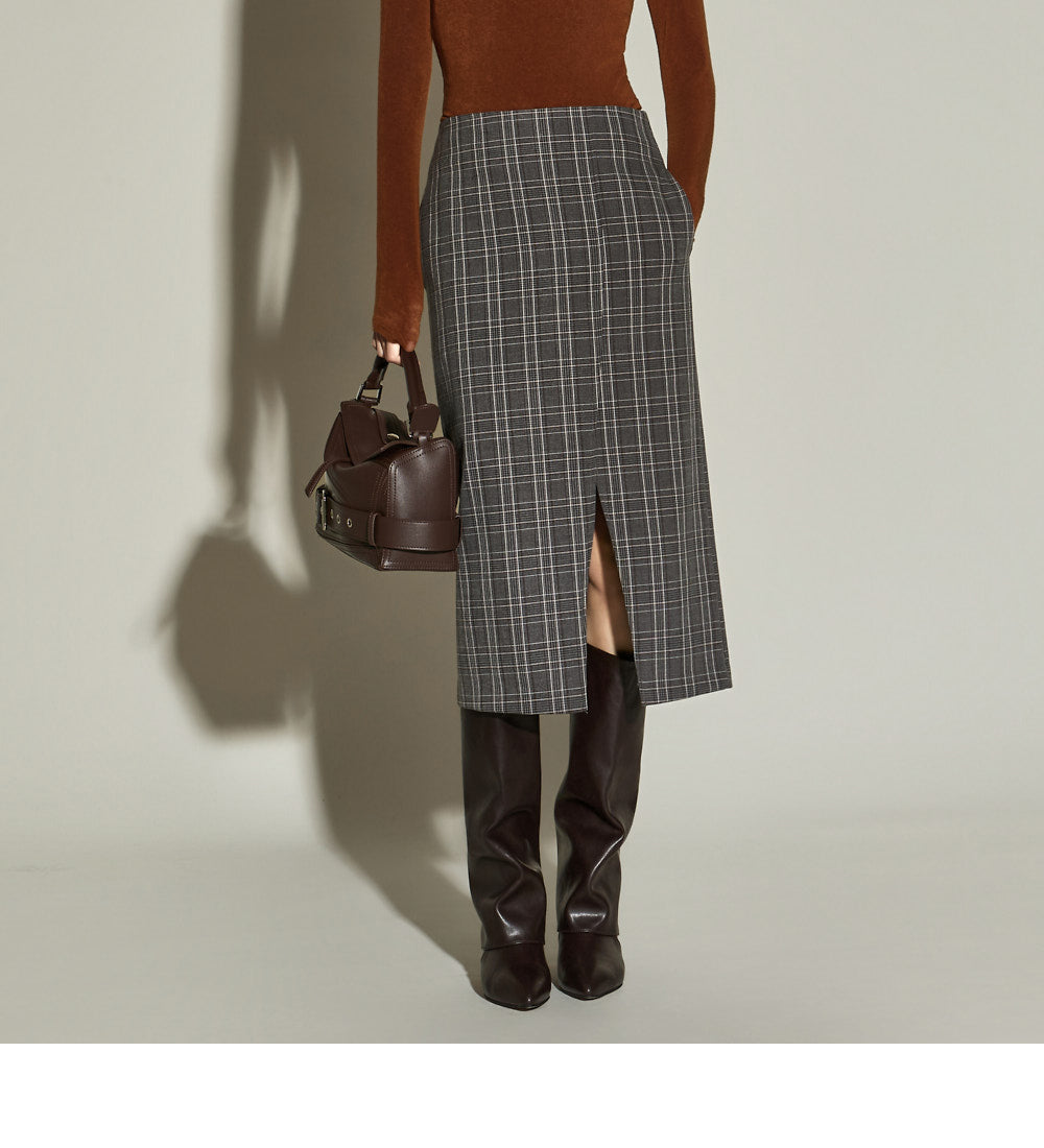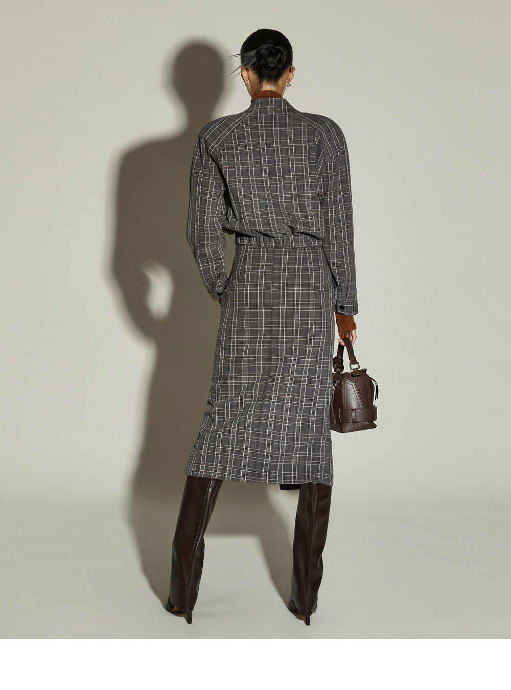 The skirt, with its H-line midi length, creates a neat silhouette,
