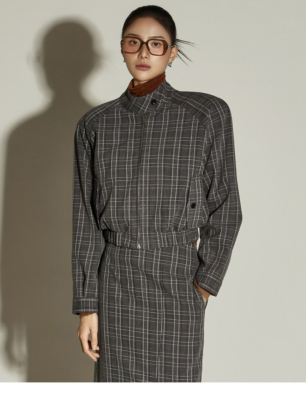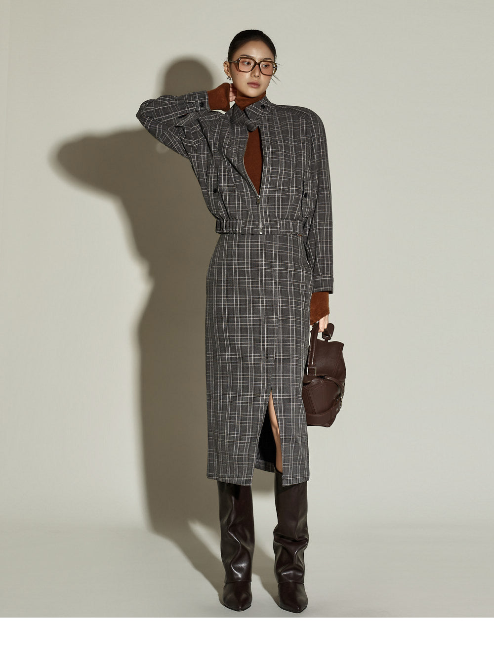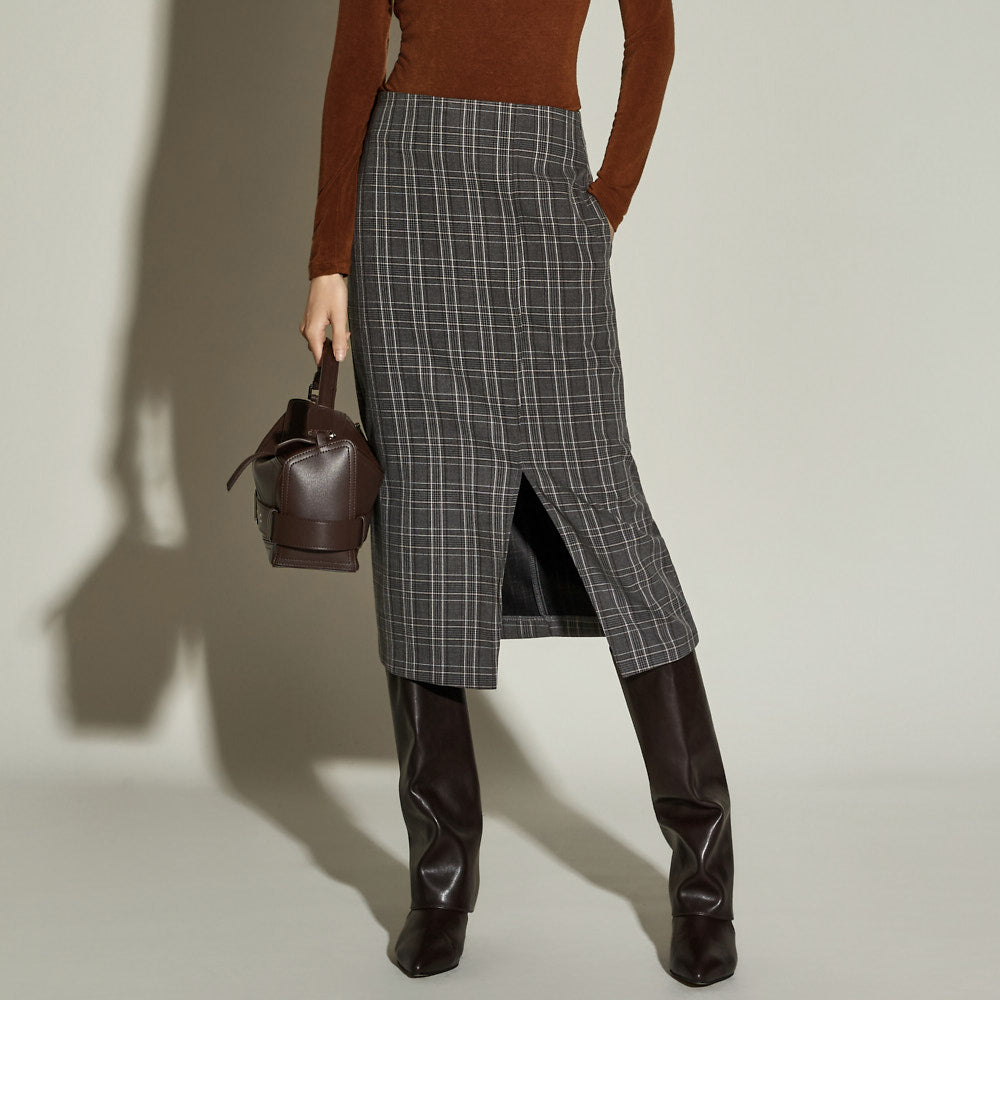 The skirt, with its H-line midi length, creates a neat silhouette,