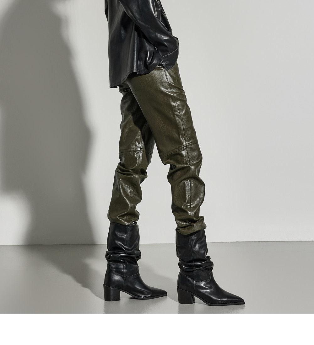 The pants feature a slim-fit silhouette with a low waist, providing a trendy feel,