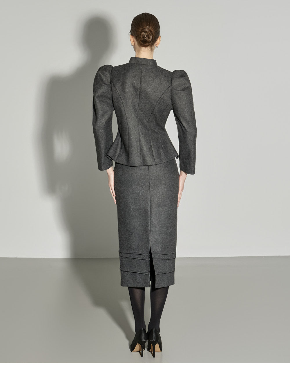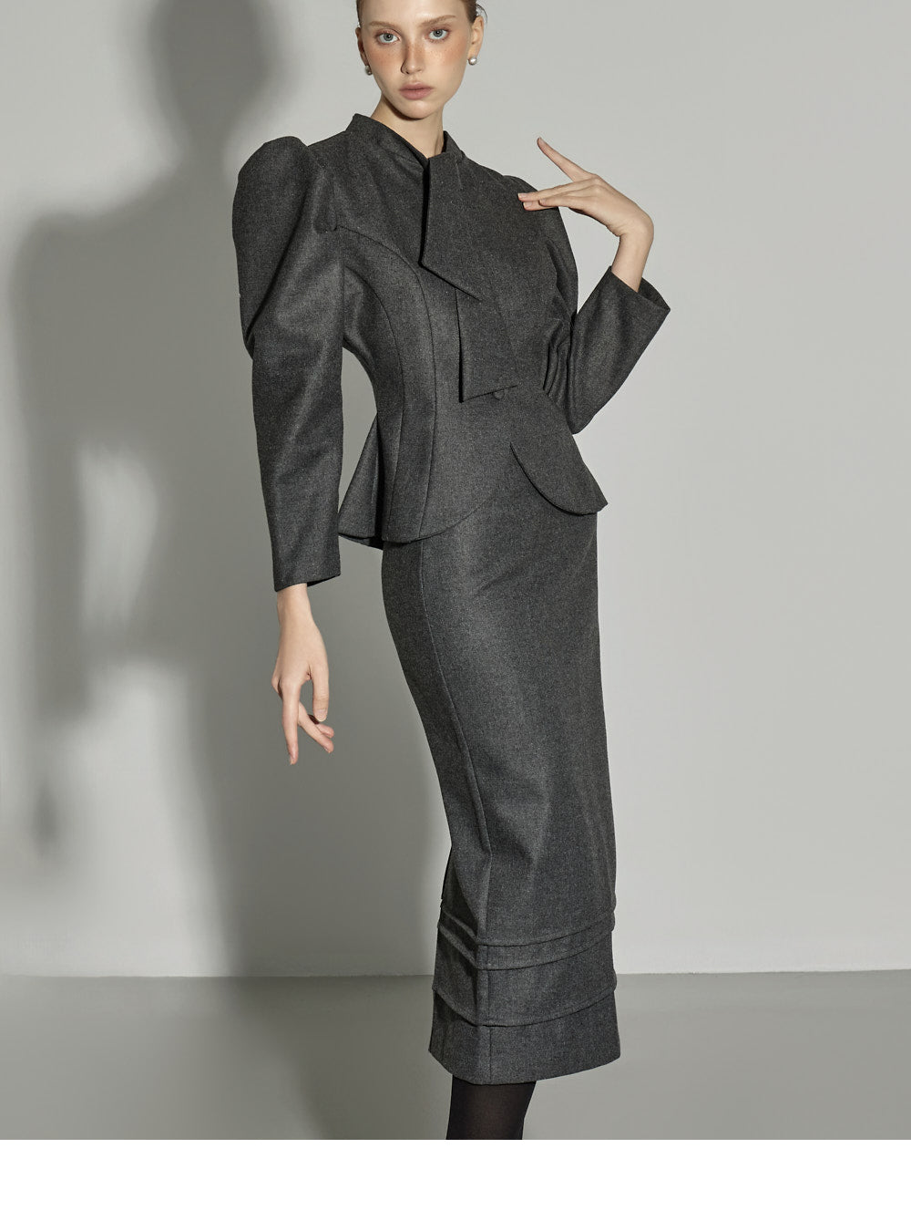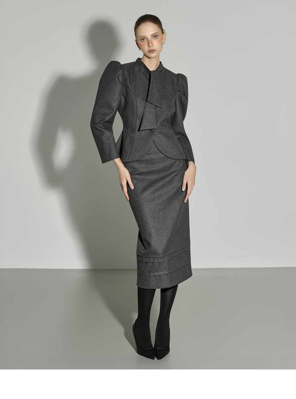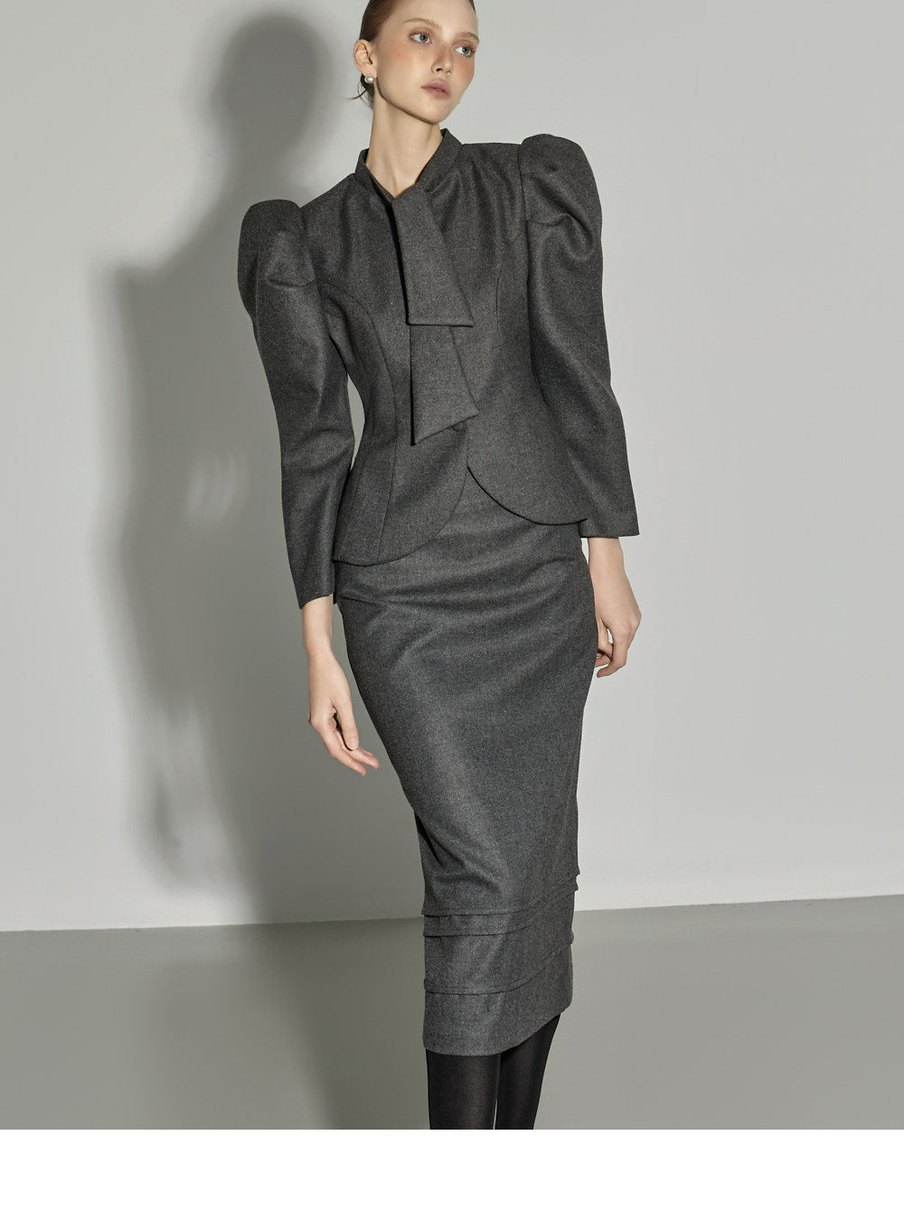 Model (174cm) is wearing size S jacket and size S skirt, CHARCOAL color.