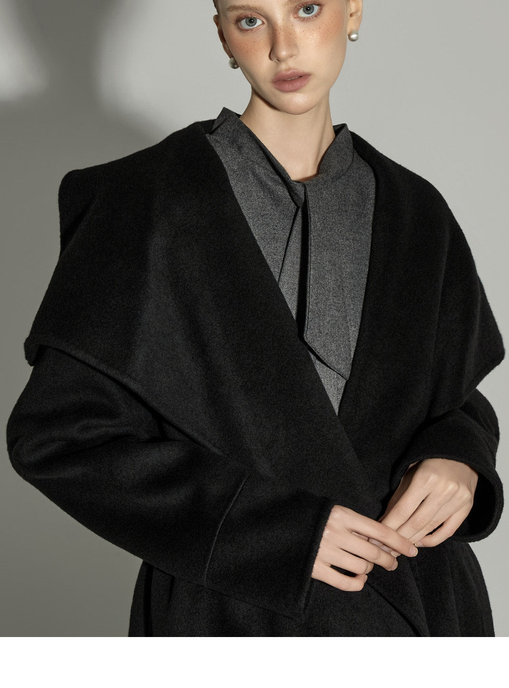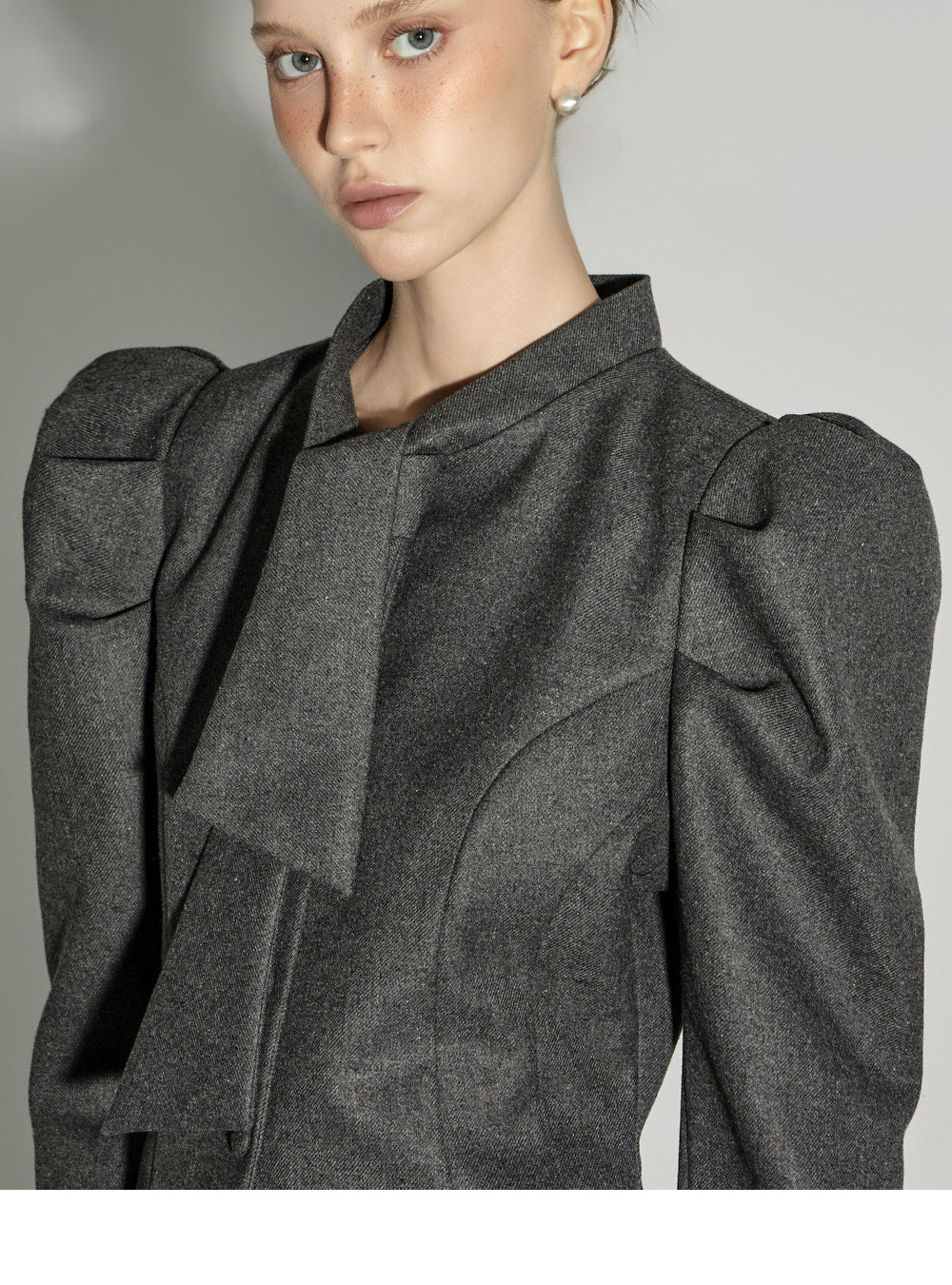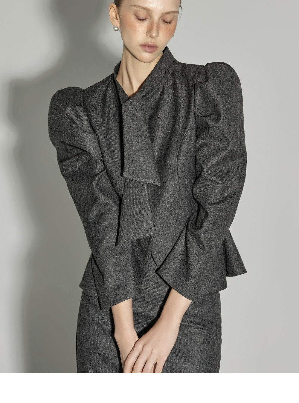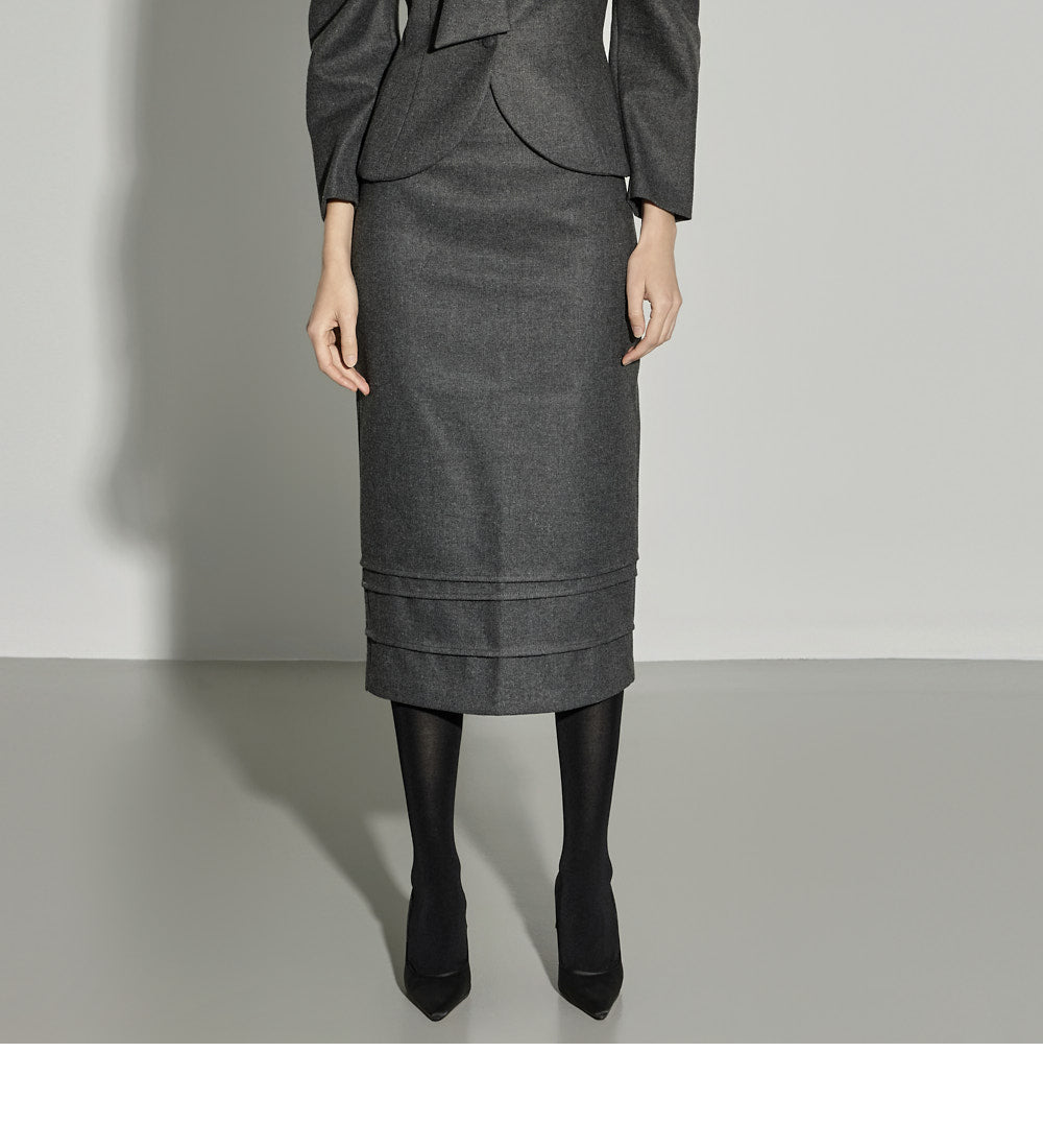 Model (174cm) is wearing size S jacket and size S skirt, CHARCOAL color.