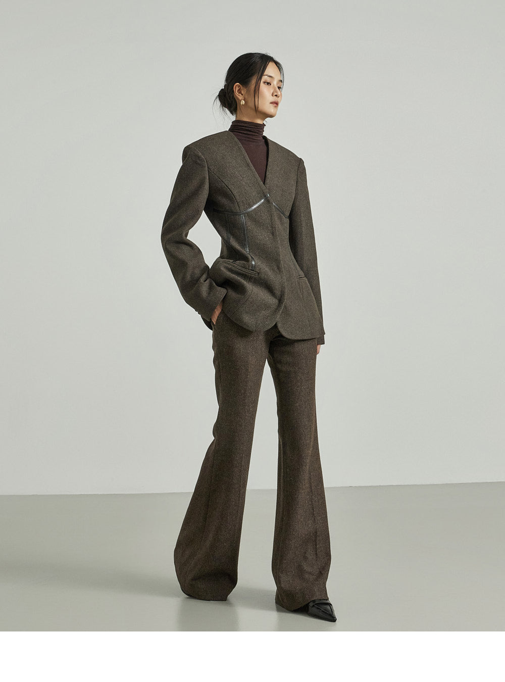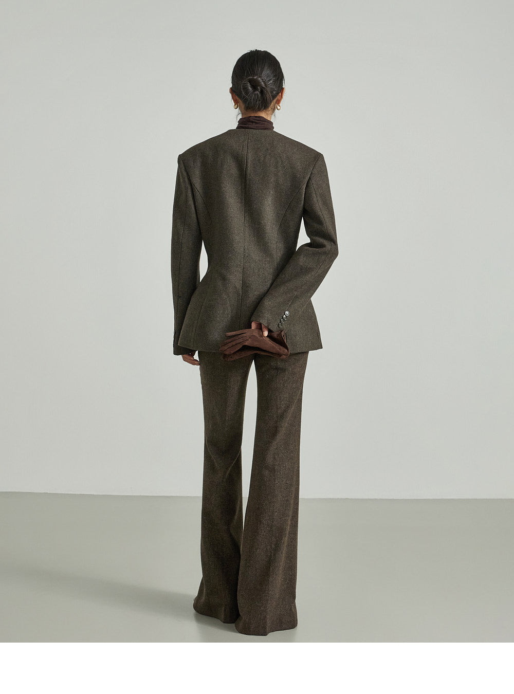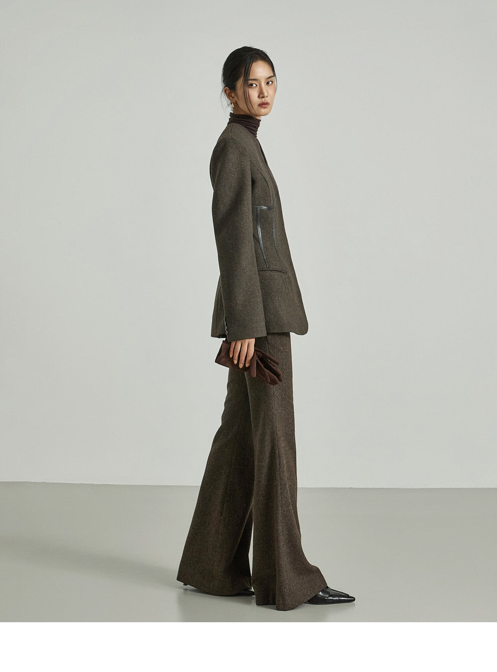 Model (173cm) wears jacket ONE and pants size S, DARK BROWN.