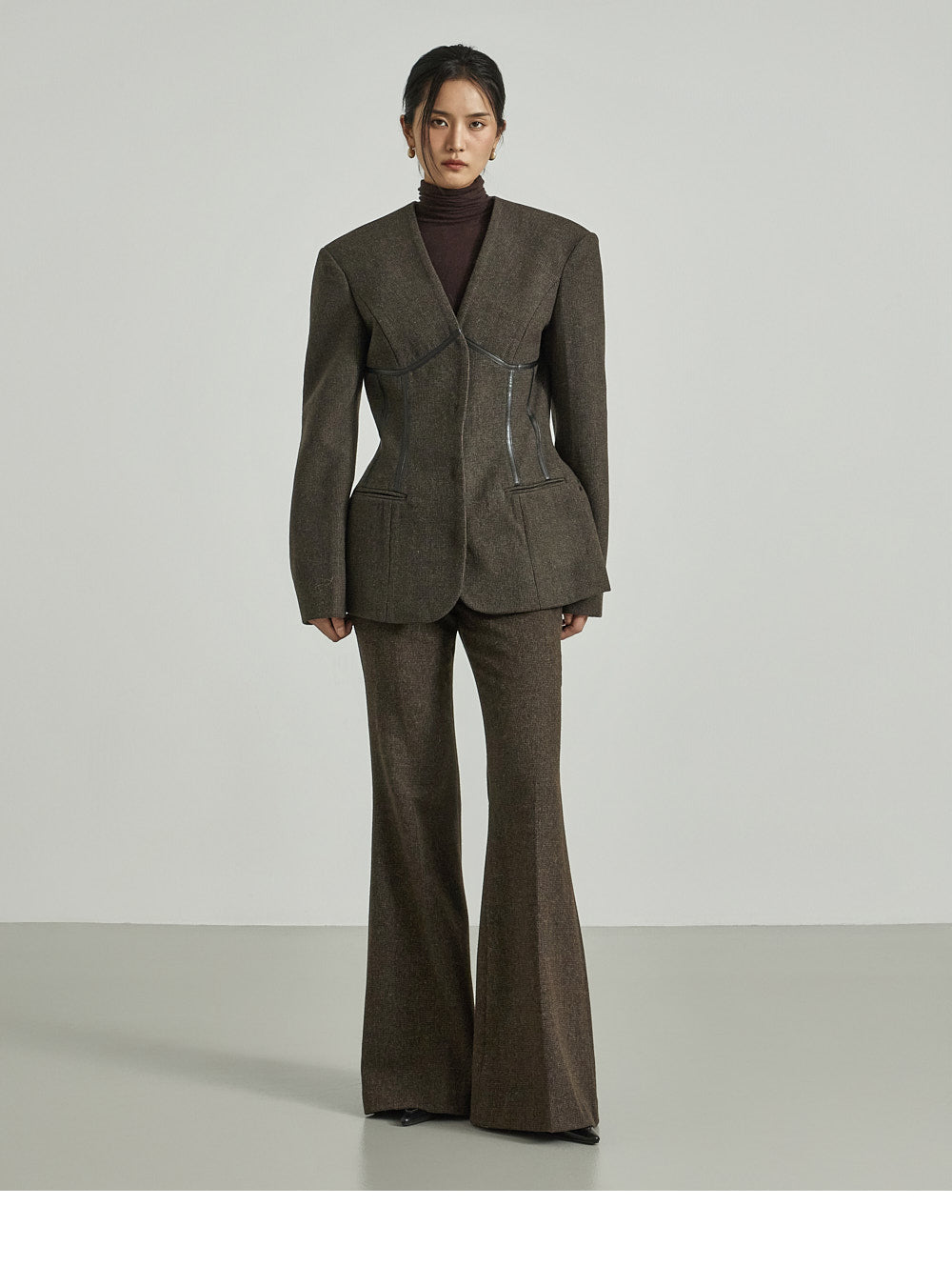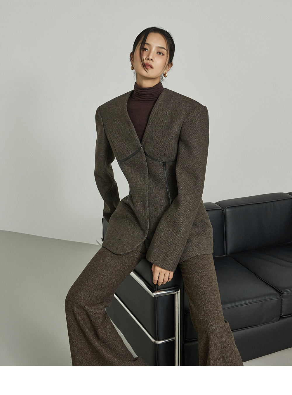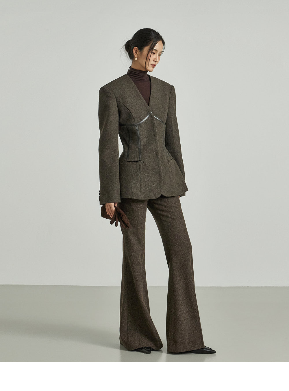Model (173cm) wears jacket ONE and pants size S, DARK BROWN.