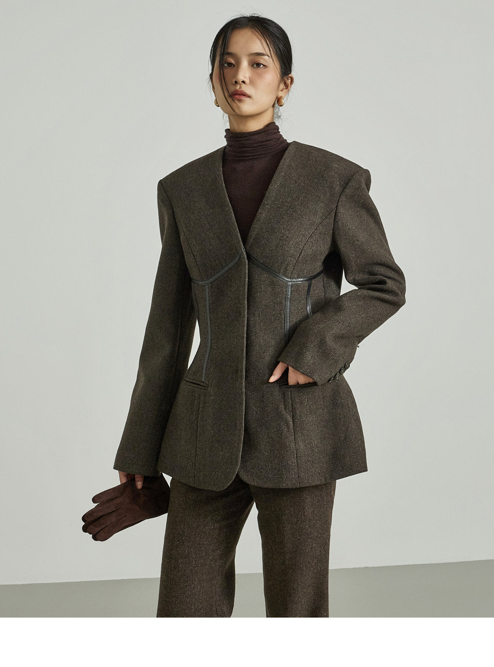 while the no-collar design and moderate shoulder pads create a structured silhouette.