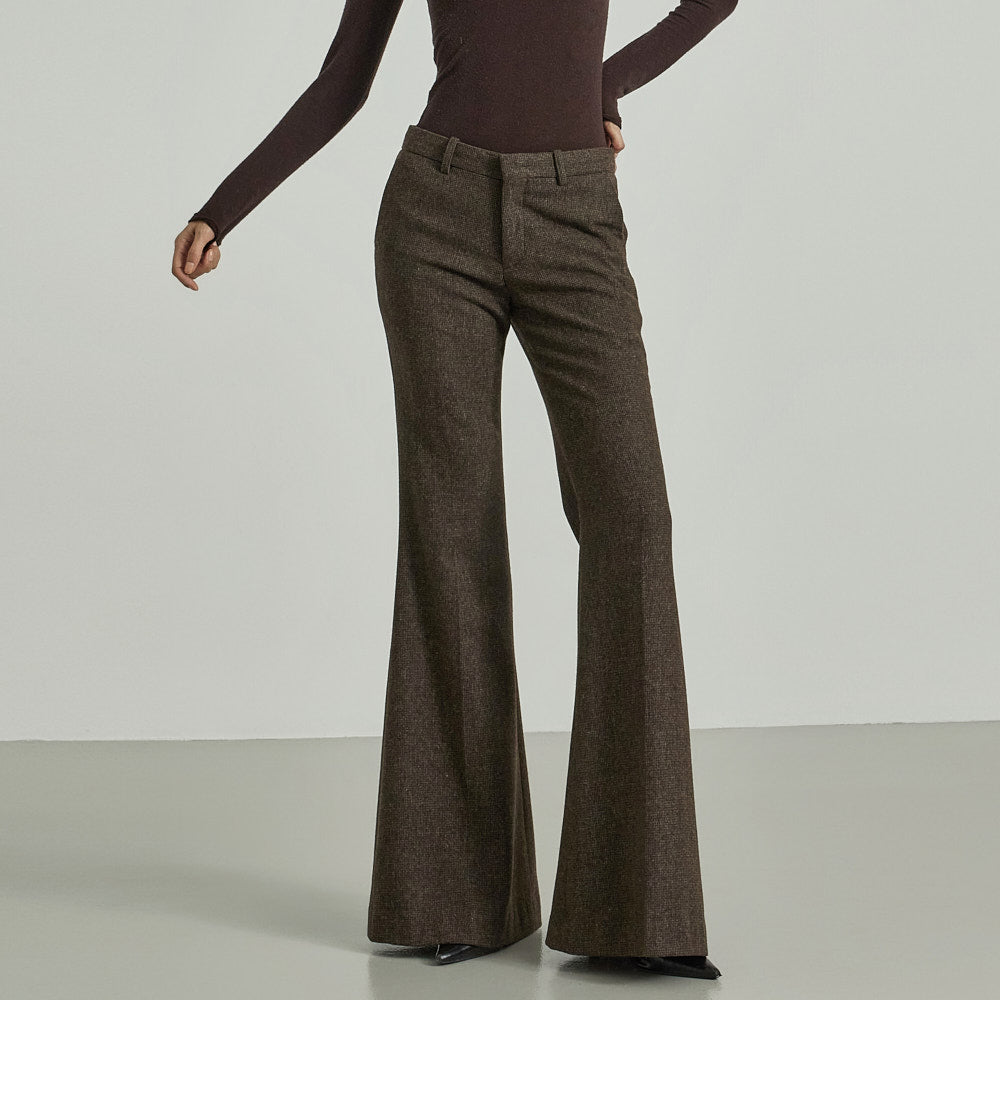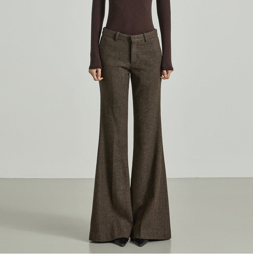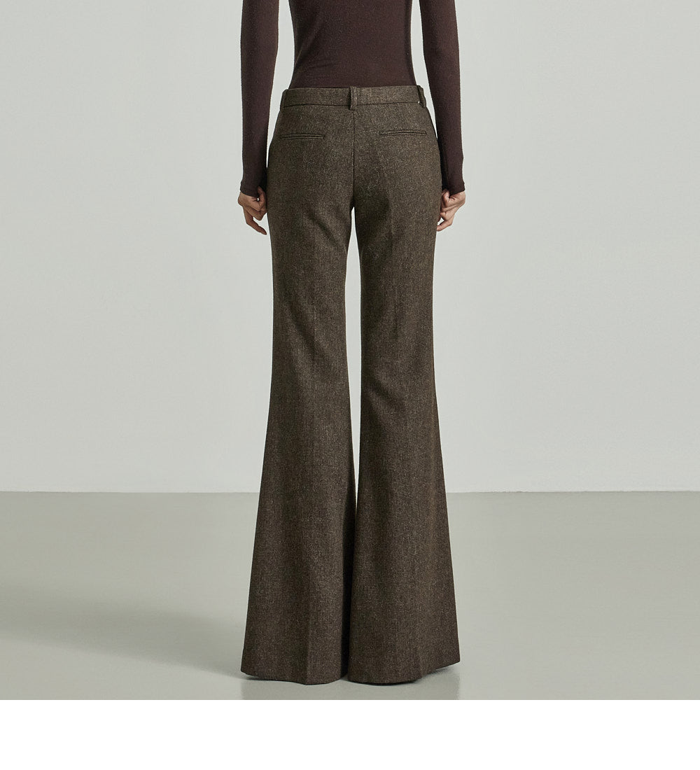 The pants feature a low-rise design with a sophisticated bootcut silhouette,