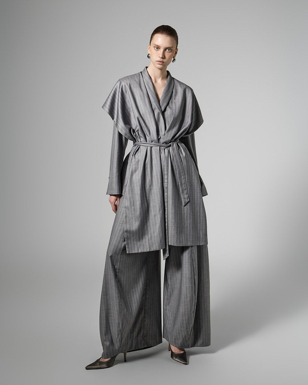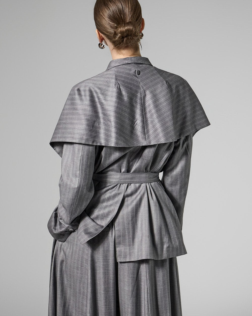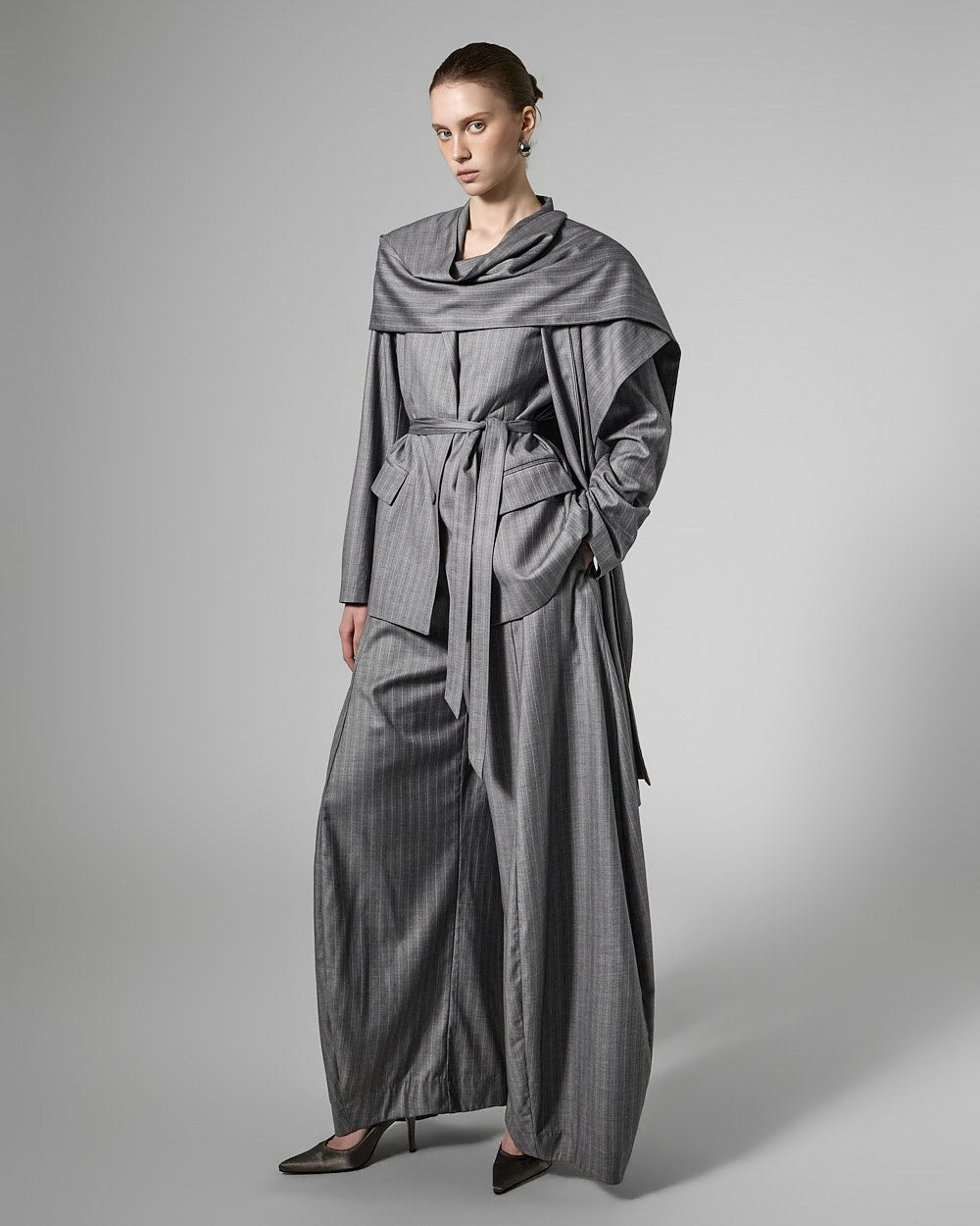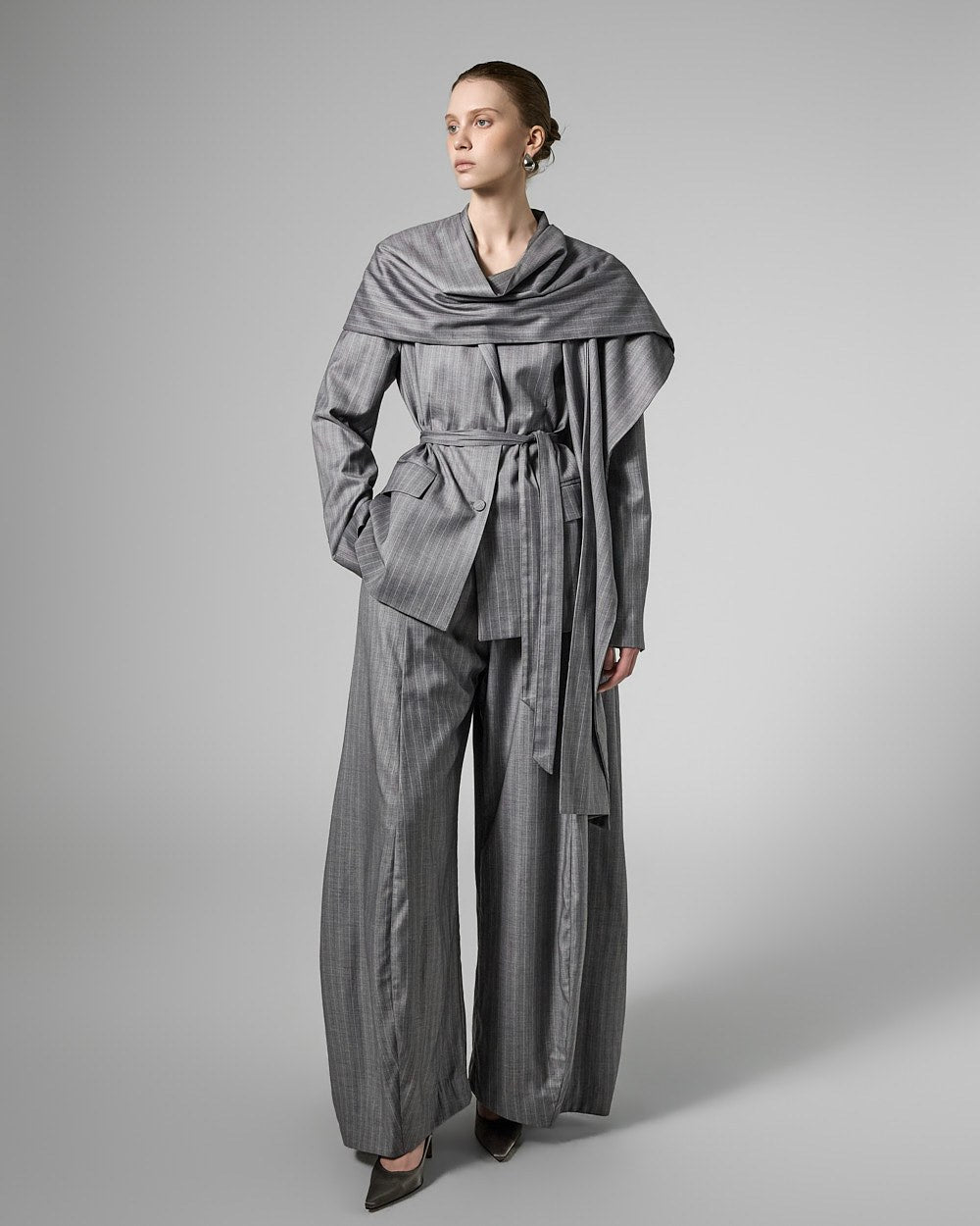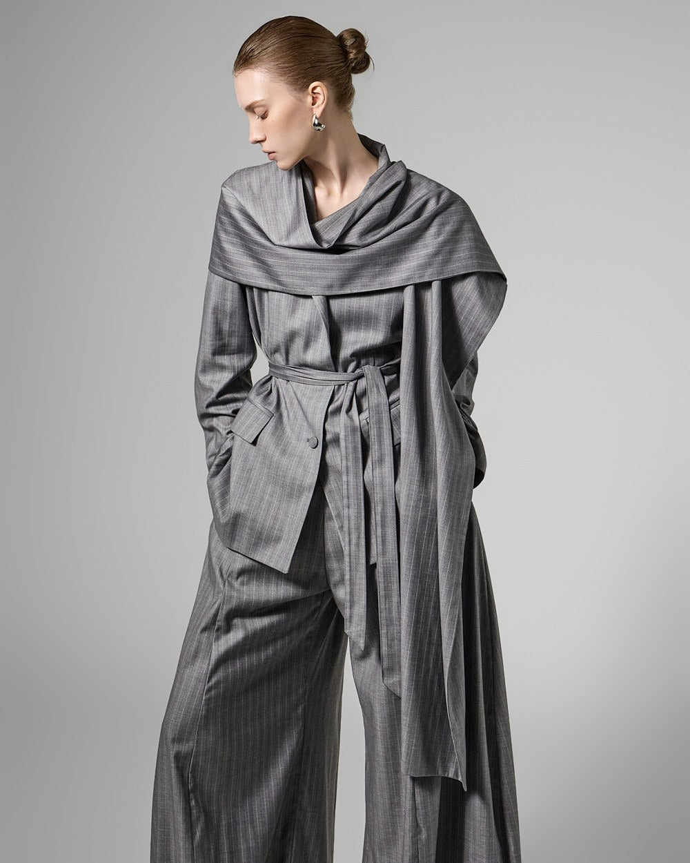 The jacket features a waist strap and a detachable long scarf detail,