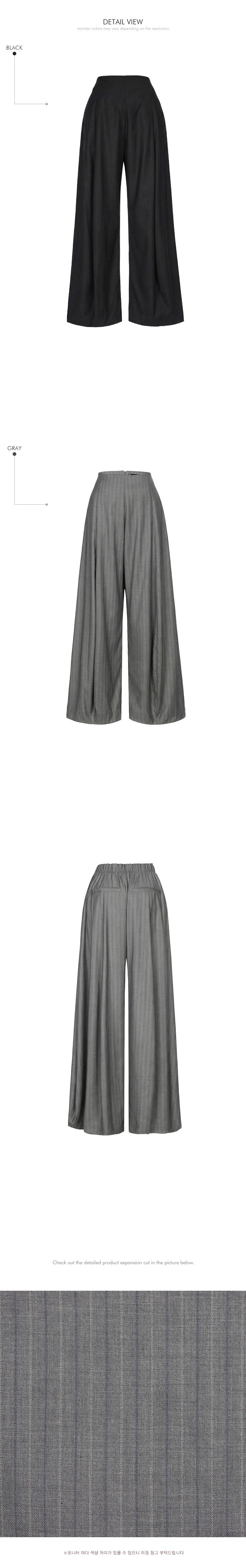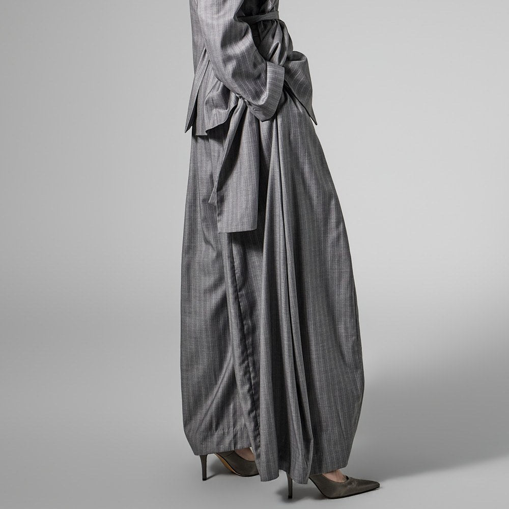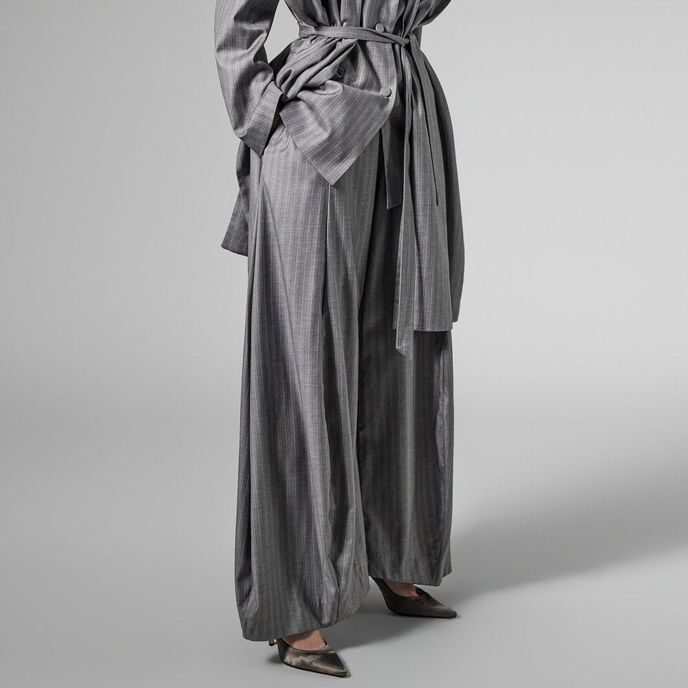 The slacks have a wide balloon fit,