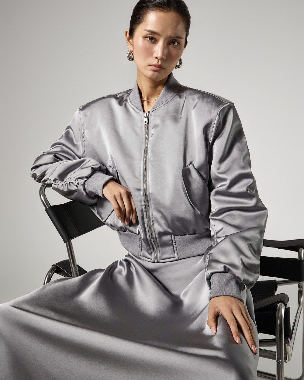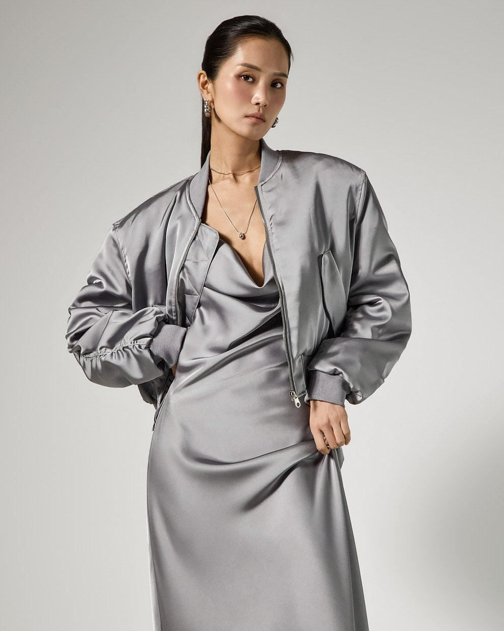 This is a bomber jumper and dress set with a sophisticated mood.