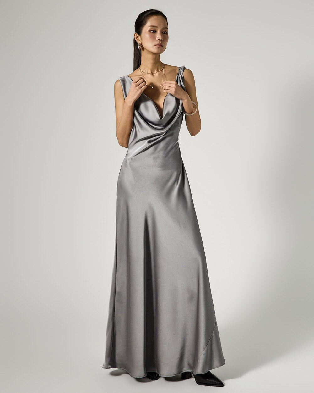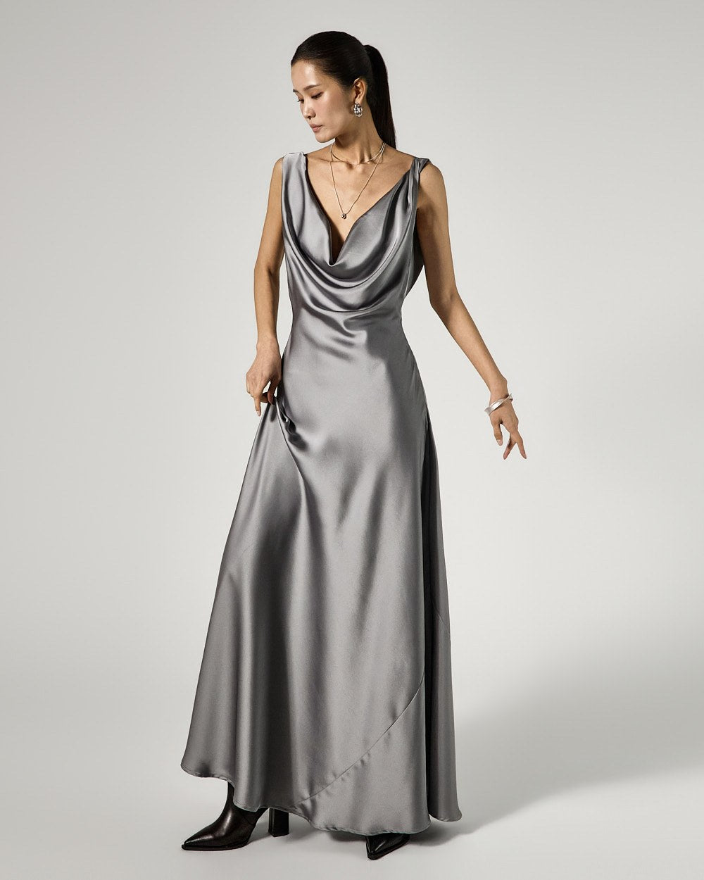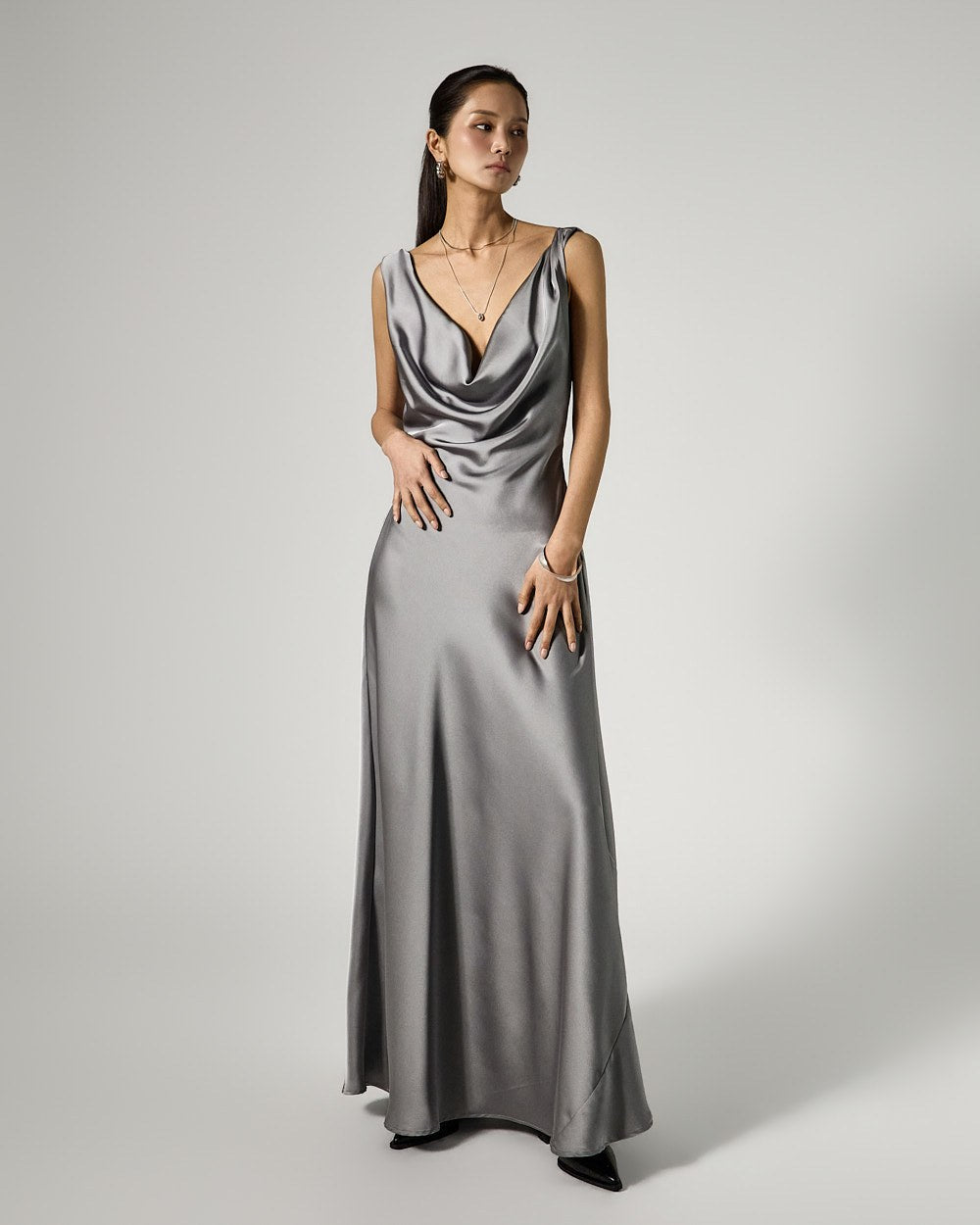 The dress features a drape cowl neck design that flows along the neckline,