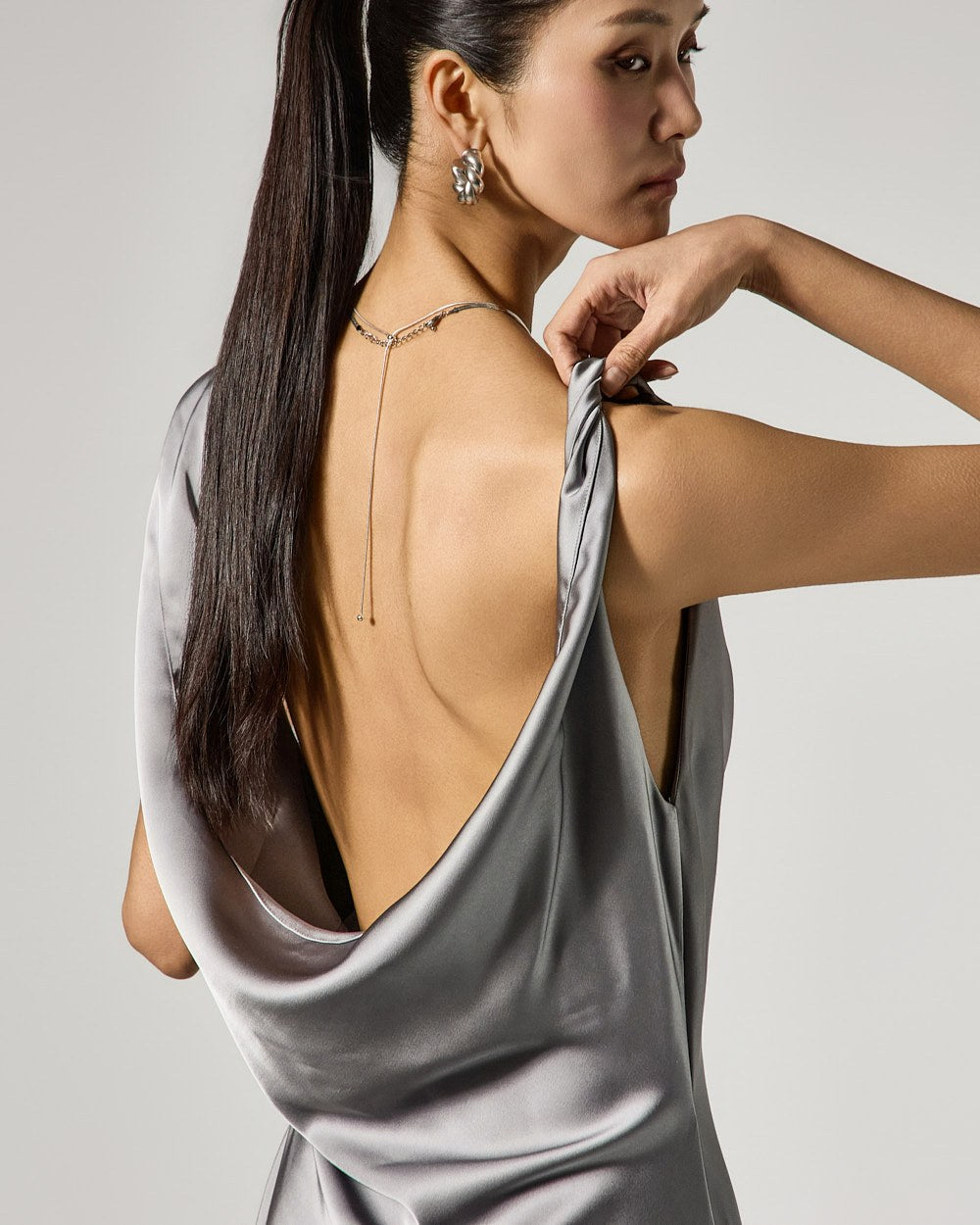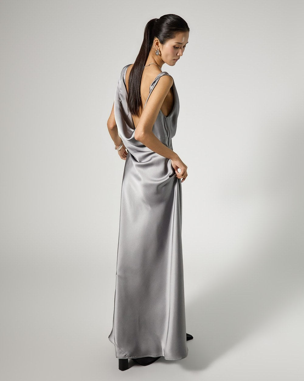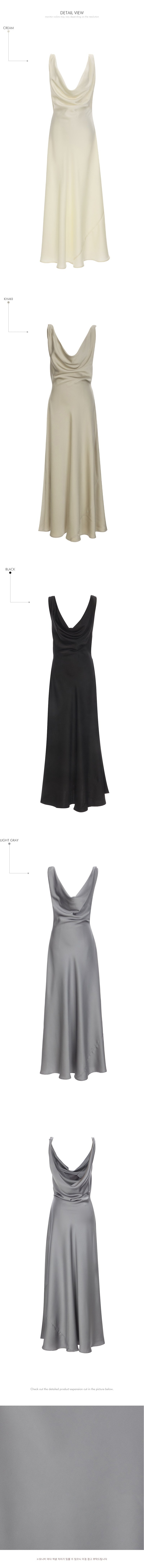 The dress features a drape cowl neck design that flows along the neckline,