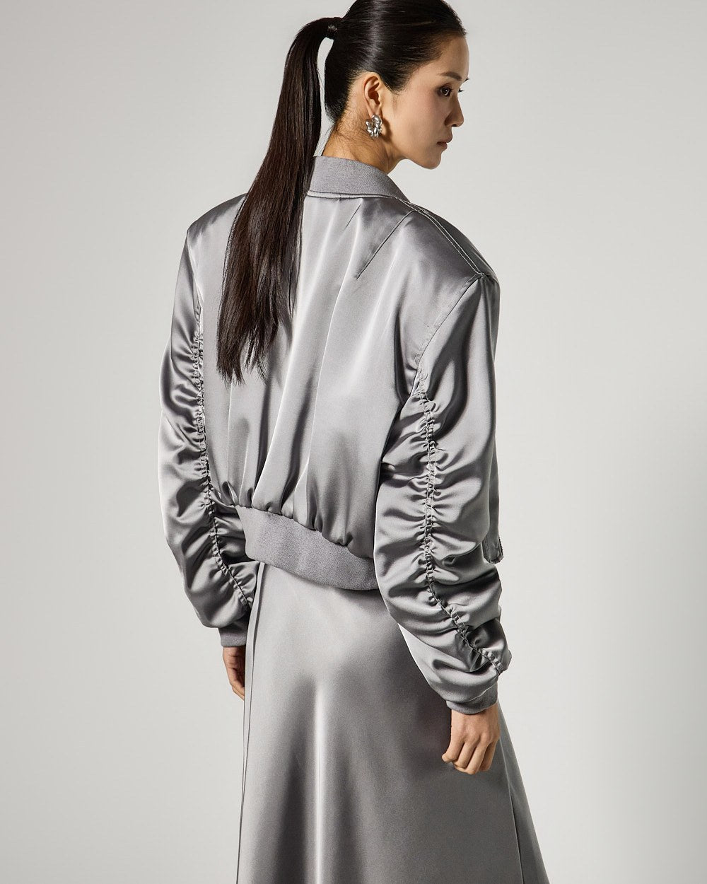 Shirring details along the sleeves add natural volume,