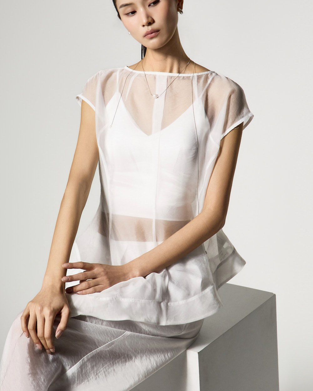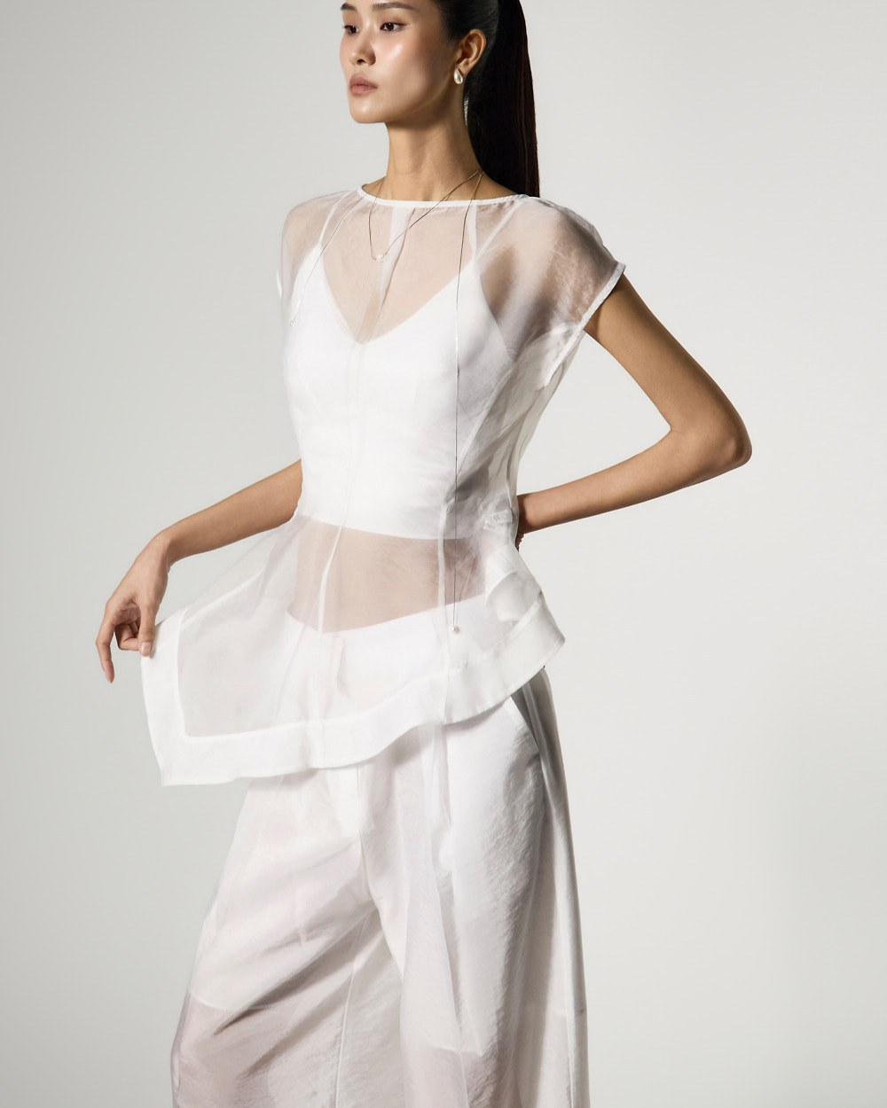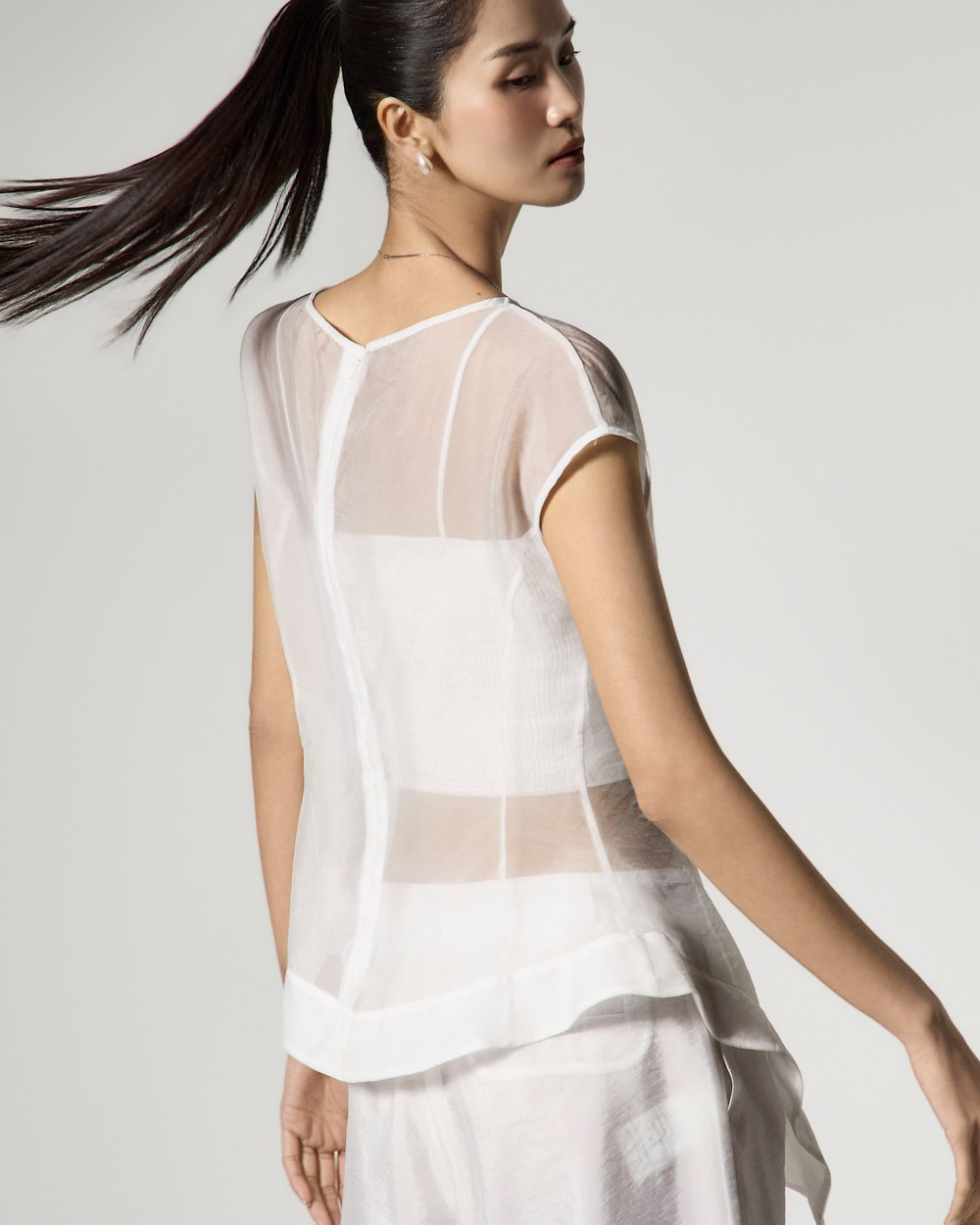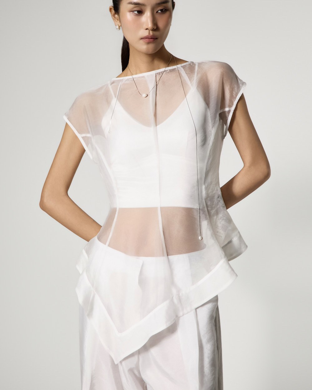 The top is a slim-fit organza blouse that