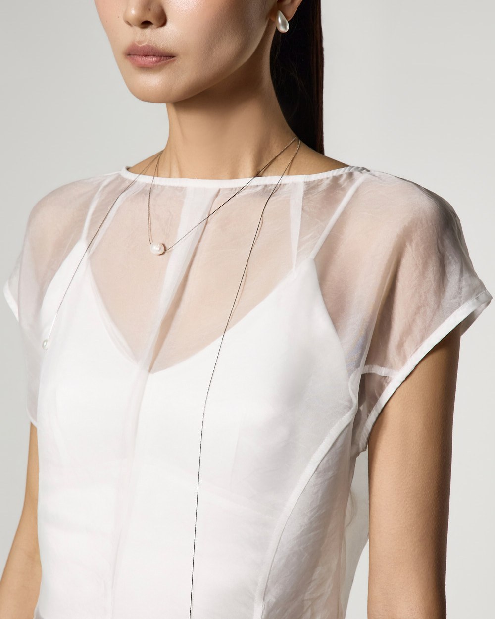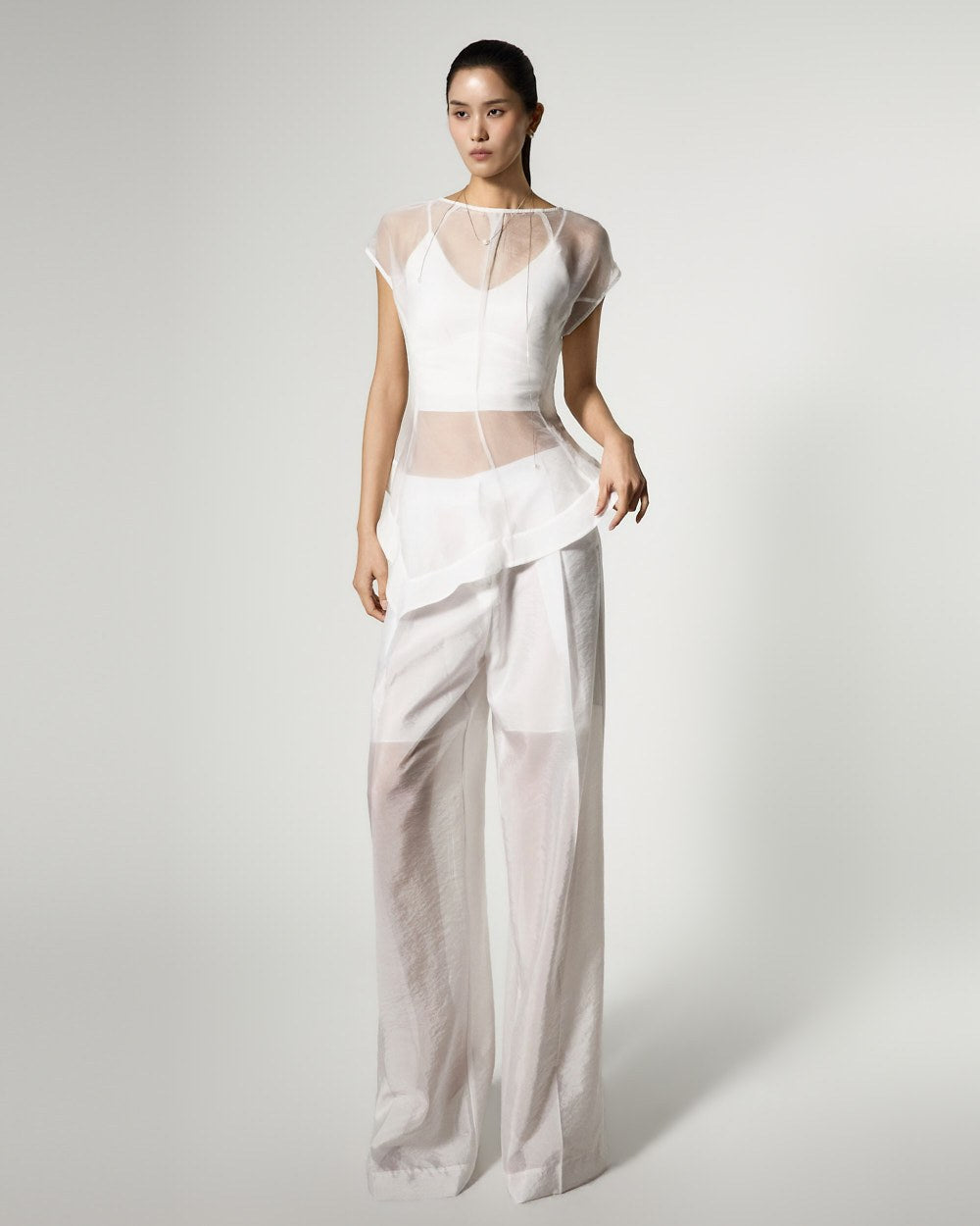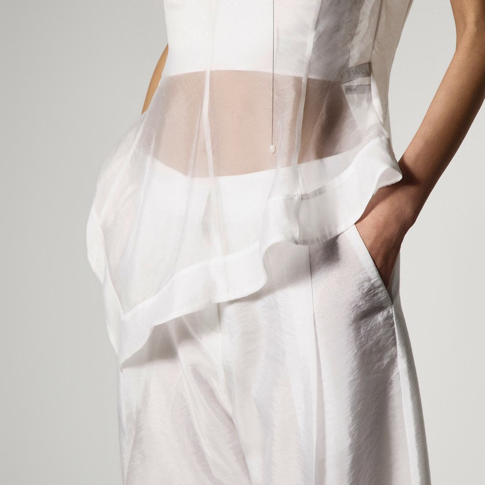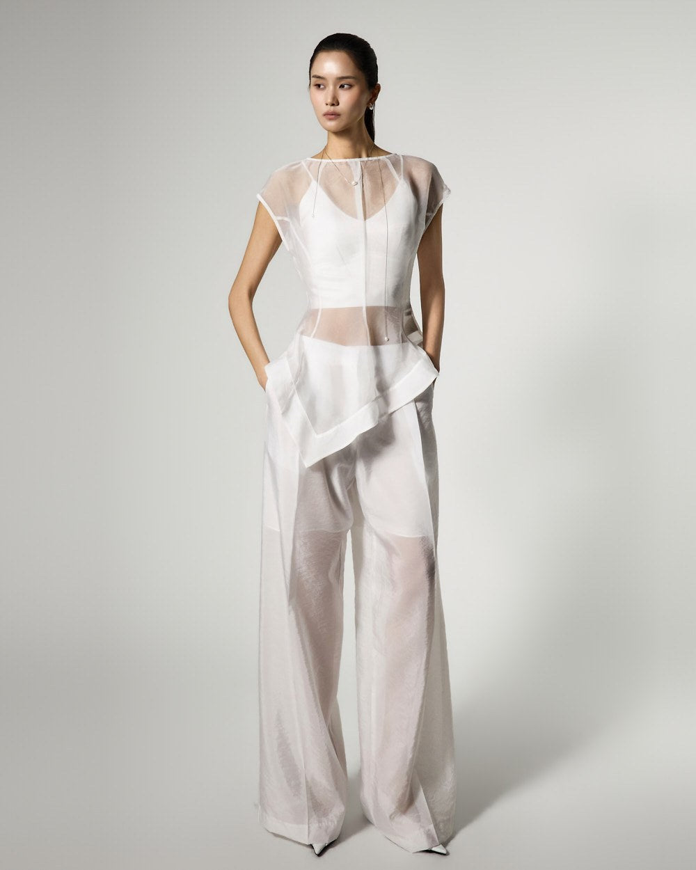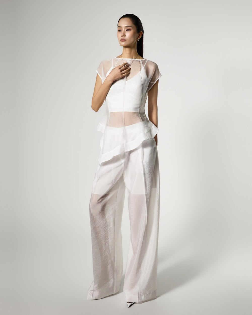 The top is a slim-fit organza blouse that