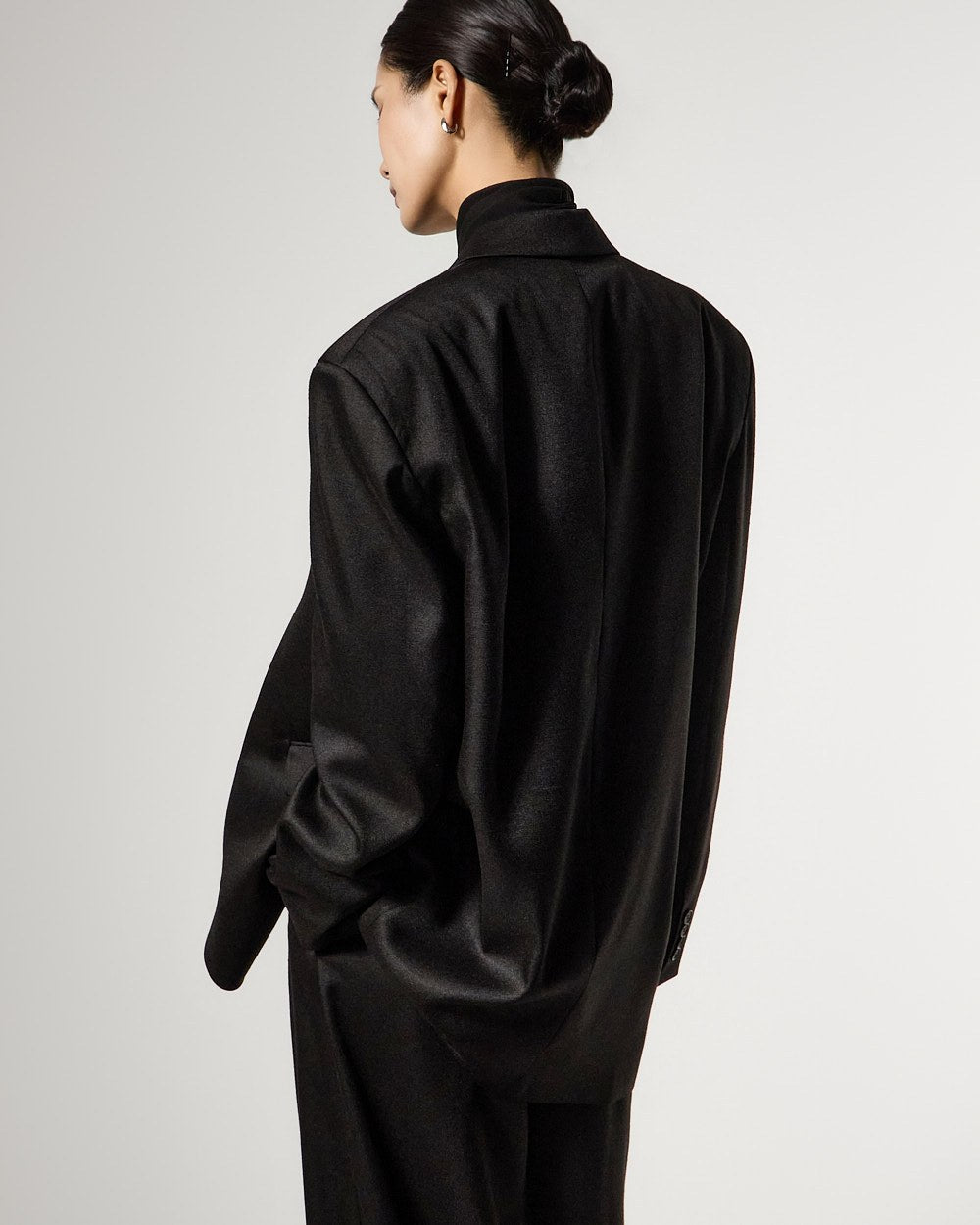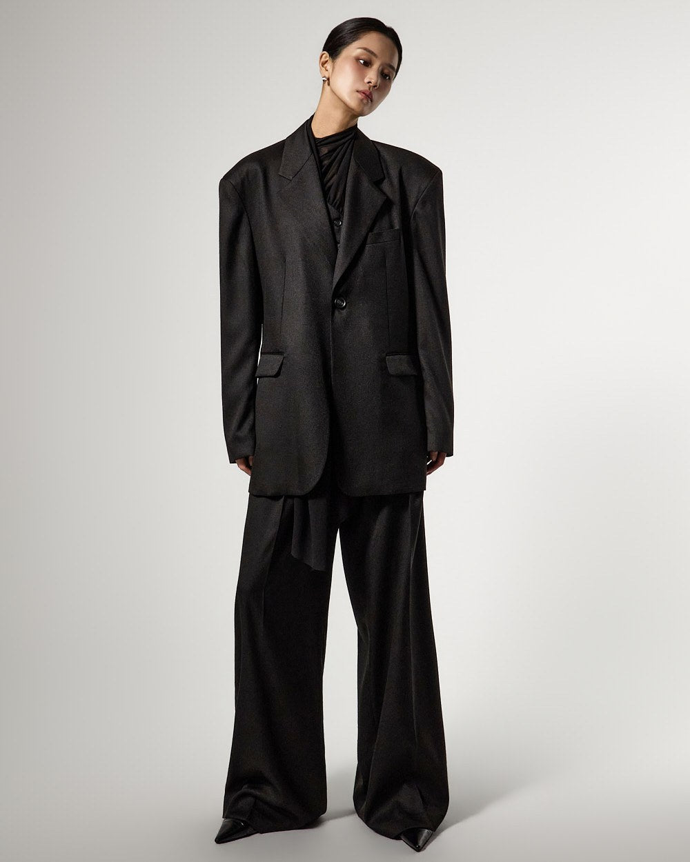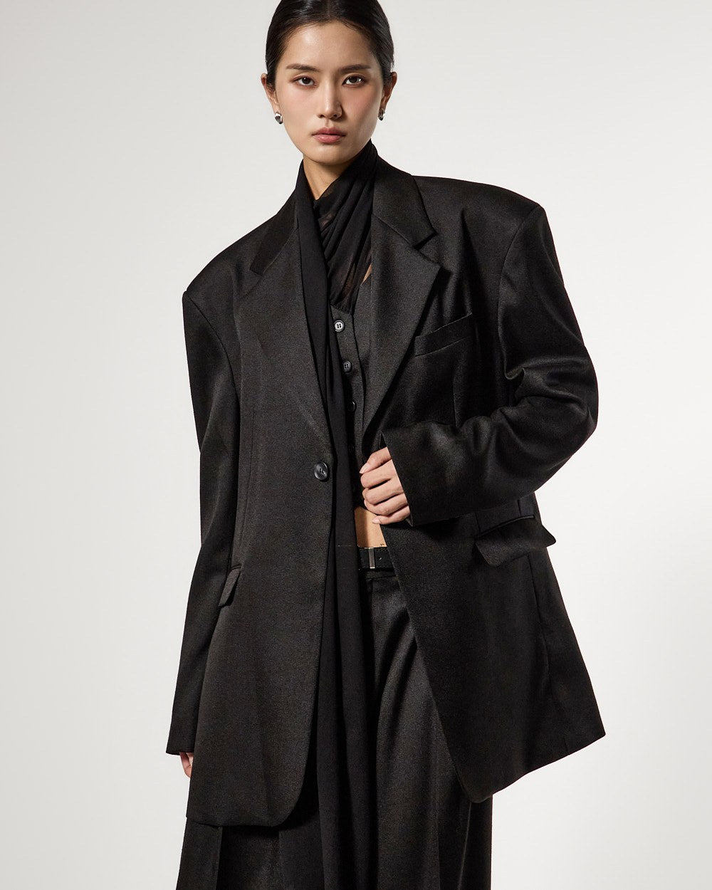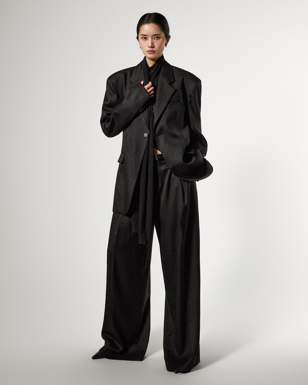 and creates a formal yet trendy mood with its relaxed oversized fit.