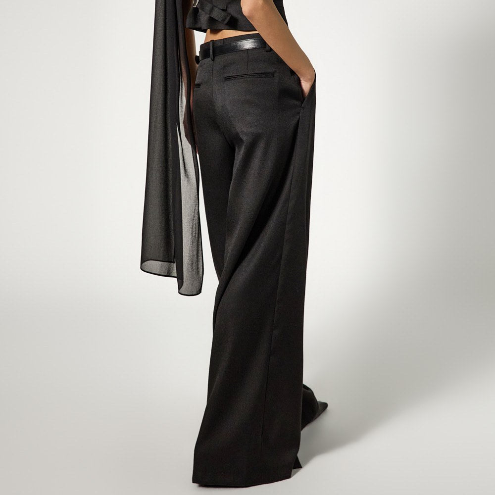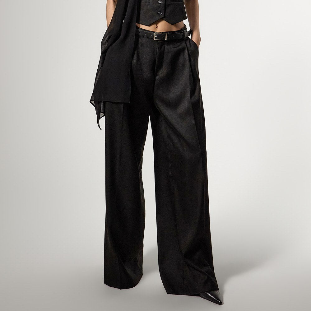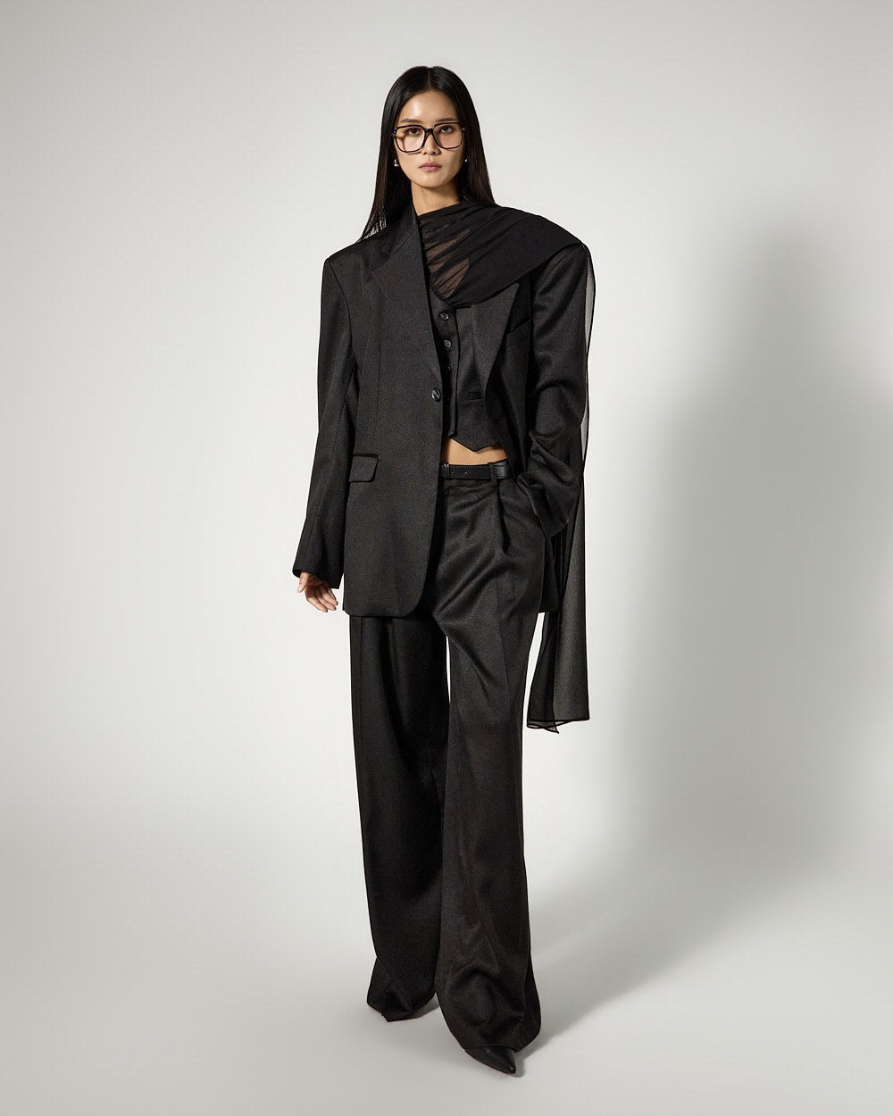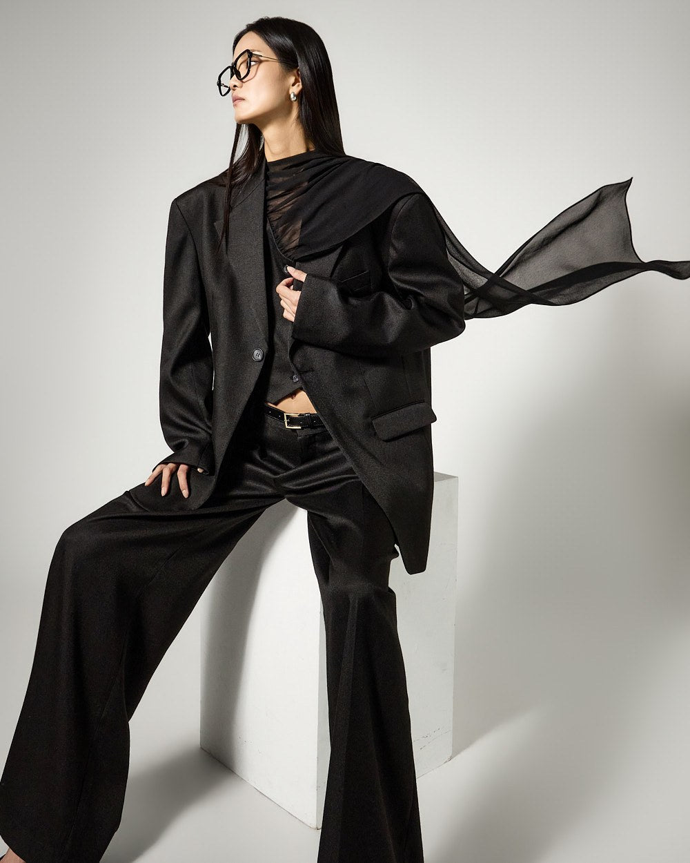 and creates a formal yet trendy mood with its relaxed oversized fit.