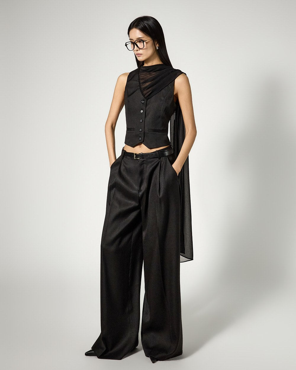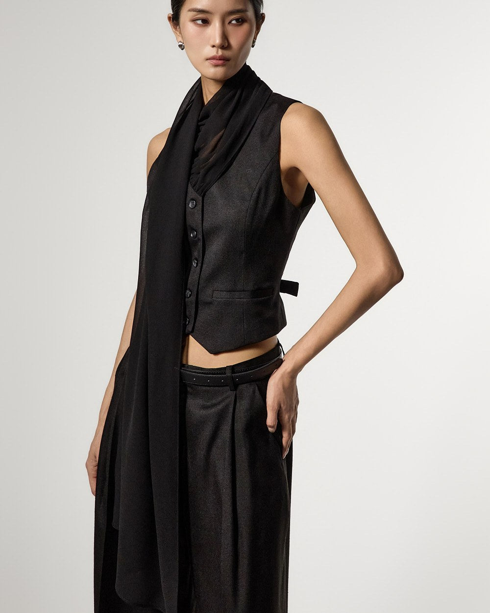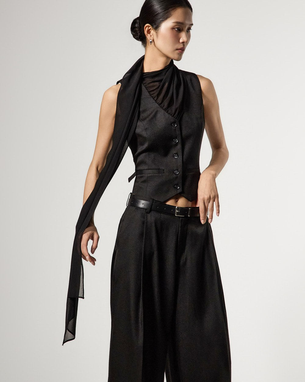 The vest emphasizes an elegant atmosphere with a slim fit and draped scarf details,