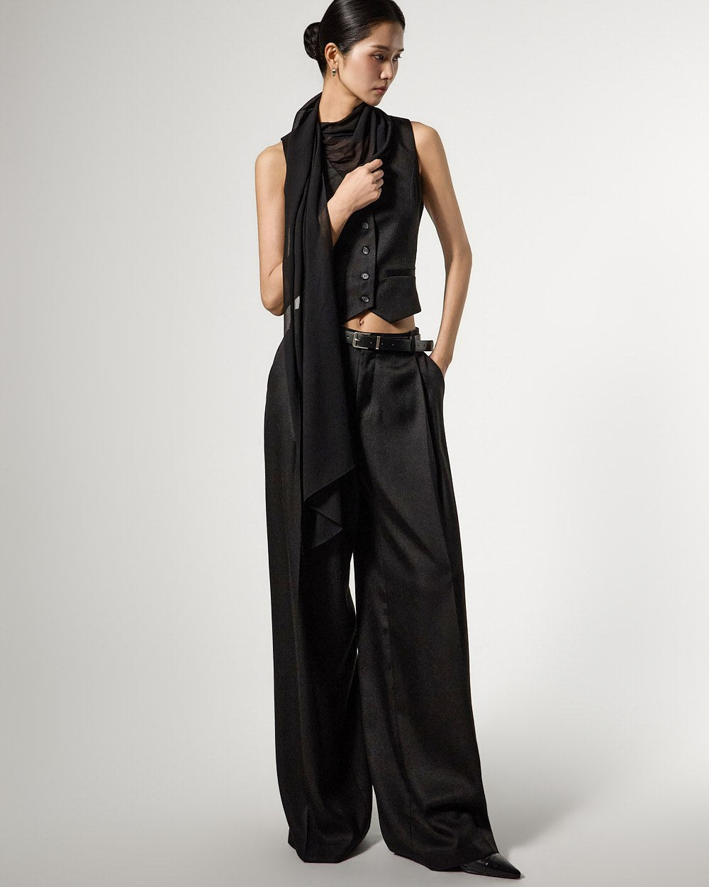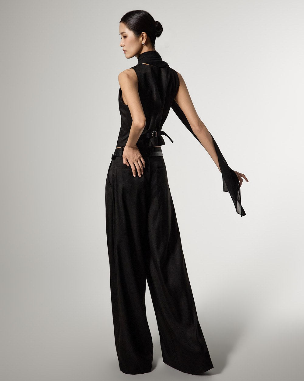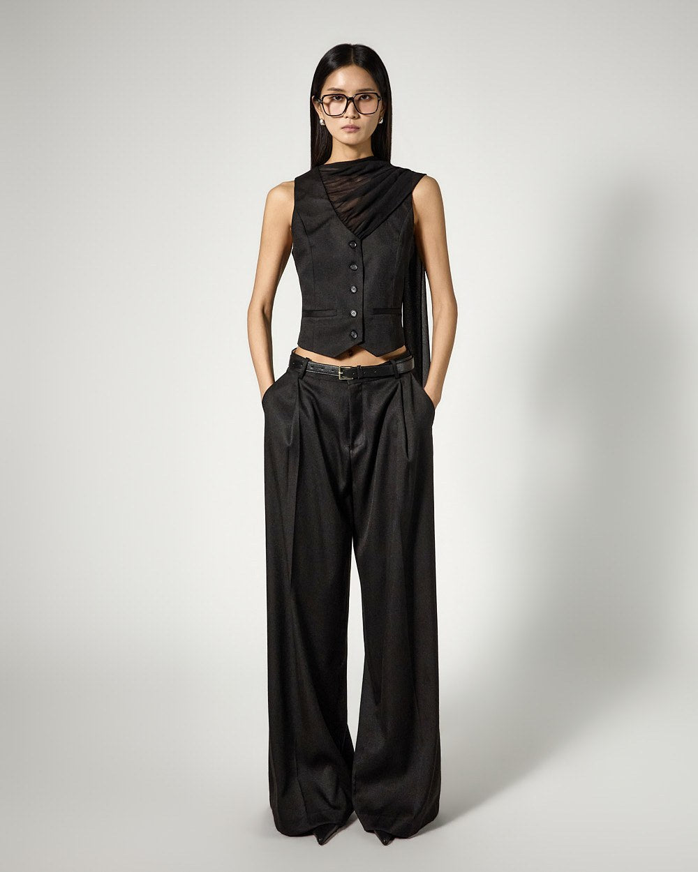 The vest emphasizes an elegant atmosphere with a slim fit and draped scarf details,