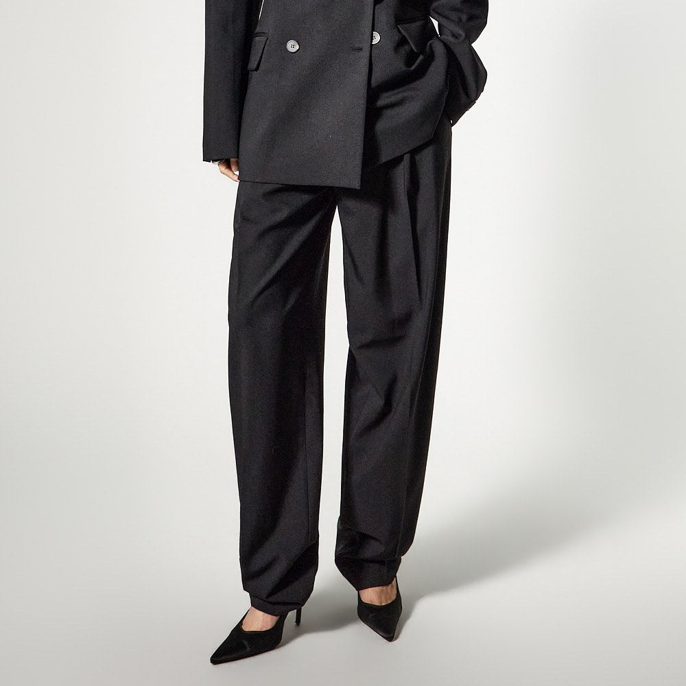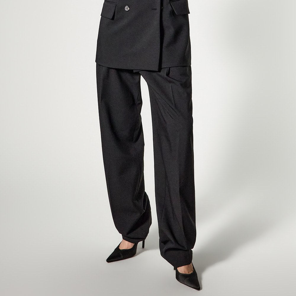 The pants feature a wide yet tapered silhouette,