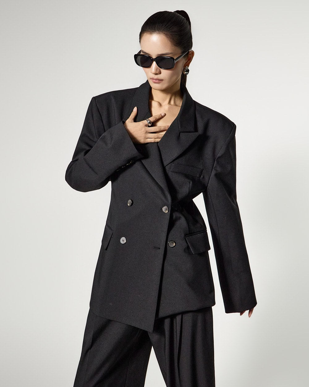 This is a jacket and pants set featuring a modern, chic mood.