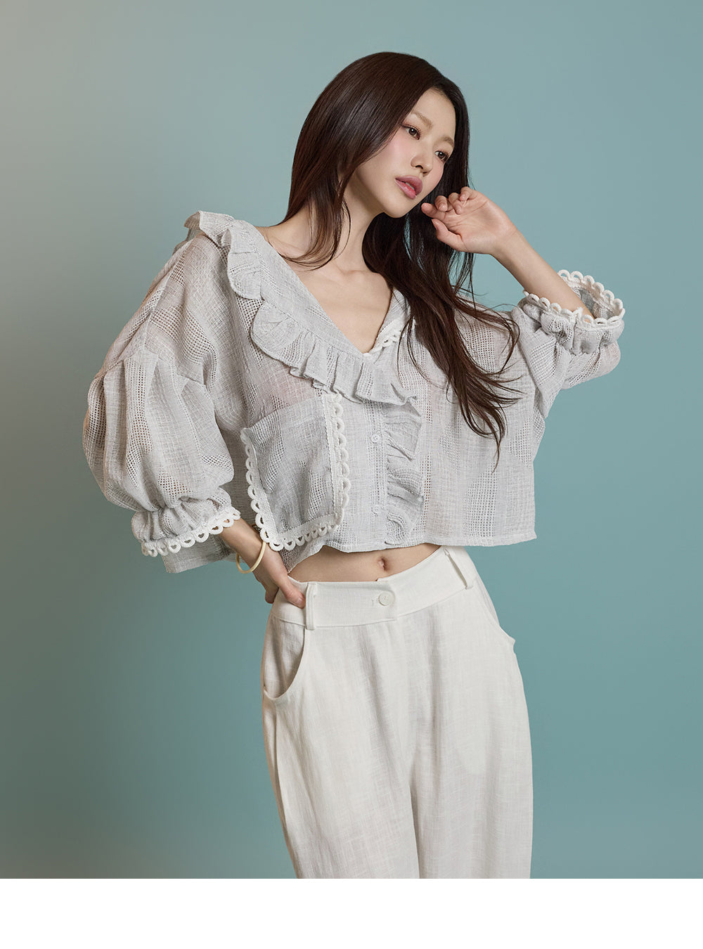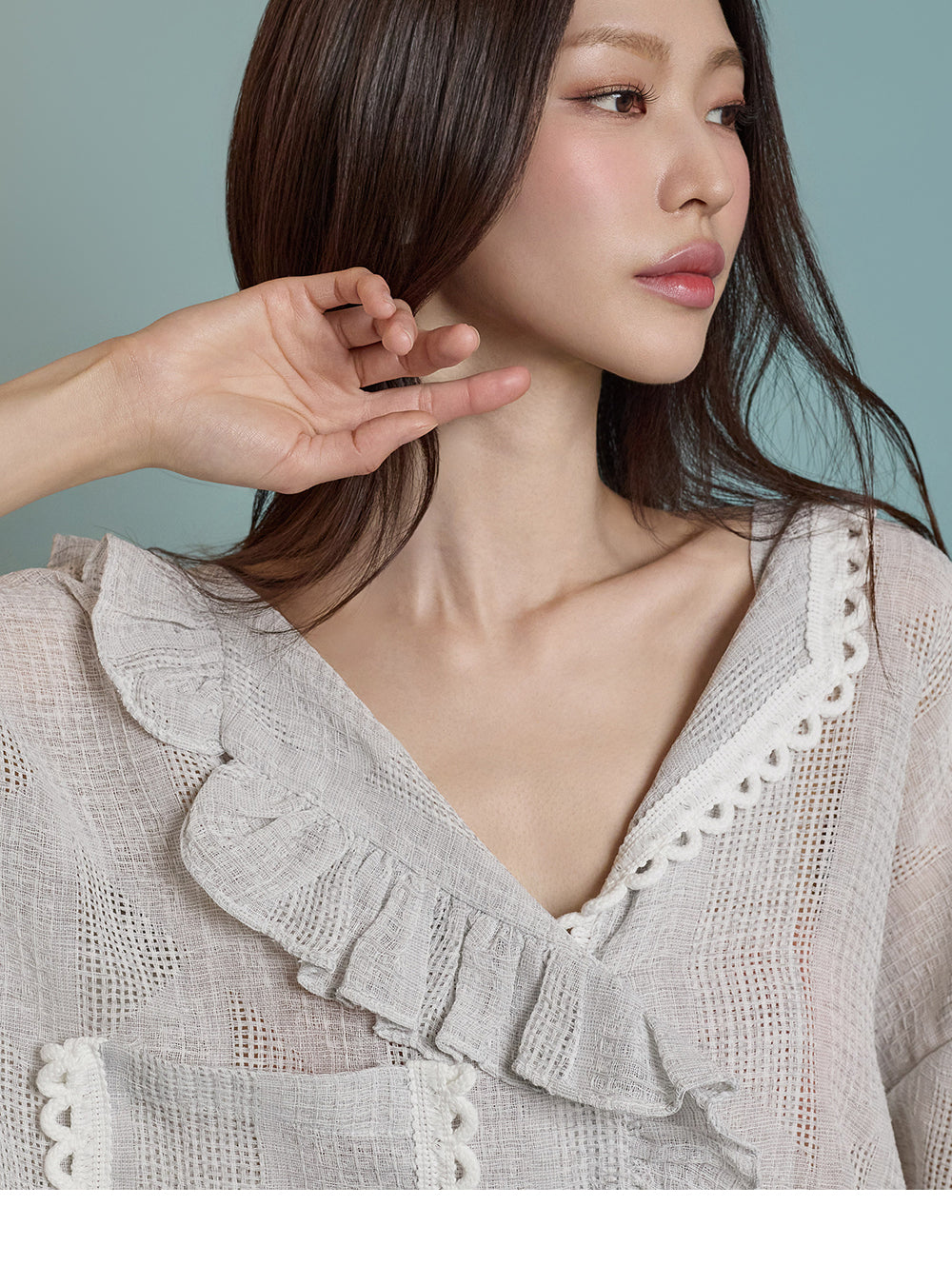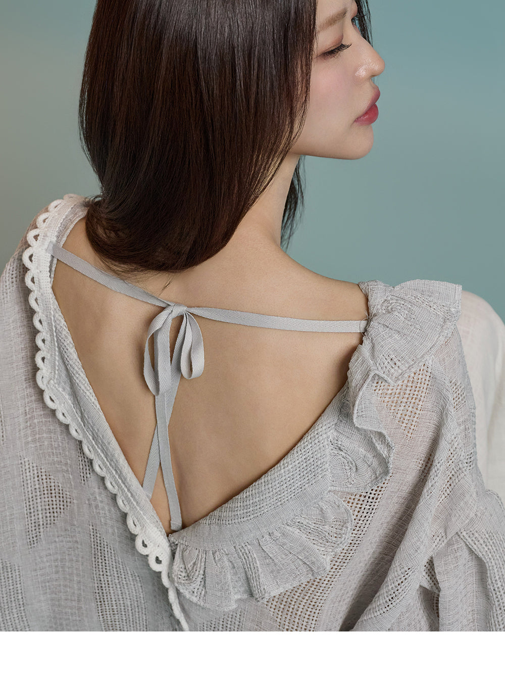 ネックラインのフリルディテールが可愛らしい印象を与えます。