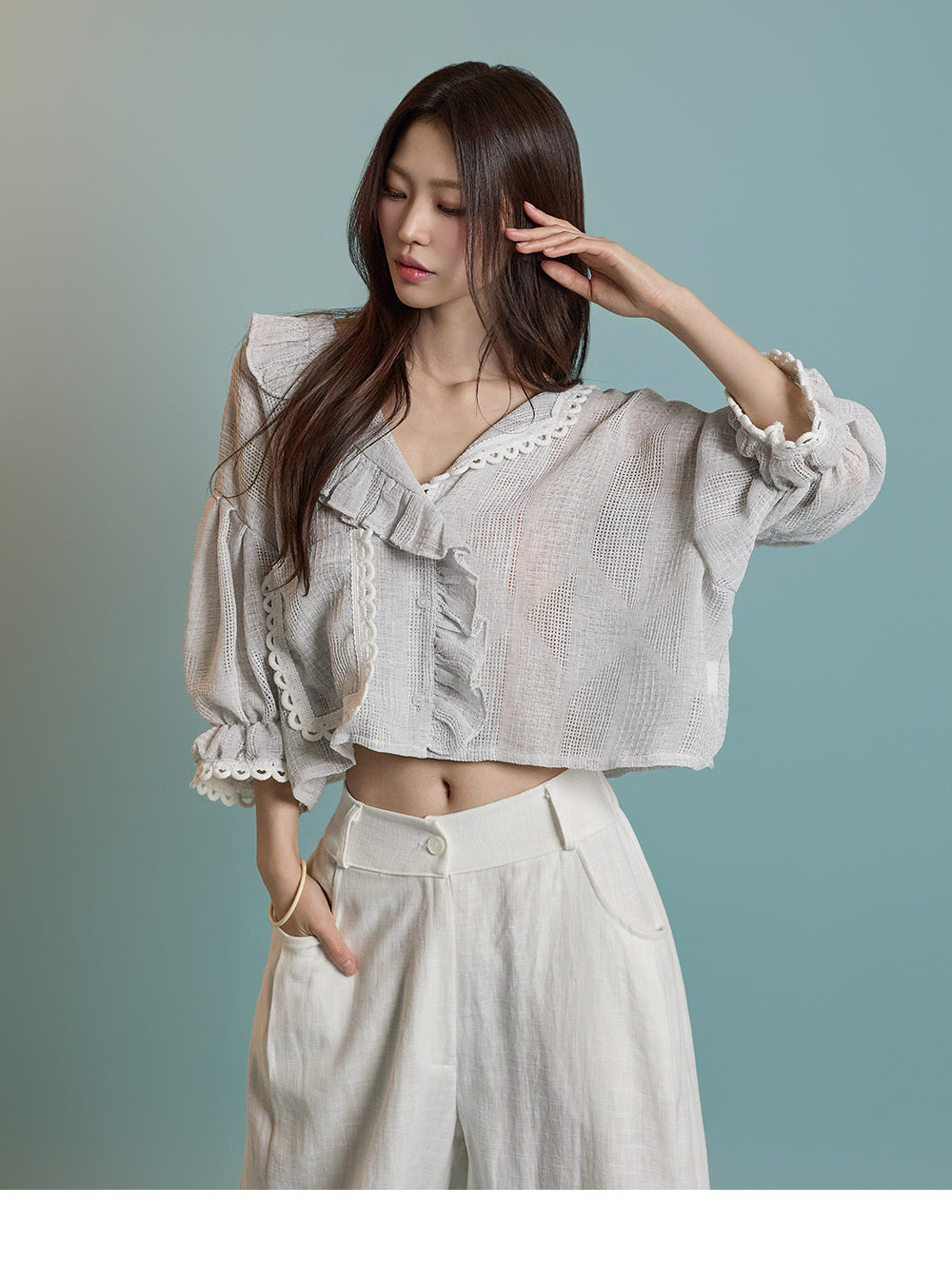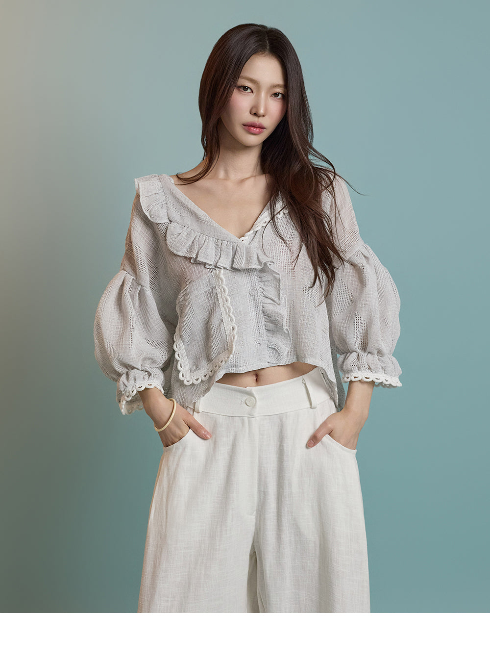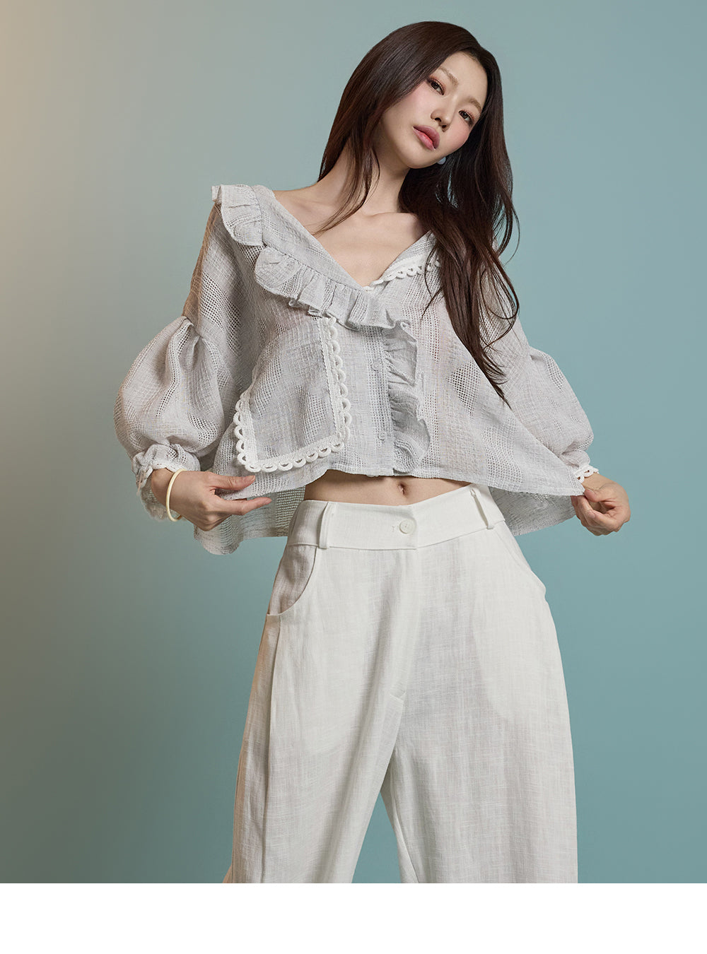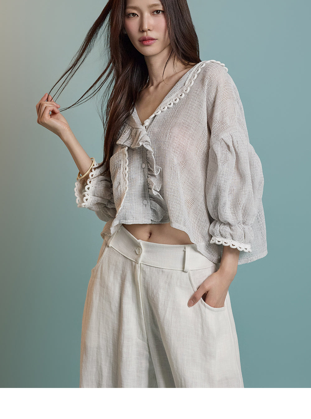 ネックラインのフリルディテールが可愛らしい印象を与えます。