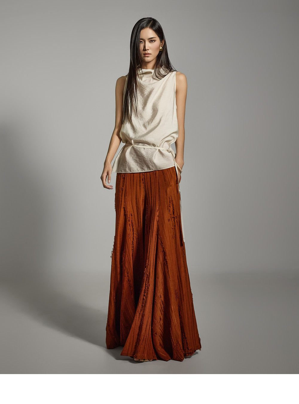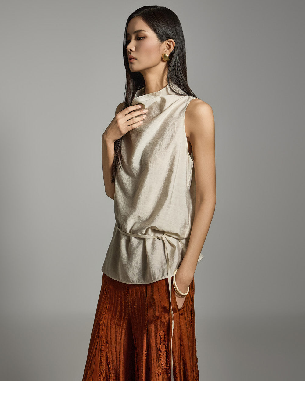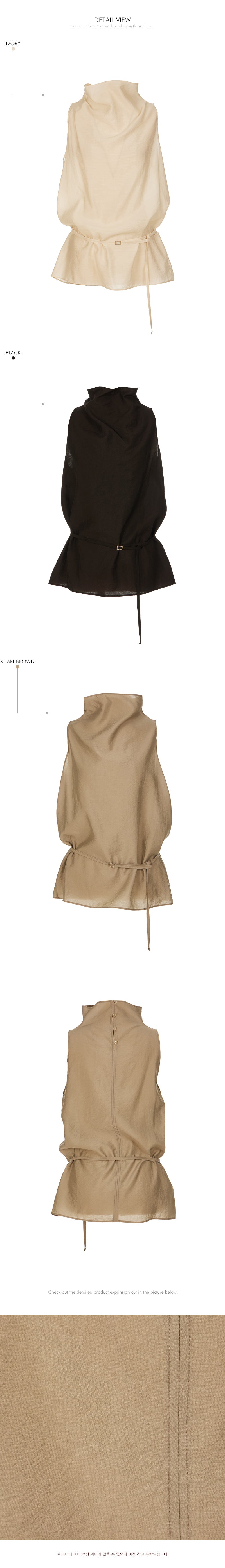 ノースリーブのデザインにシャーリングネックラインがアクセントとなり、さりげないアクセントになっています。