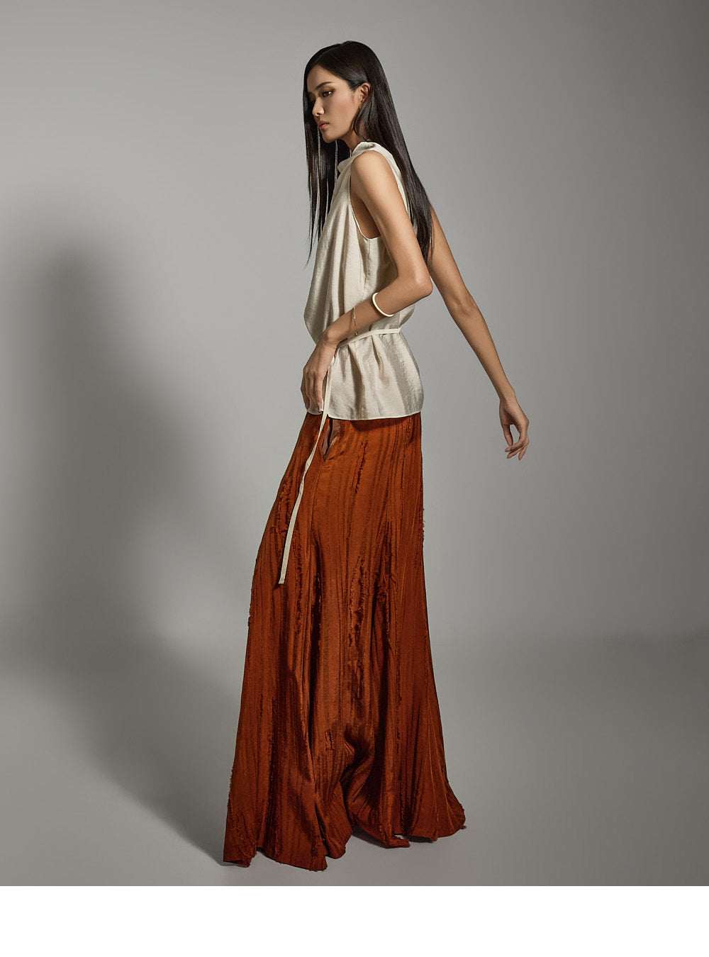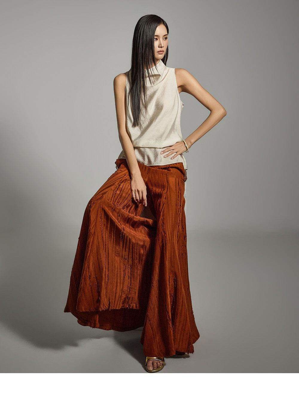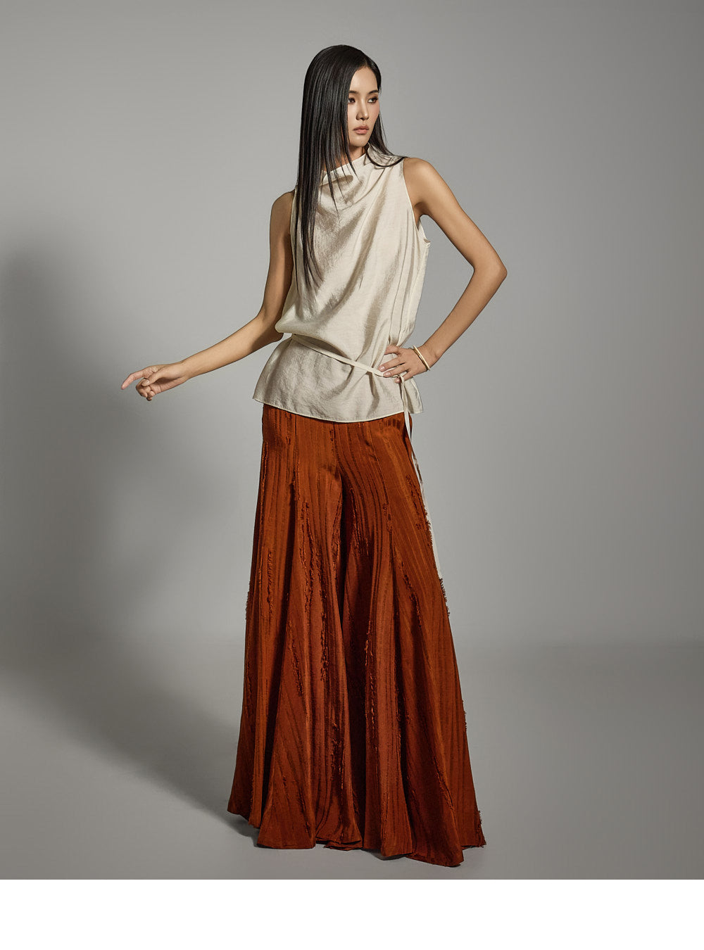 ノースリーブのデザインにシャーリングネックラインがアクセントとなり、さりげないアクセントになっています。