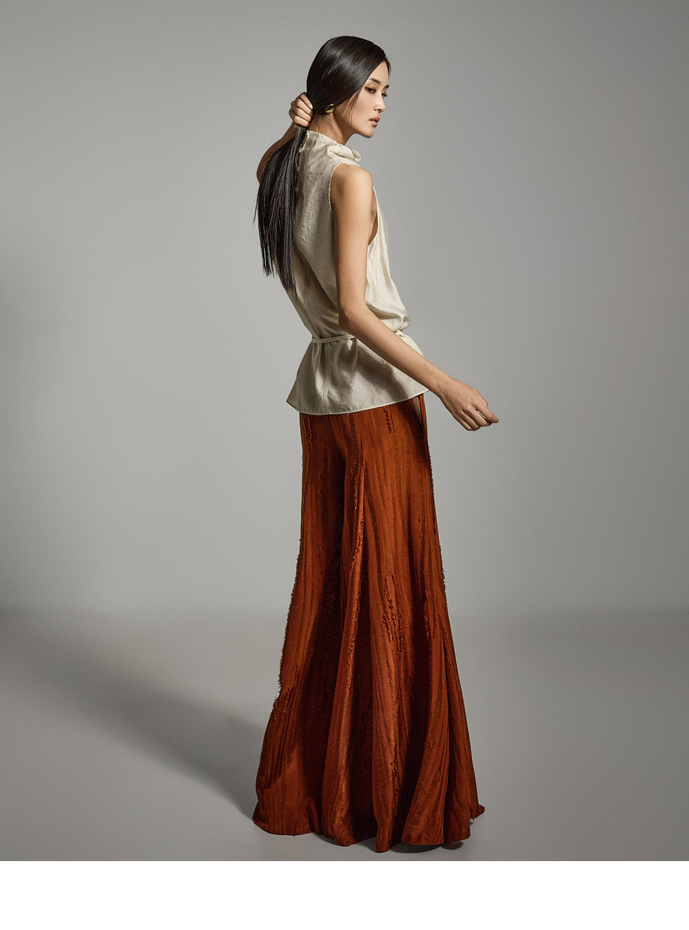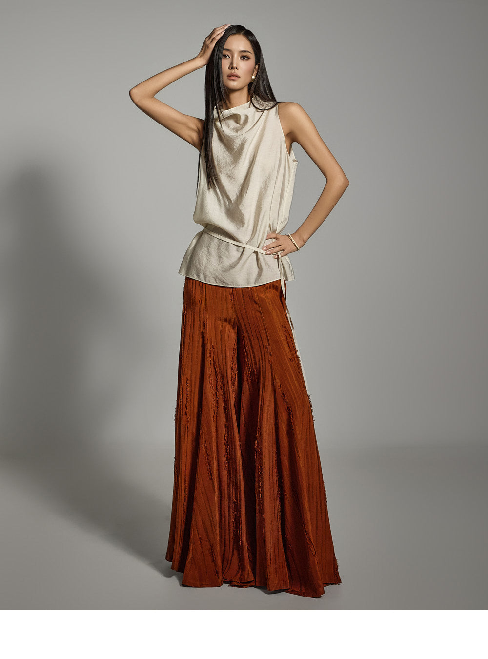 このブラウスは洗練されたモダンな印象を与えます。